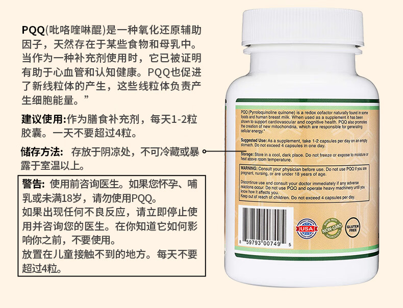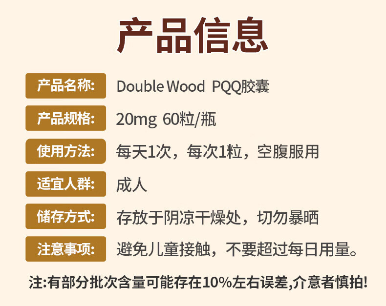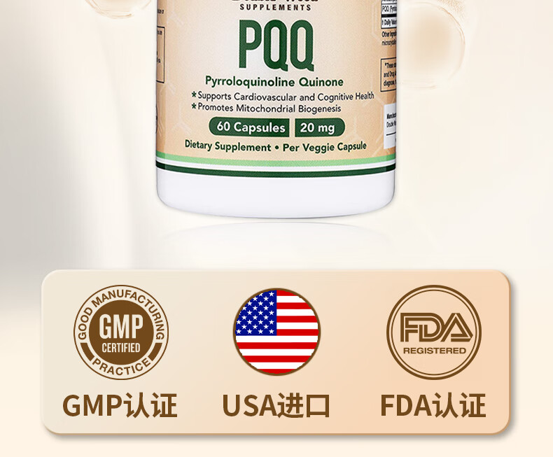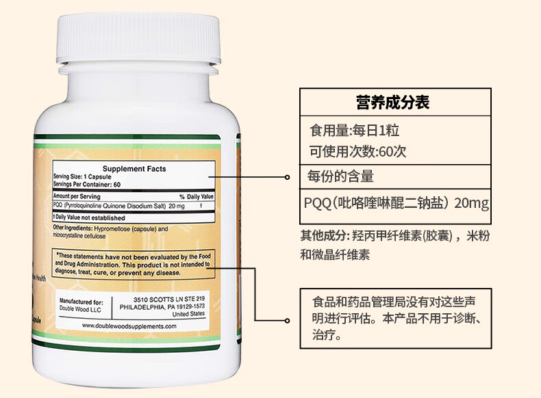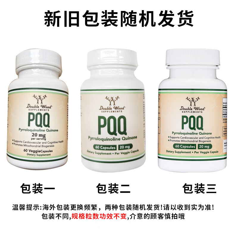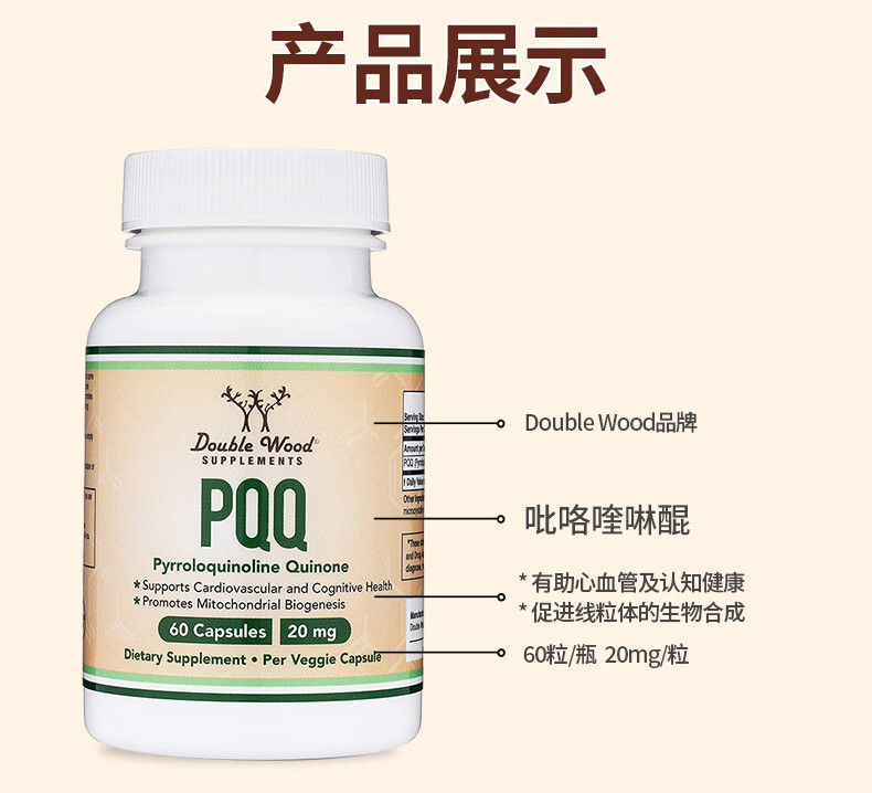 DOUBLE WOOD SUPPLEMENTS美国PQQ线粒体脑活素补吡咯喹啉醌强优化剂成人青少年调节免疫