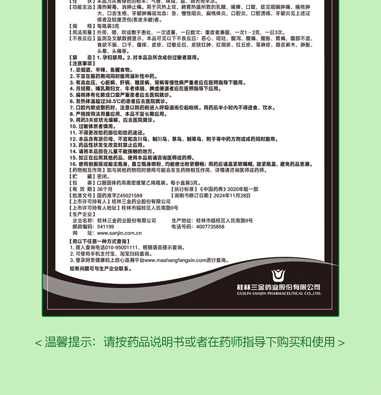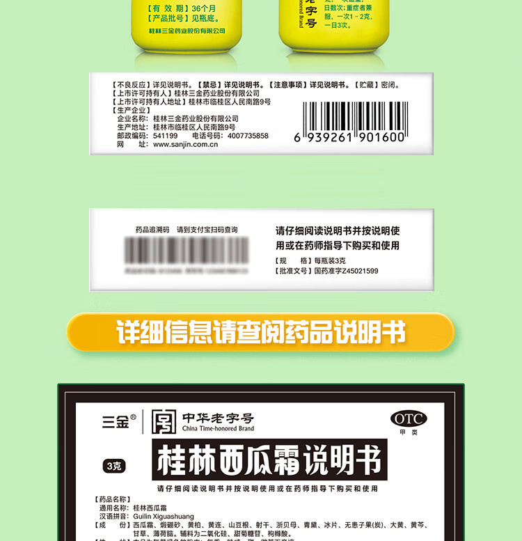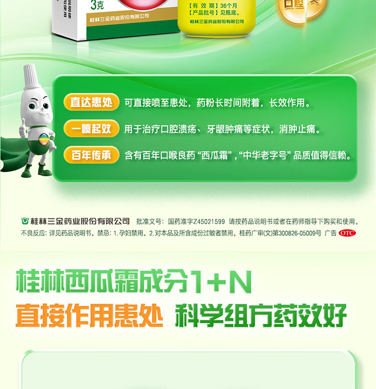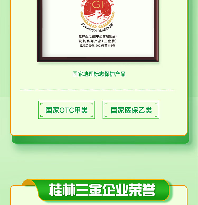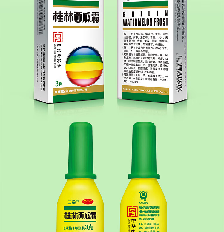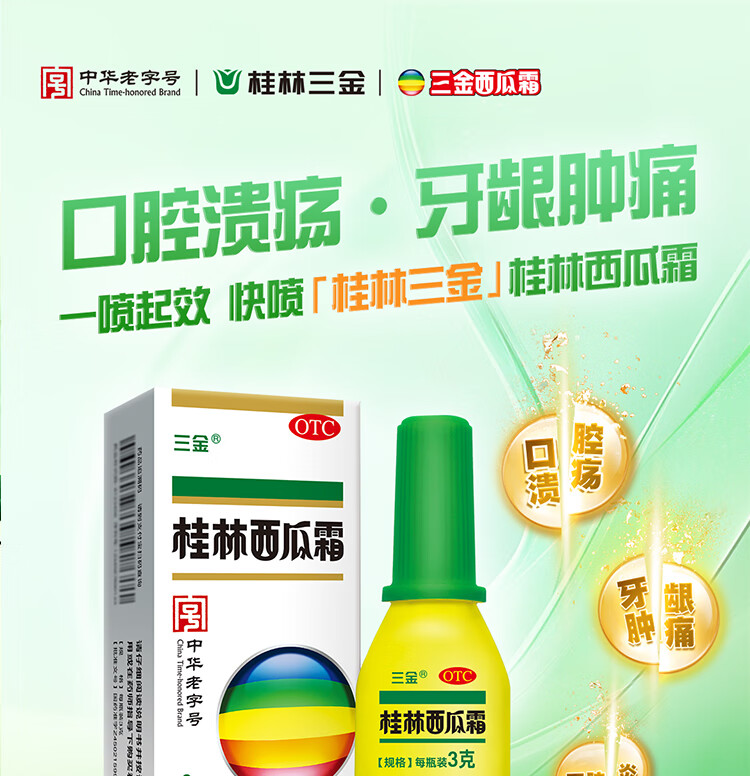 三金桂林西瓜霜 3g/盒口腔溃疡、咽喉肿痛、口舌生疮、牙龈肿痛或出血,清热解毒,消肿止痛