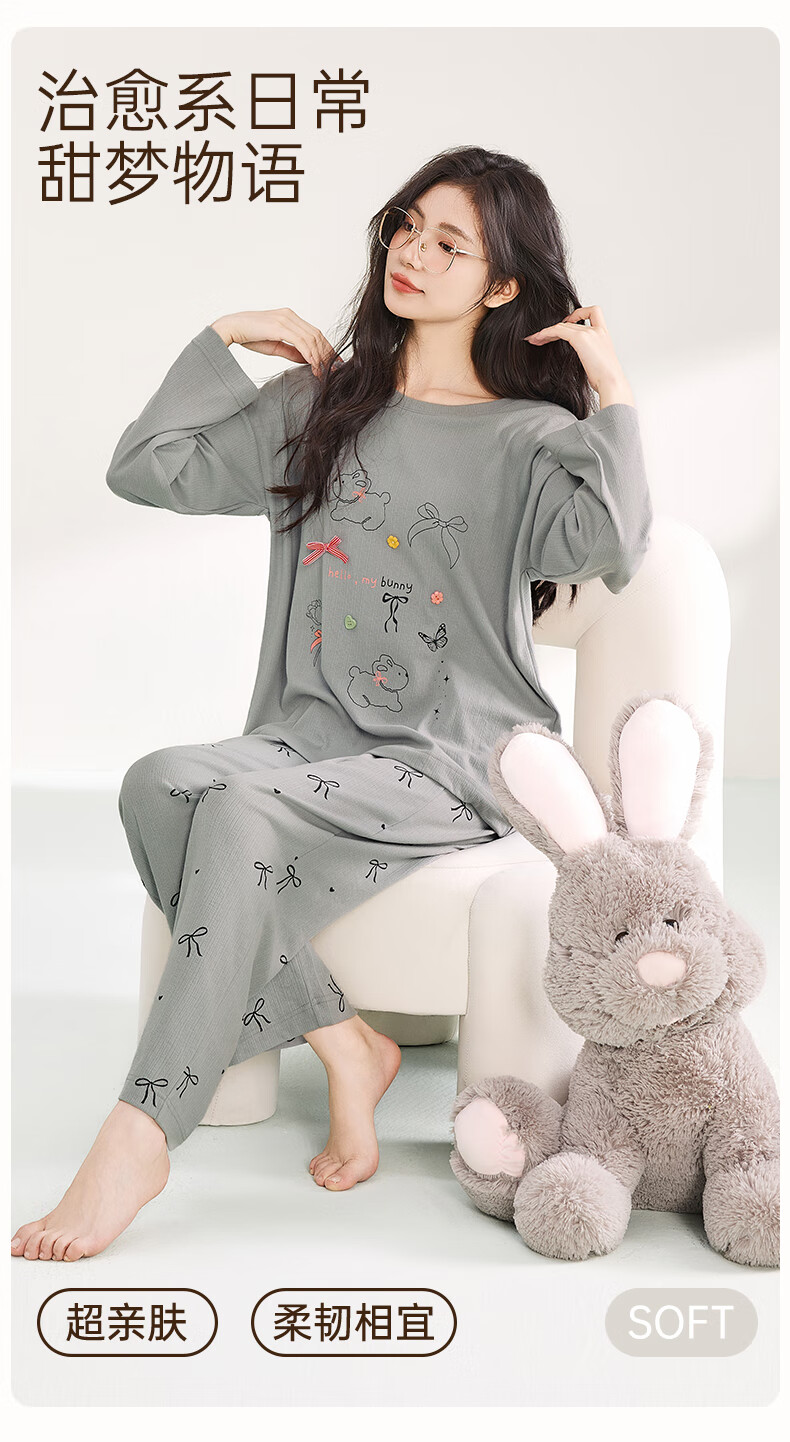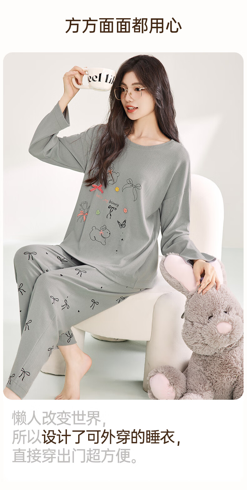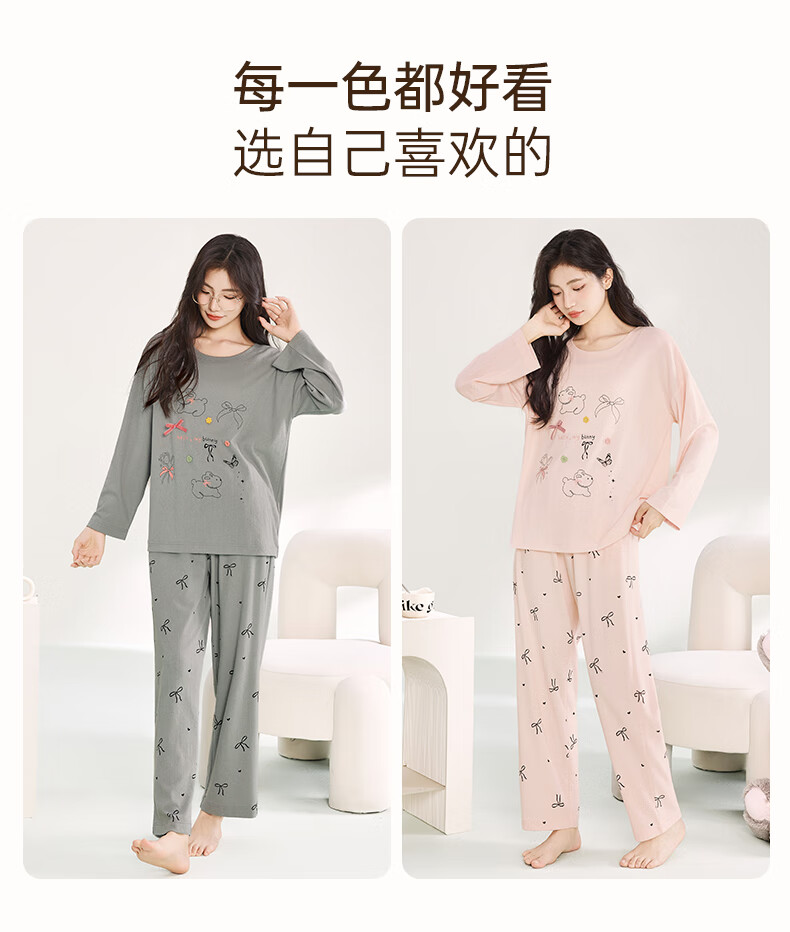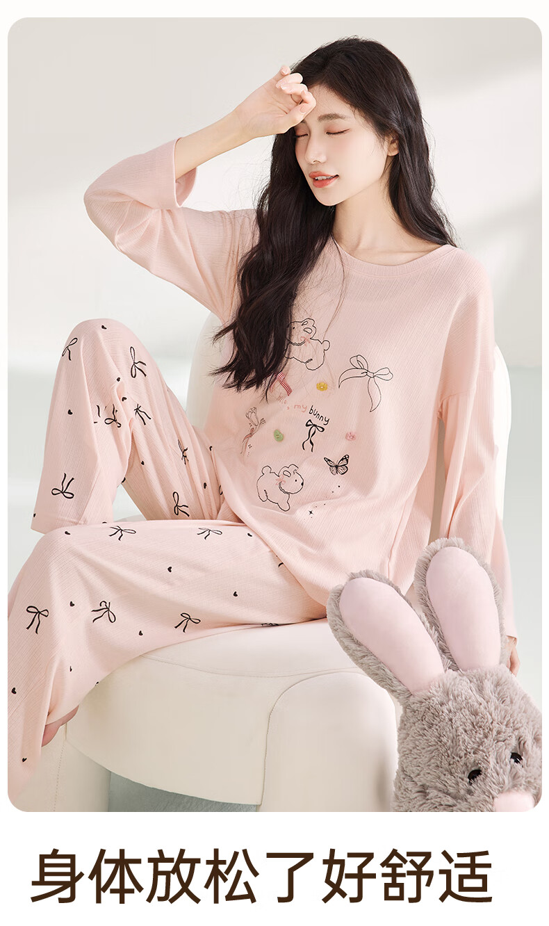 玛伦萨睡衣女春秋季2025新款可外穿舒适棉质长袖长裤大码女士家居服 樱花粉 M