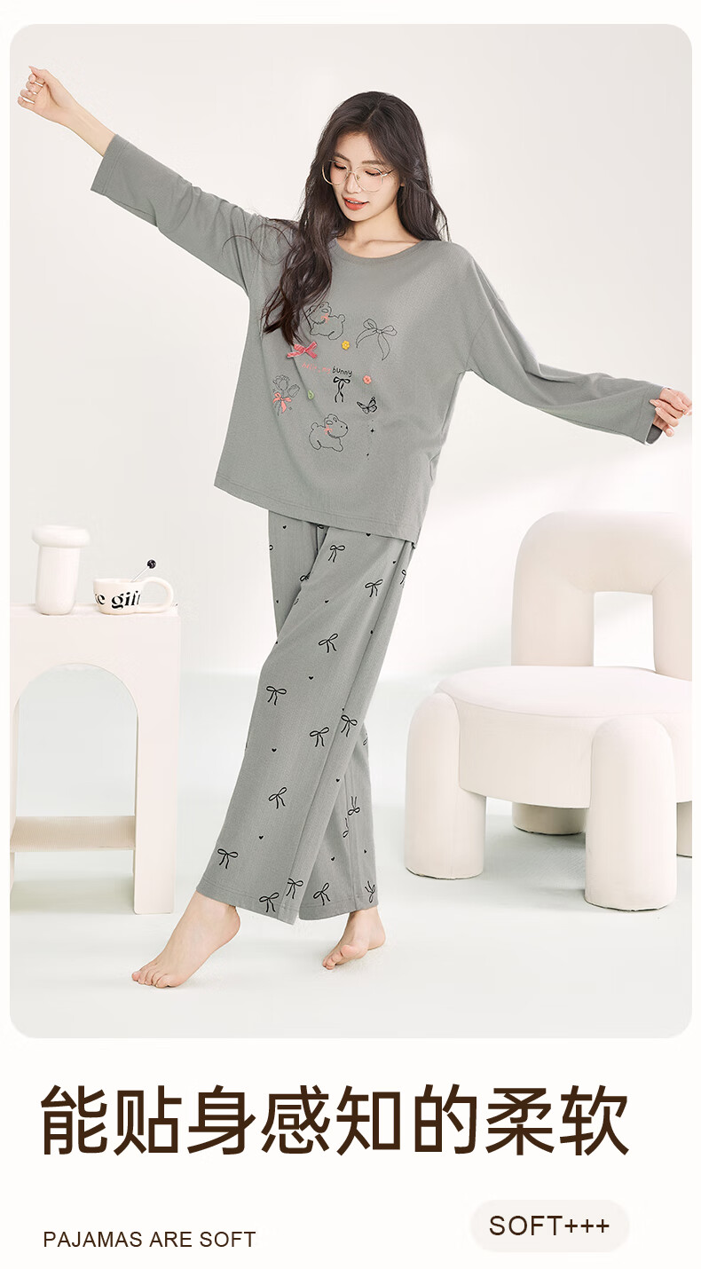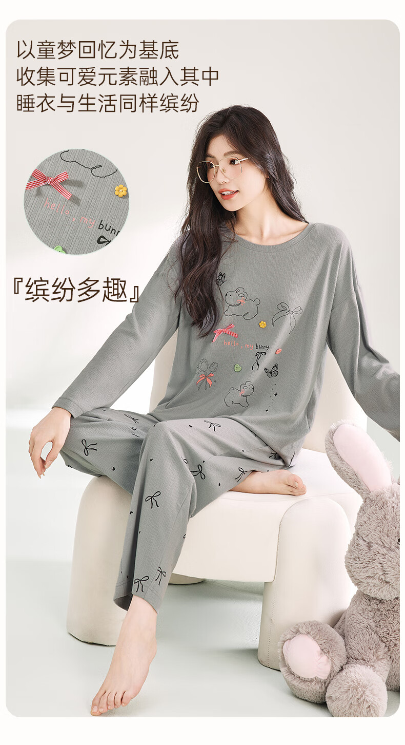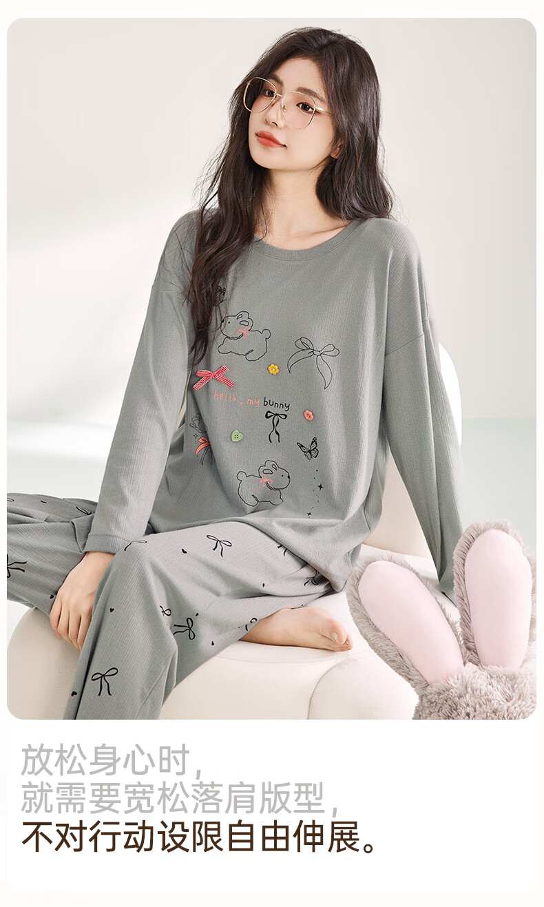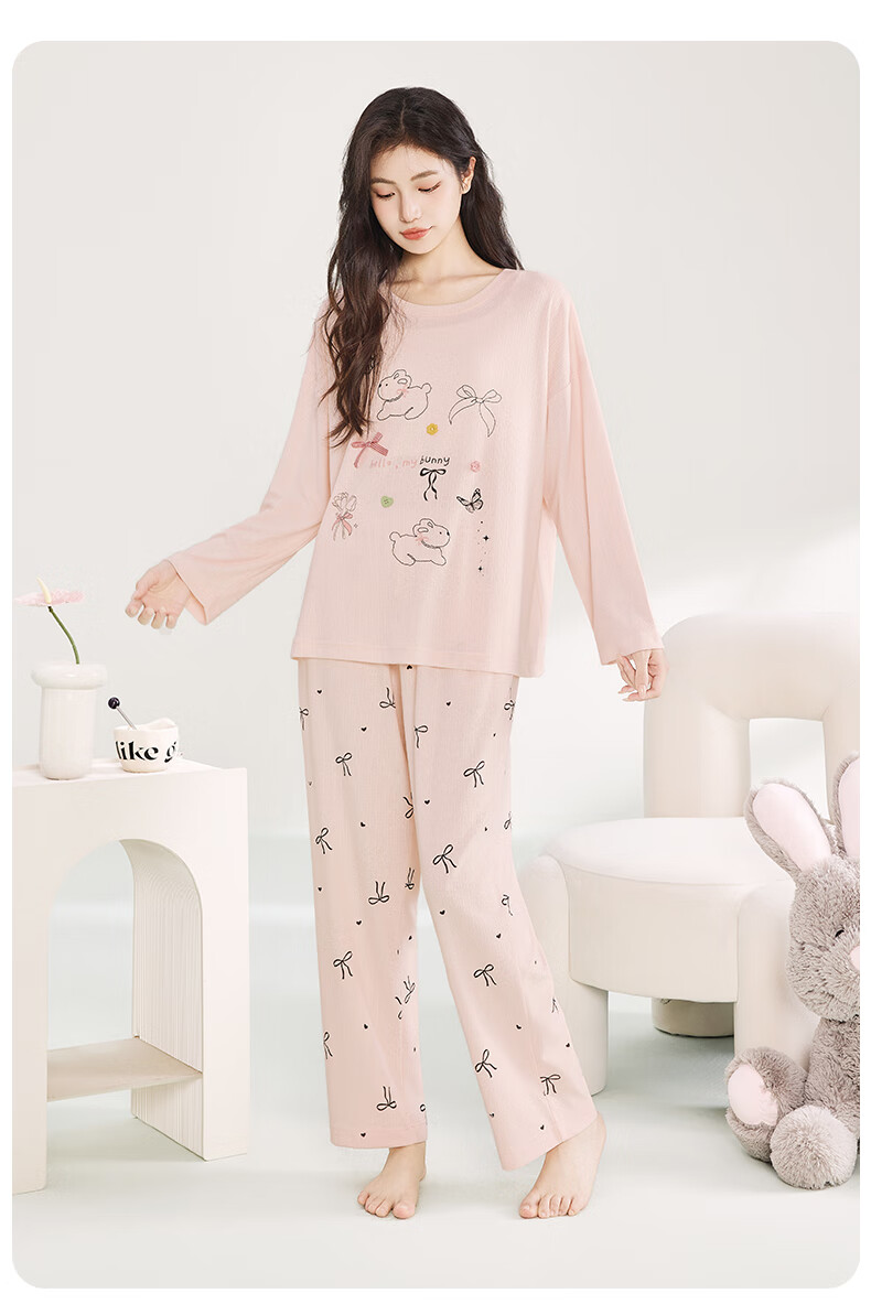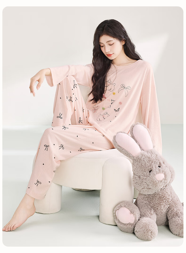 玛伦萨睡衣女春秋季2025新款可外穿舒适棉质长袖长裤大码女士家居服 樱花粉 M