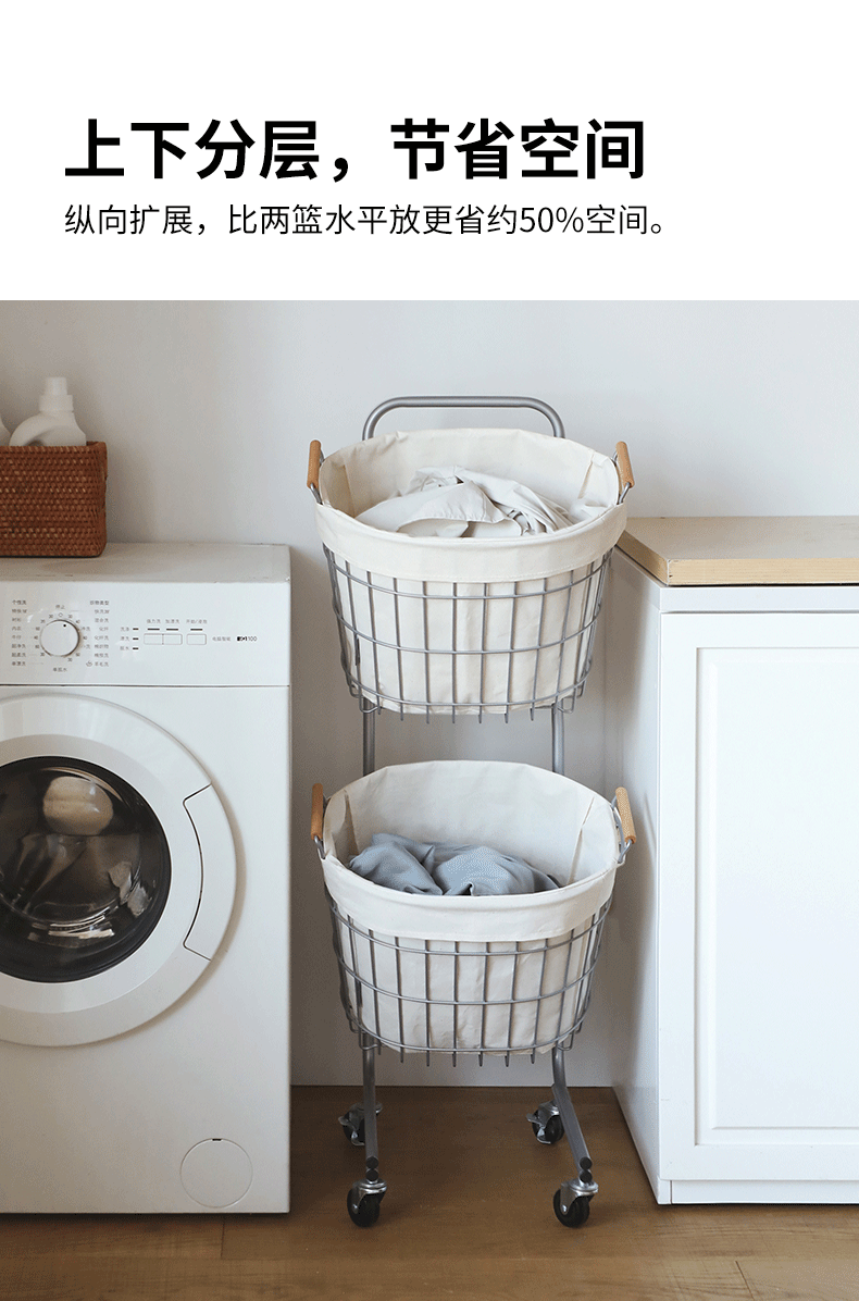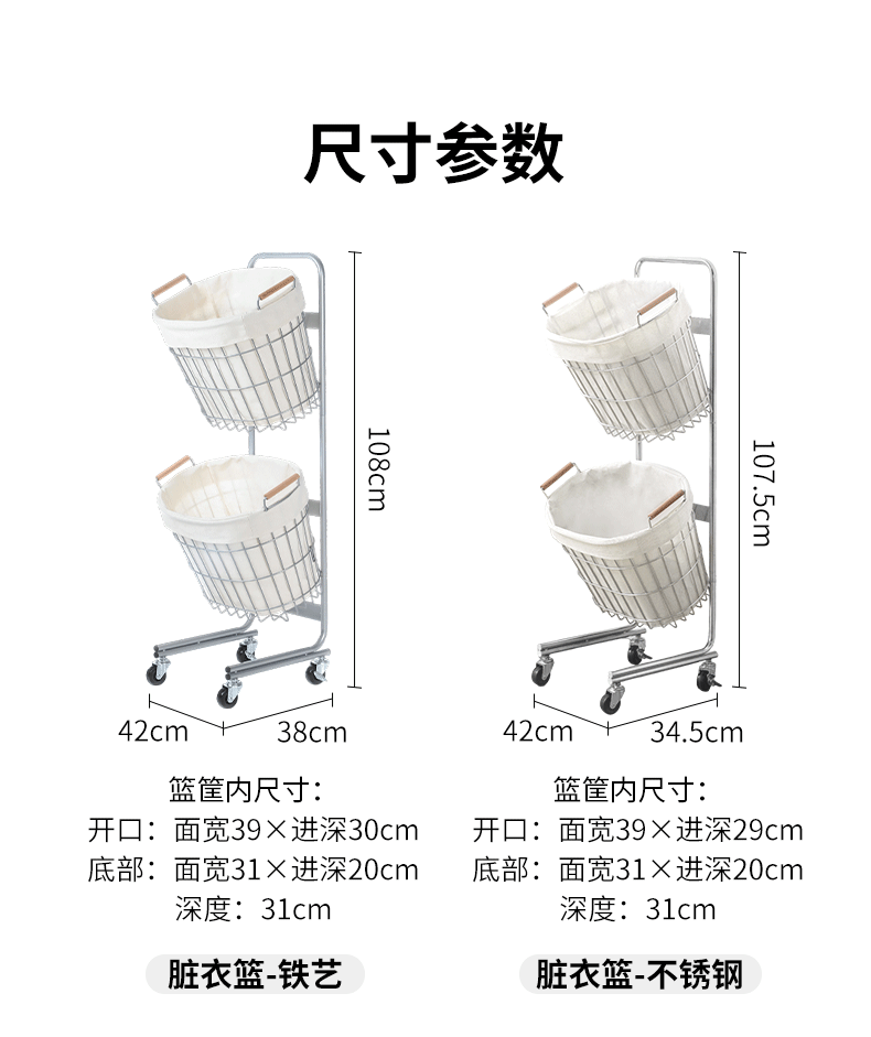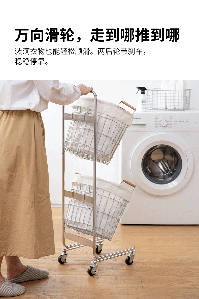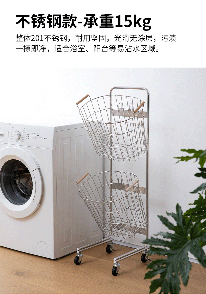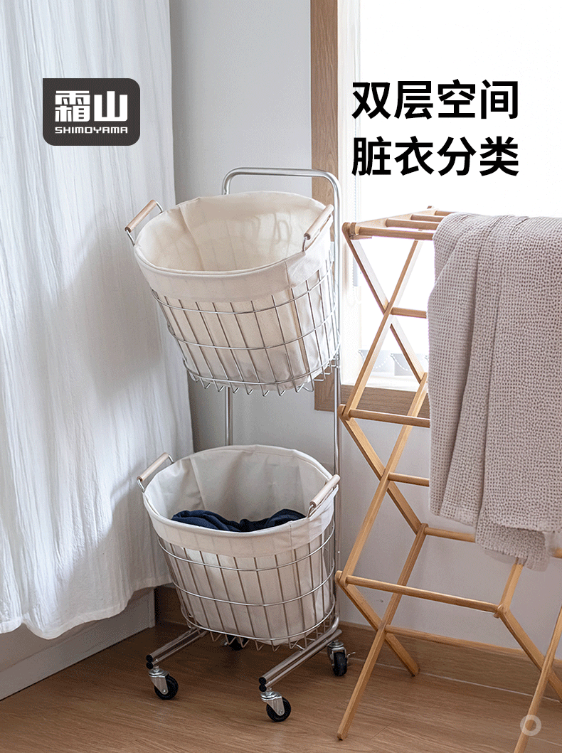霜山双层脏衣篮家用移动大容量脏衣篓分类收纳筐卫生间洗衣小推车 【不锈钢】面宽42*进深34.5*高107.5cm