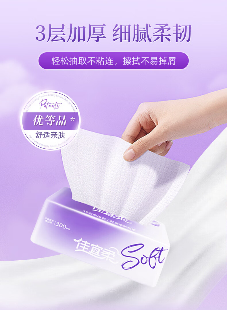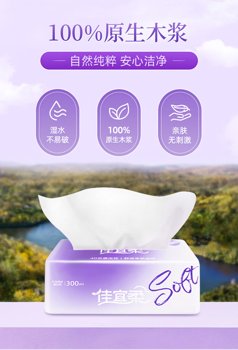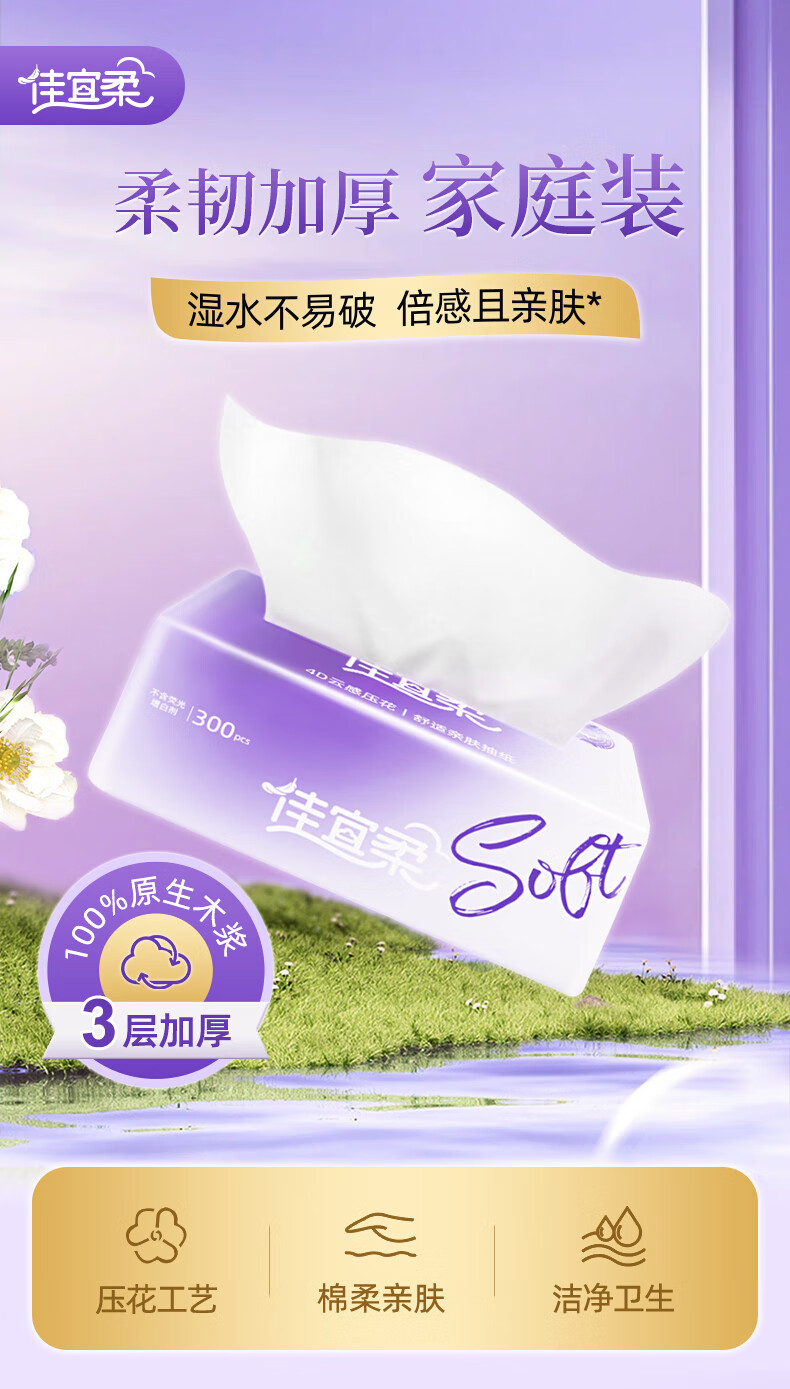 佳宜柔抽纸3层100抽*6包柔韧棉感100%原生木浆家用纸巾卫生纸餐巾双十一