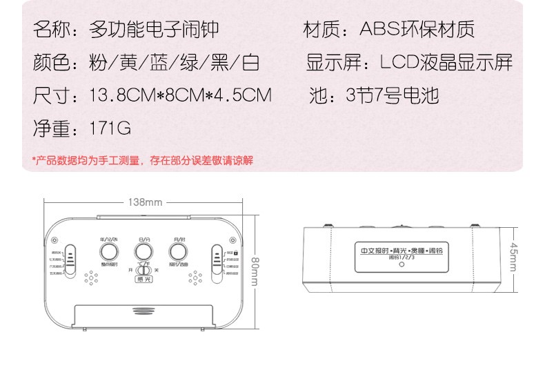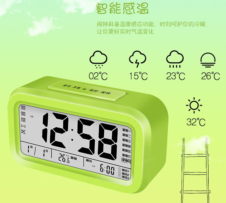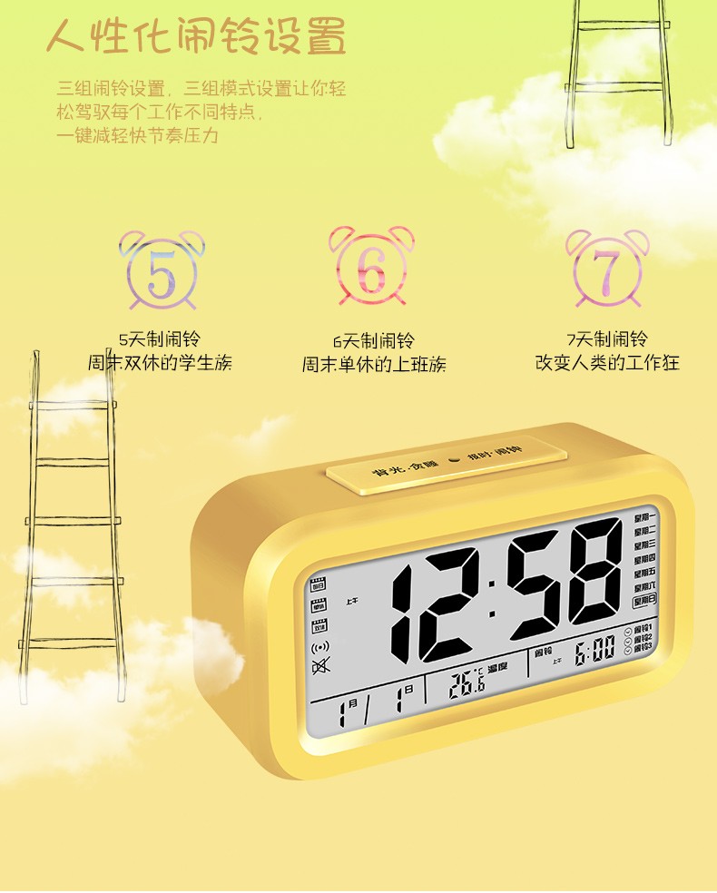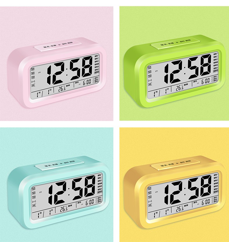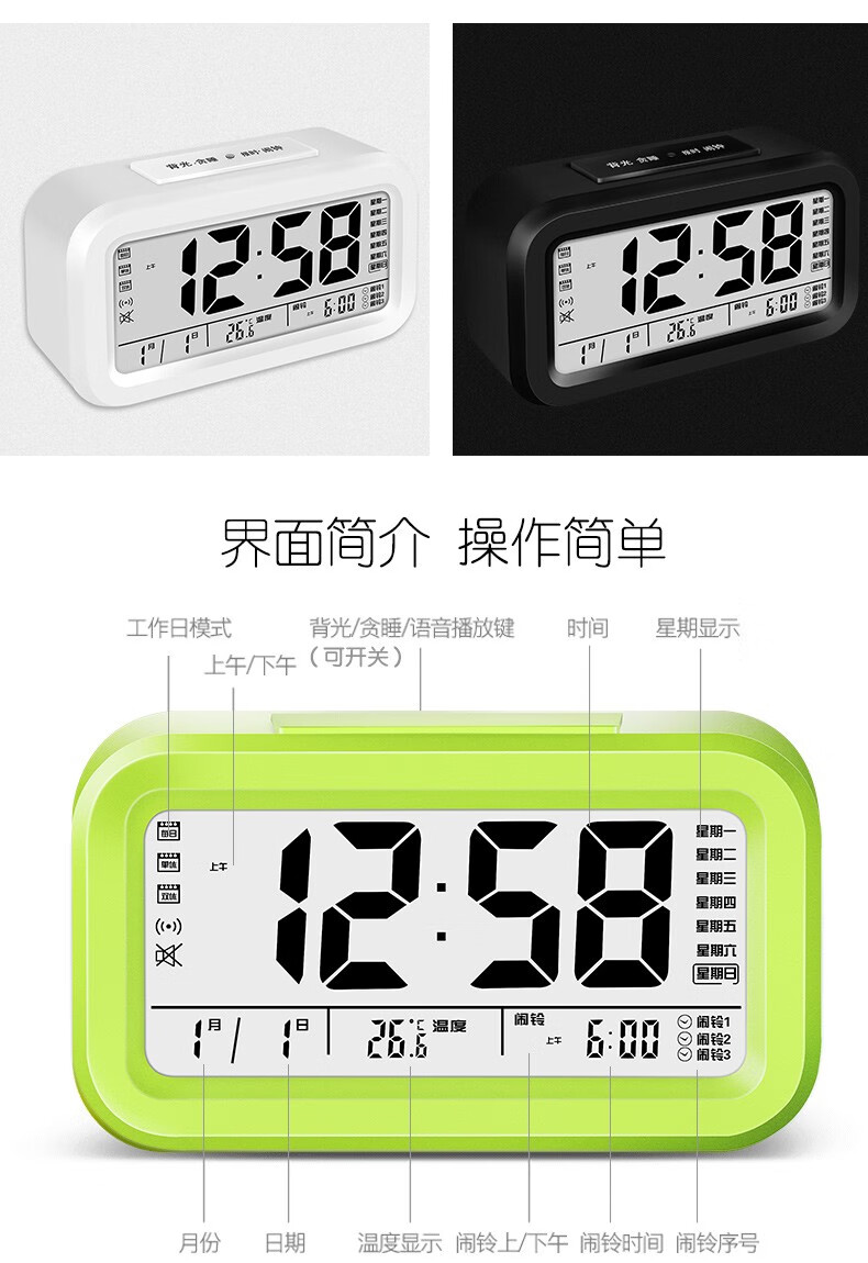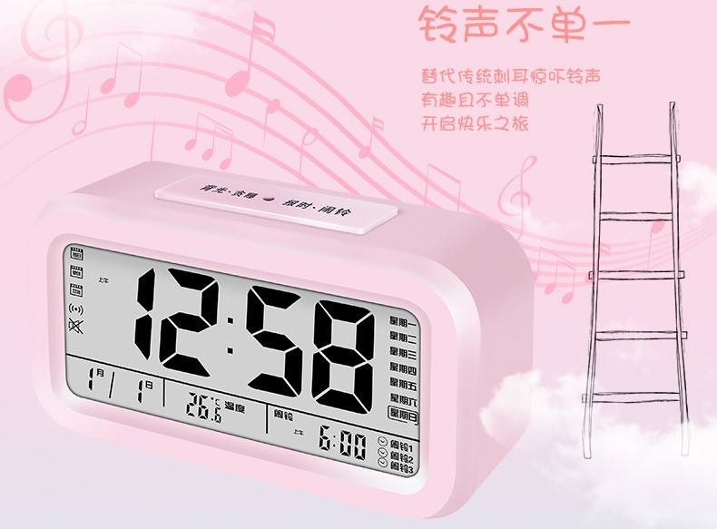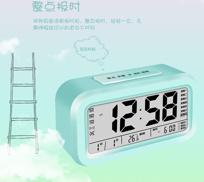 Timess 闹钟智能电子静音夜光聪明灯自动感光贪睡三组闹铃学生儿童语音报时音乐小闹钟 519-B