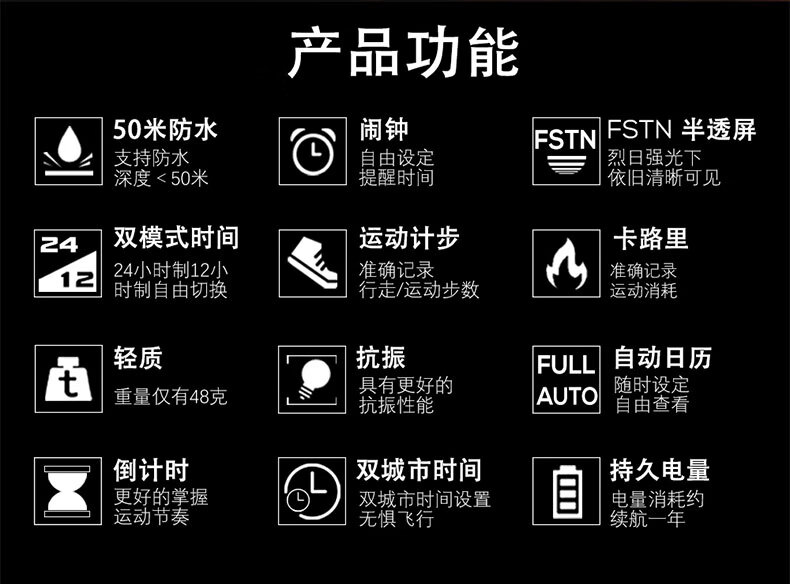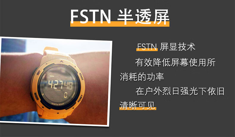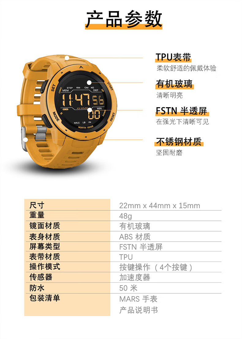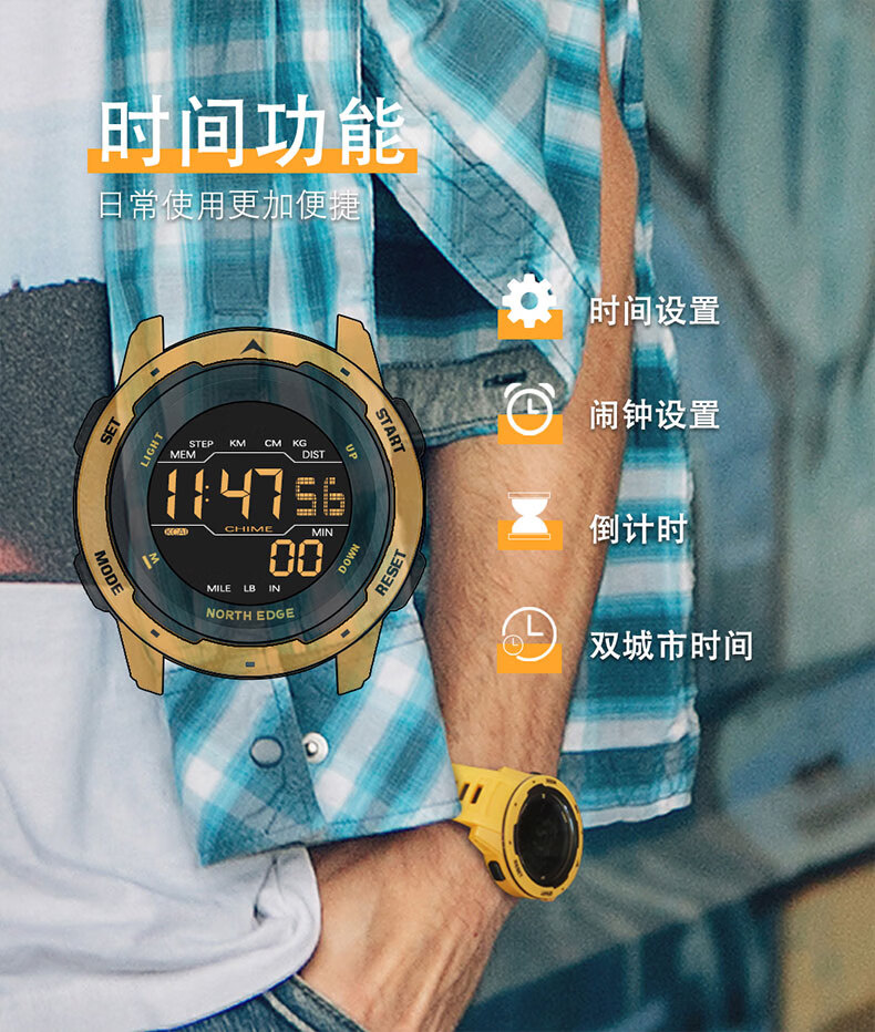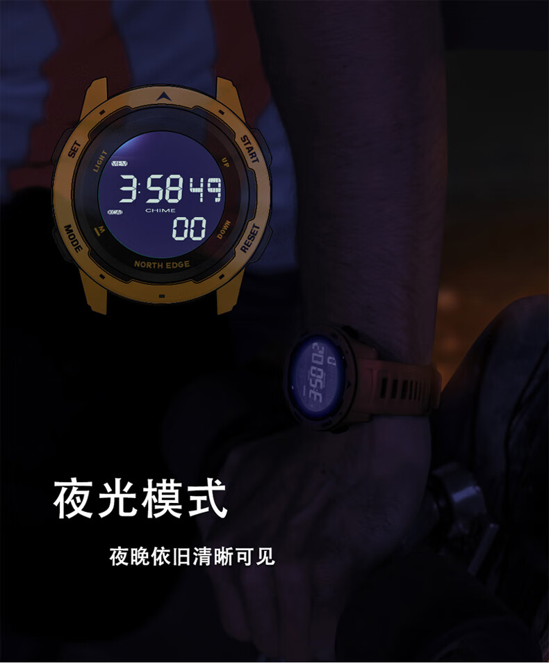 NORTH EDGE学生军事风电子手表男士运动闹钟计步距离卡路里50米防水当兵训练