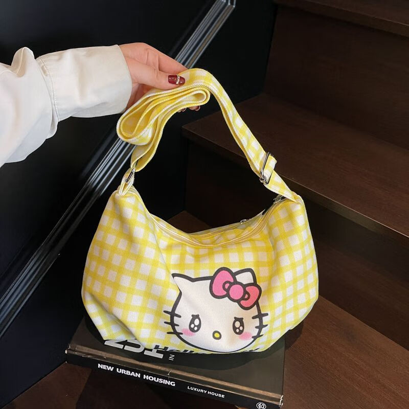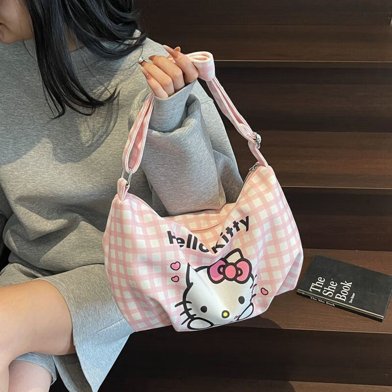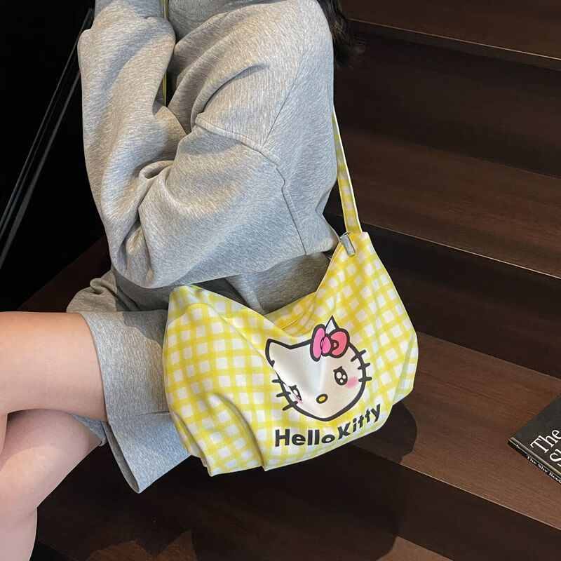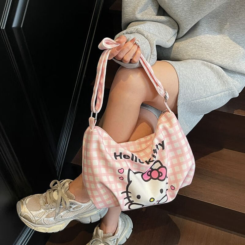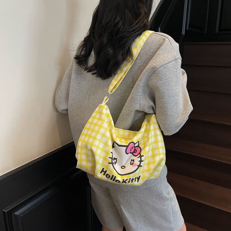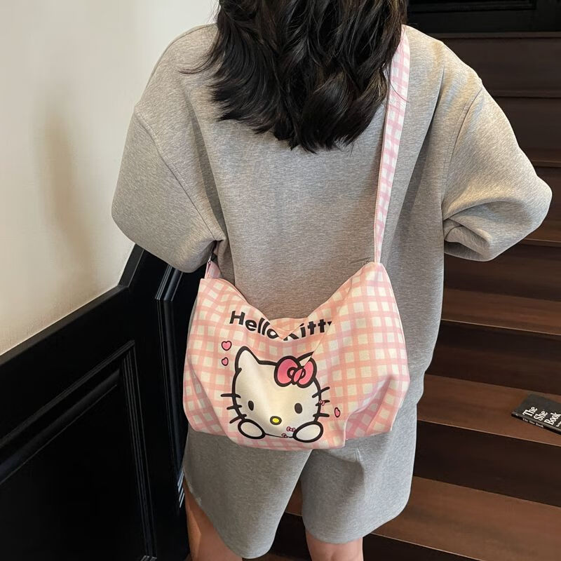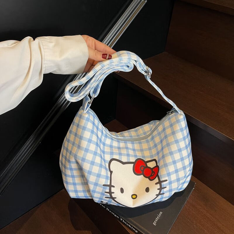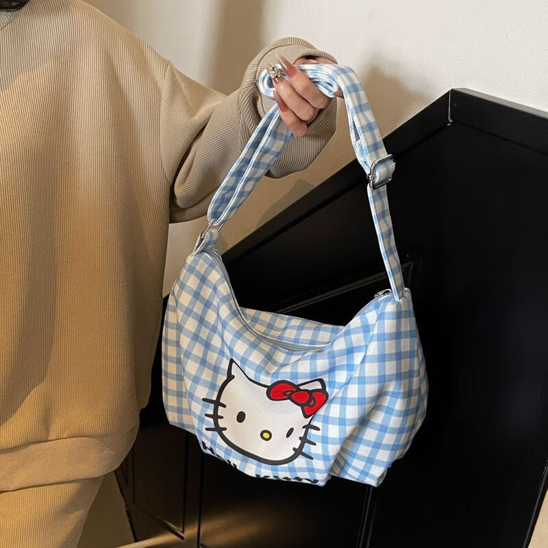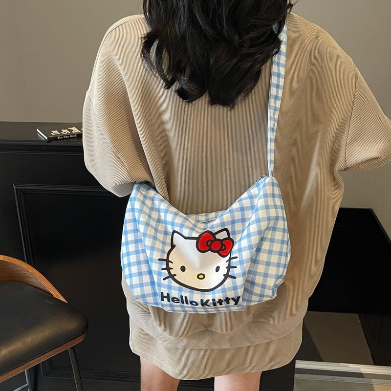 夏季新款百搭可爱KT布袋单肩通勤大容量清新格子凯蒂猫卡通斜挎包 蓝色