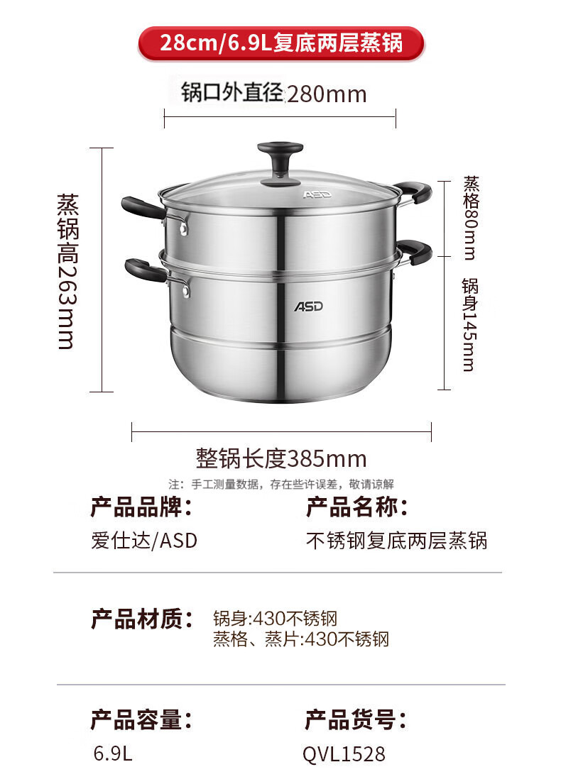 爱仕达(ASD)蒸锅双层不锈钢蒸锅 家用炖蒸煮一体汤锅 28CM大容量蒸笼QVL1528
