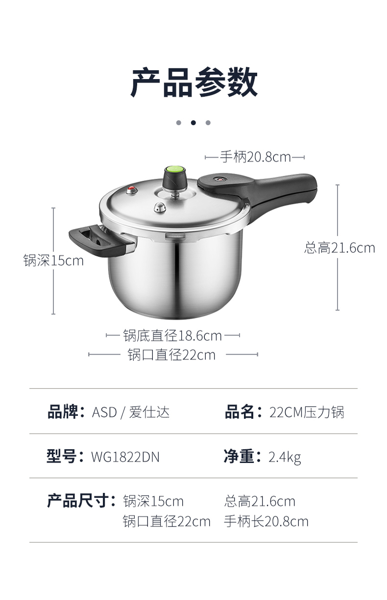 爱仕达 ASD 高压锅304不锈钢六保险5.5L压力锅燃气电磁炉通用WG1822DN