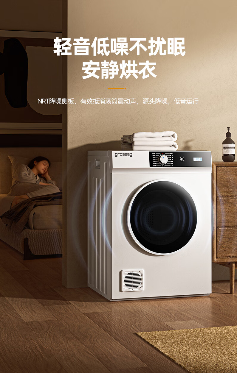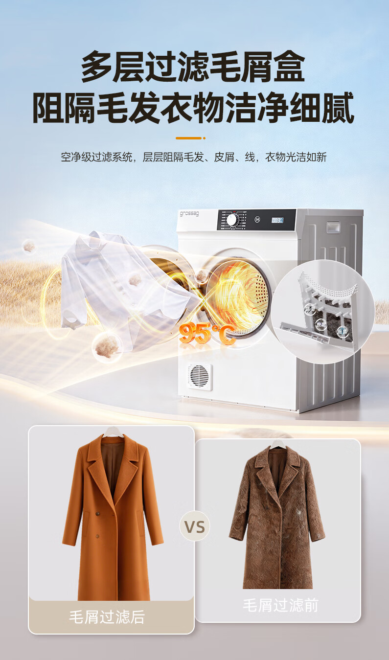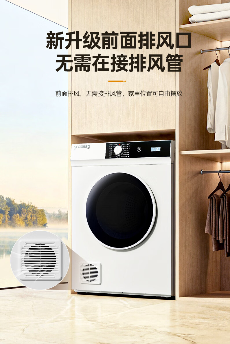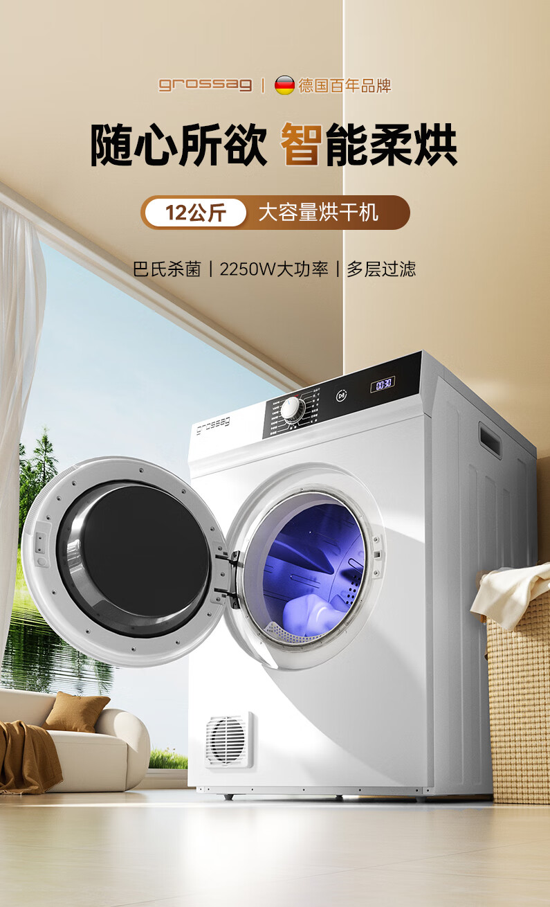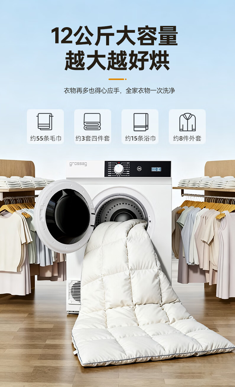 grossag德国12公斤烘干机家用大容量直排式烘衣机智能衣服滚筒过滤毛屑商用酒店民宿宾馆洗浴独立干衣机 12KG标准款【30分钟快烘+前排风+独立过滤盒】
