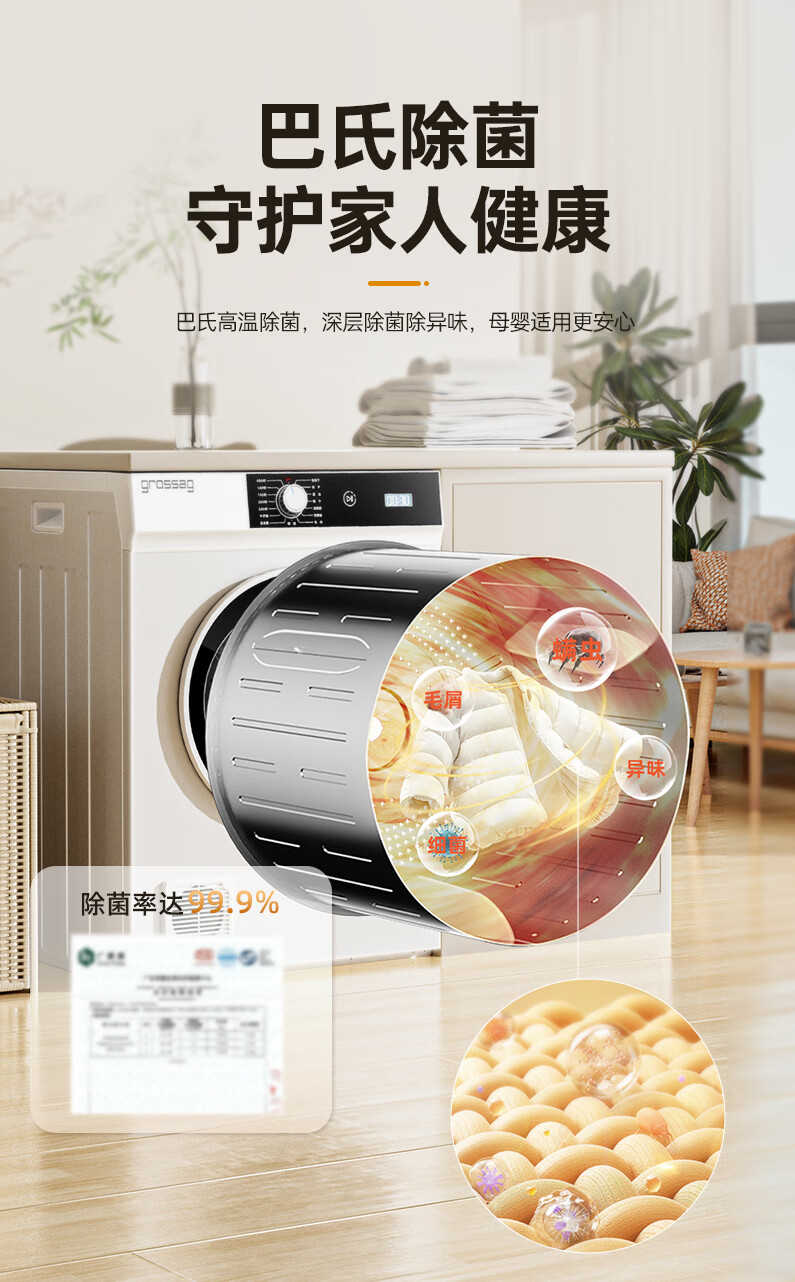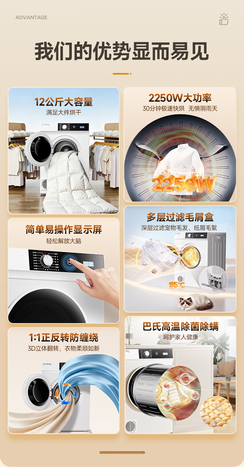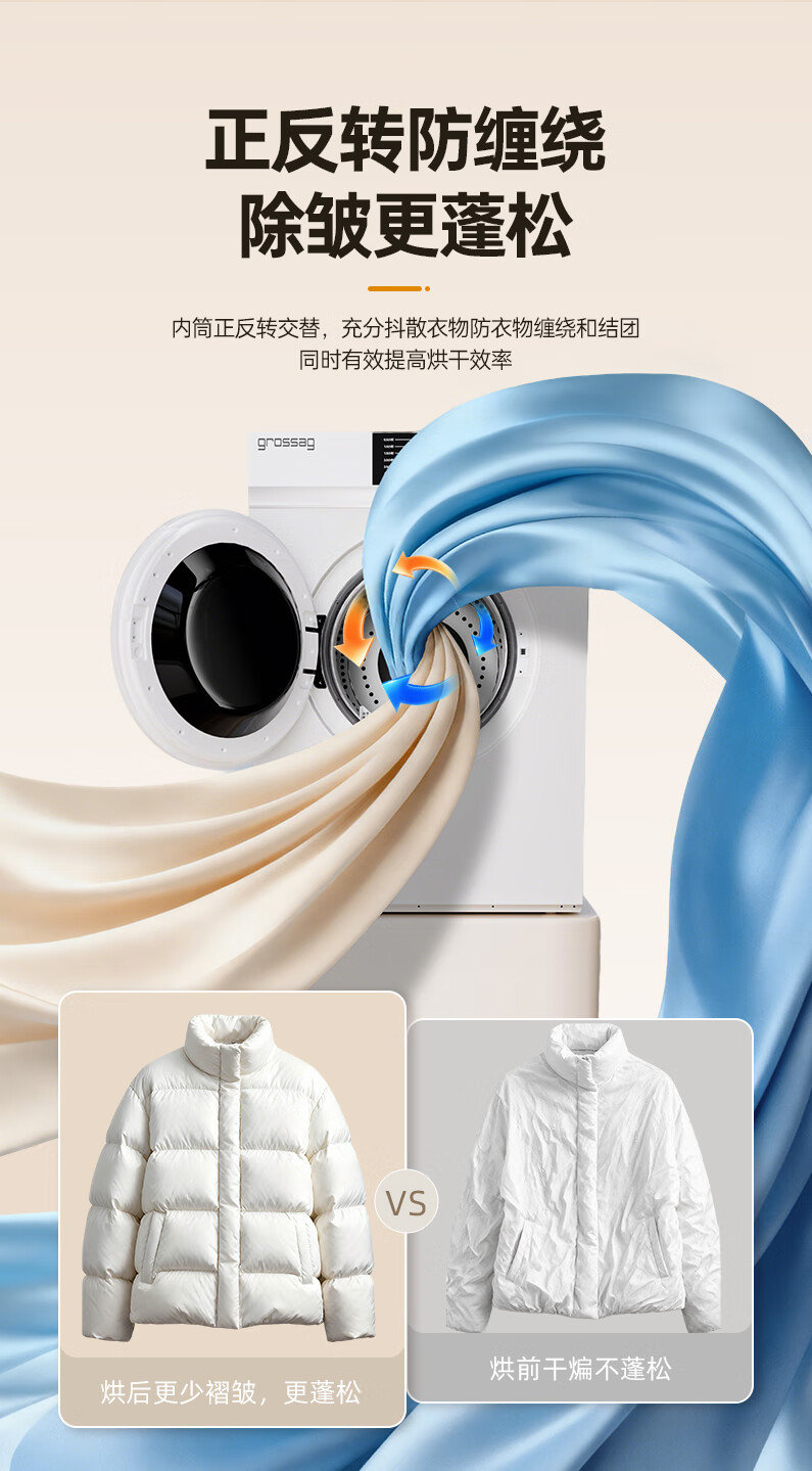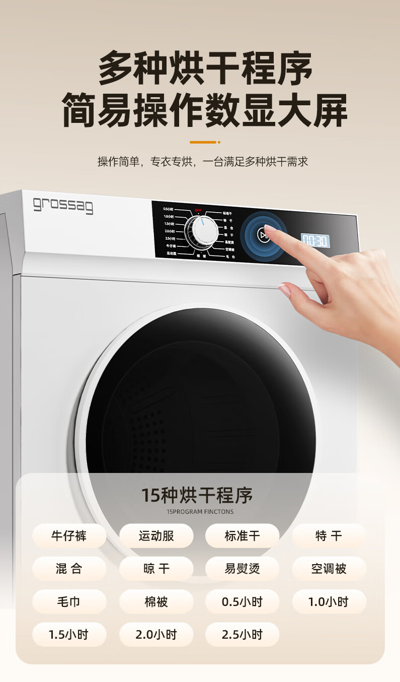 grossag德国12公斤烘干机家用大容量直排式烘衣机智能衣服滚筒过滤毛屑商用酒店民宿宾馆洗浴独立干衣机 12KG标准款【30分钟快烘+前排风+独立过滤盒】