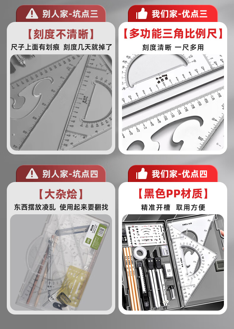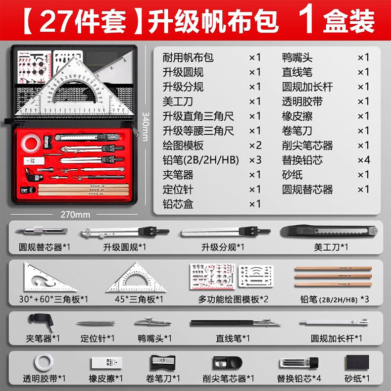 少年伴机械制图绘图工具套装圆规专业绘图大学生工科工程绘图工具包作图工具尺子实用透明盒小初中高6518