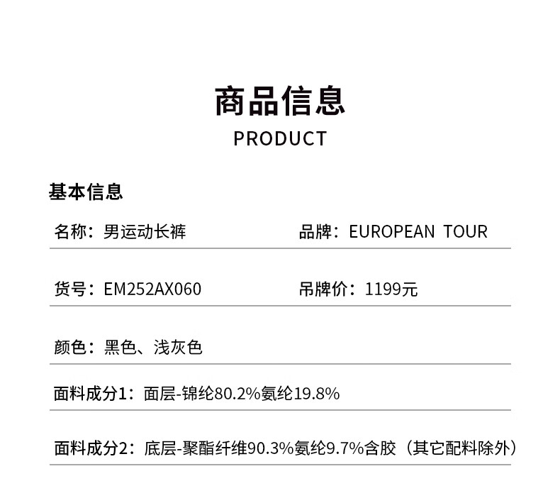 EUROPEAN TOUR欧巡赛高尔夫服装男装长裤25秋冬薄绒保暖弹力防风御寒运动裤子男 浅灰色 40