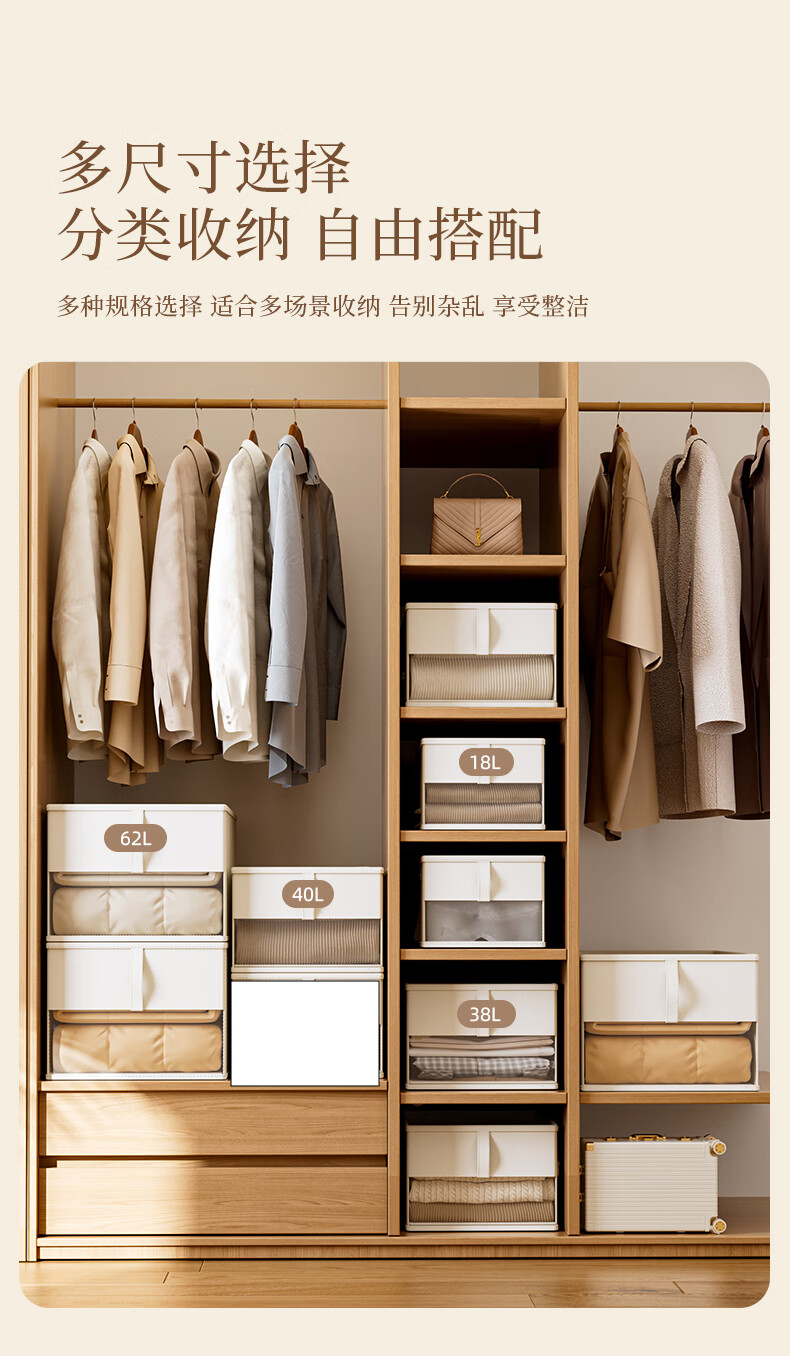 沃尊衣服收纳箱透明窄长型收纳盒夹缝衣物储物盒牛津布衣柜收纳整理箱 米色-大号49L【47*35*30cm】