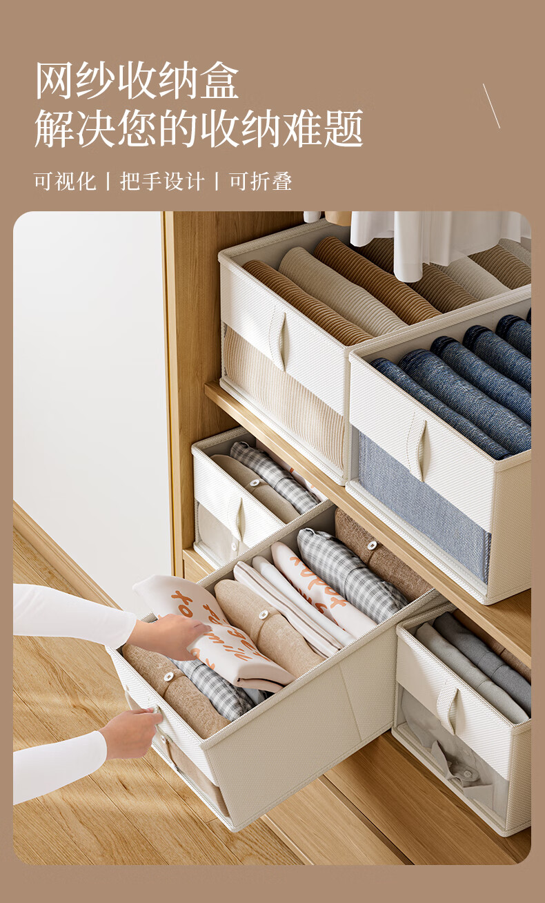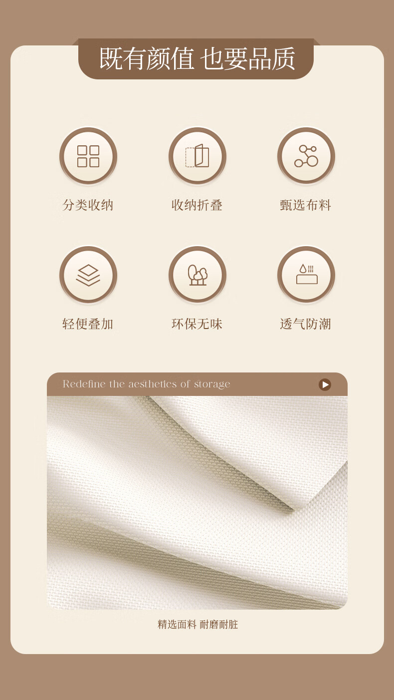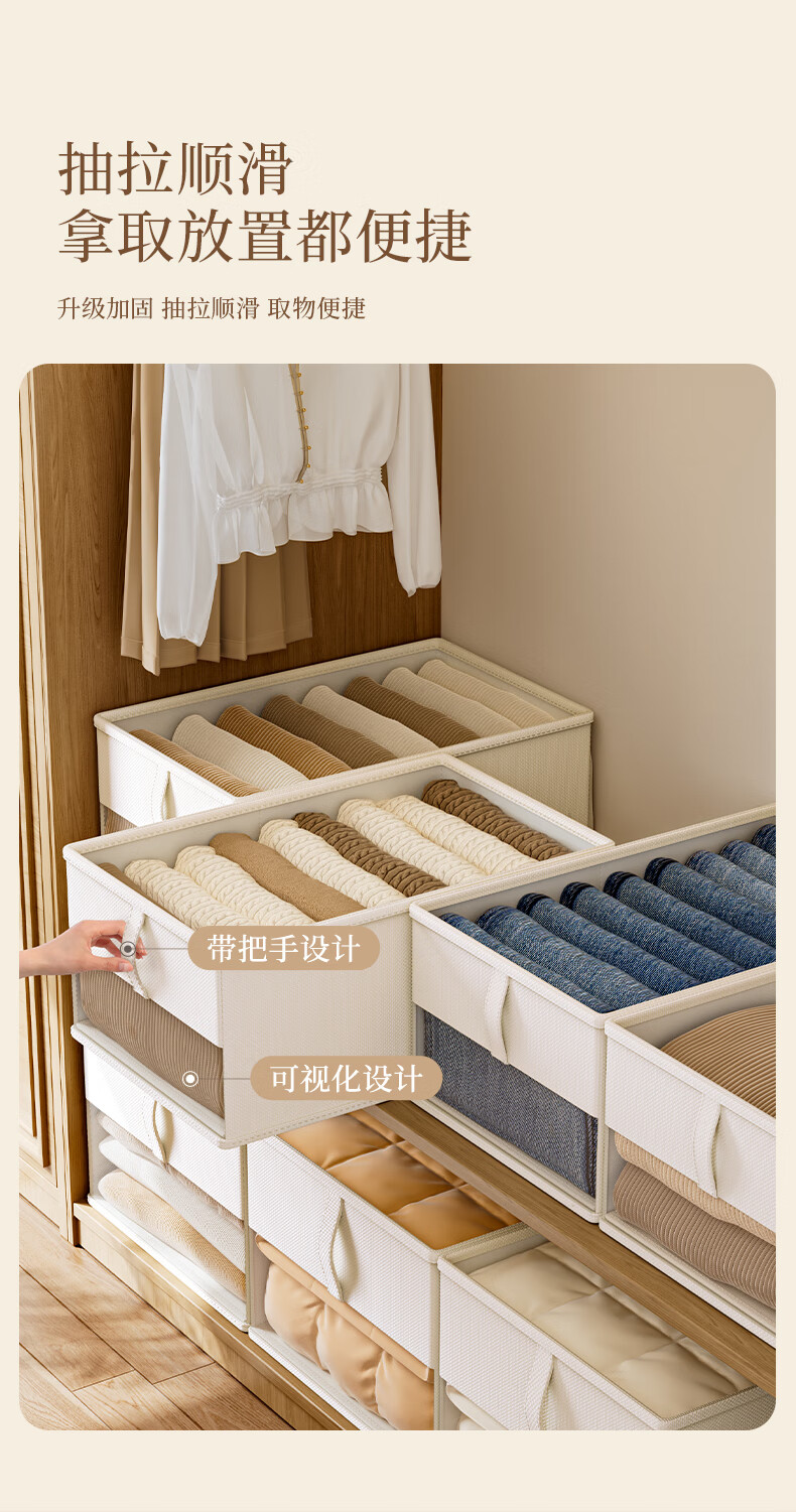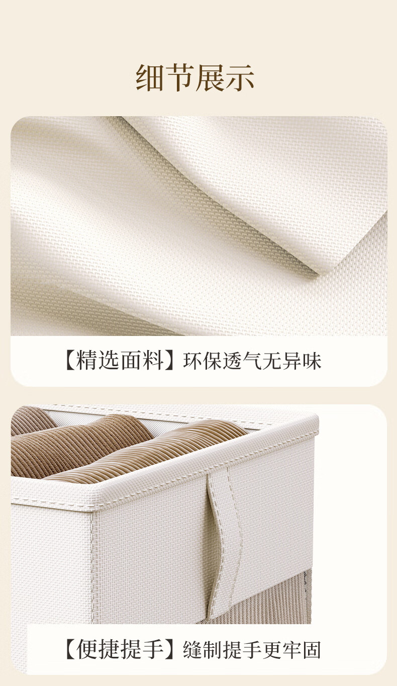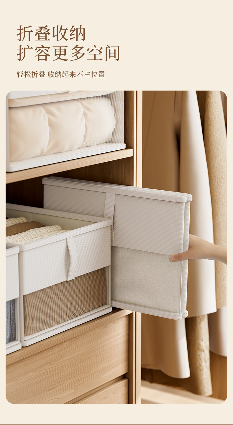邦尼美家衣物收纳盒家用可折叠裤子收纳盒棉麻内衣整理盒衣柜分层收纳神器 奶白色-中号【40*22.5*20cm】 放心购(无异味可水洗)
