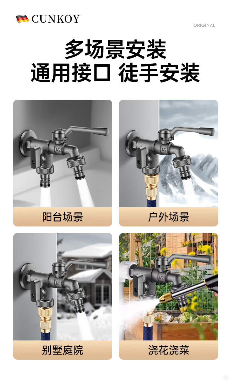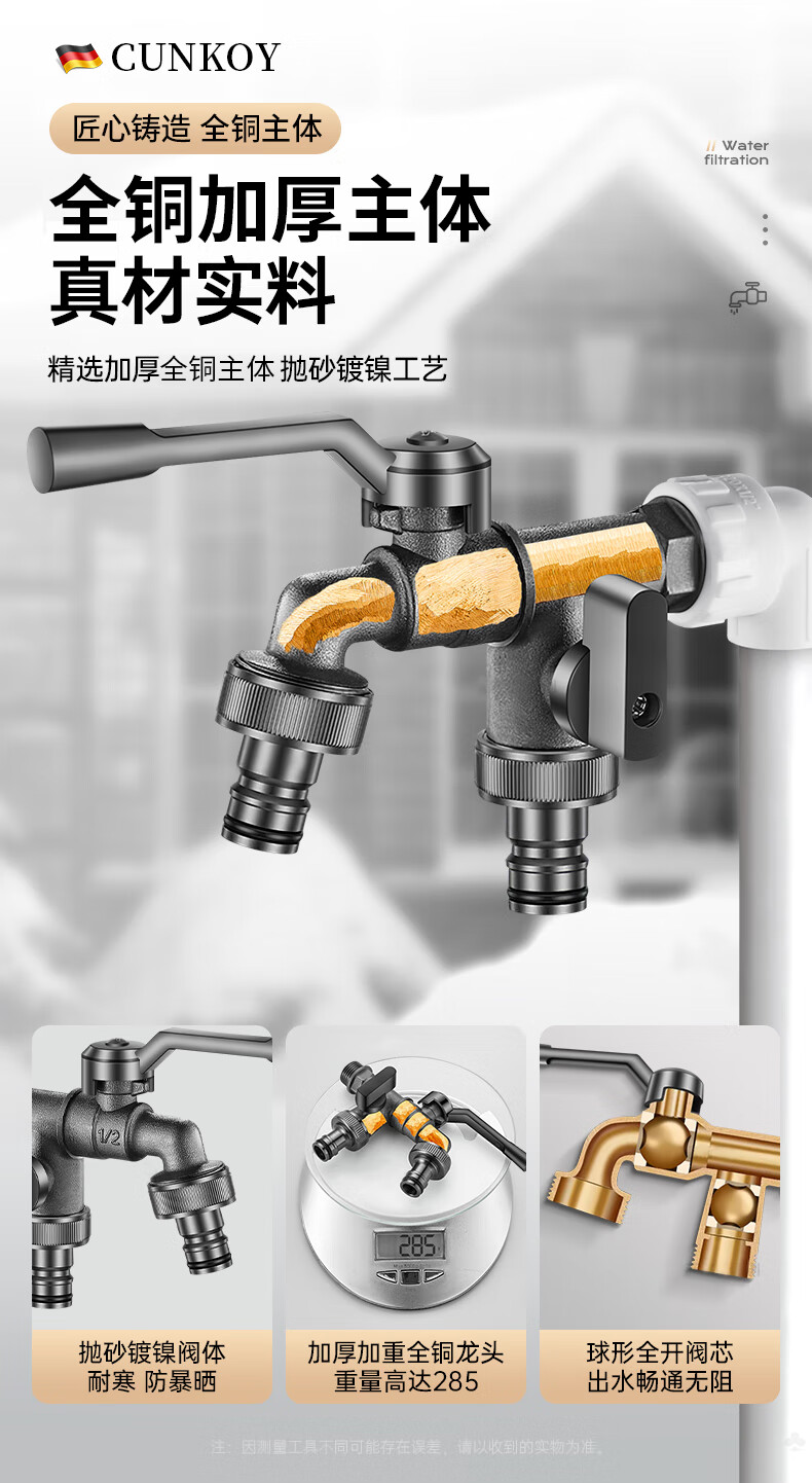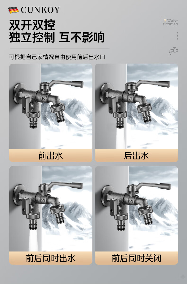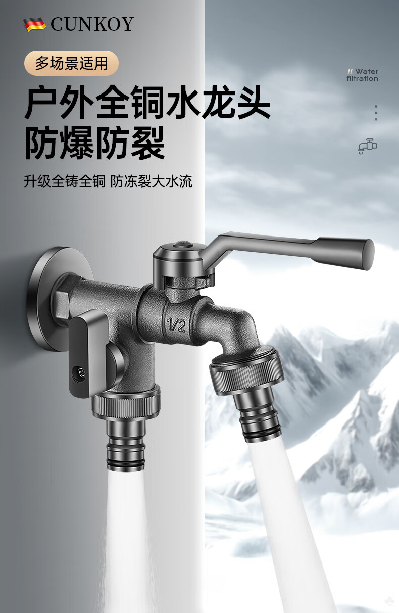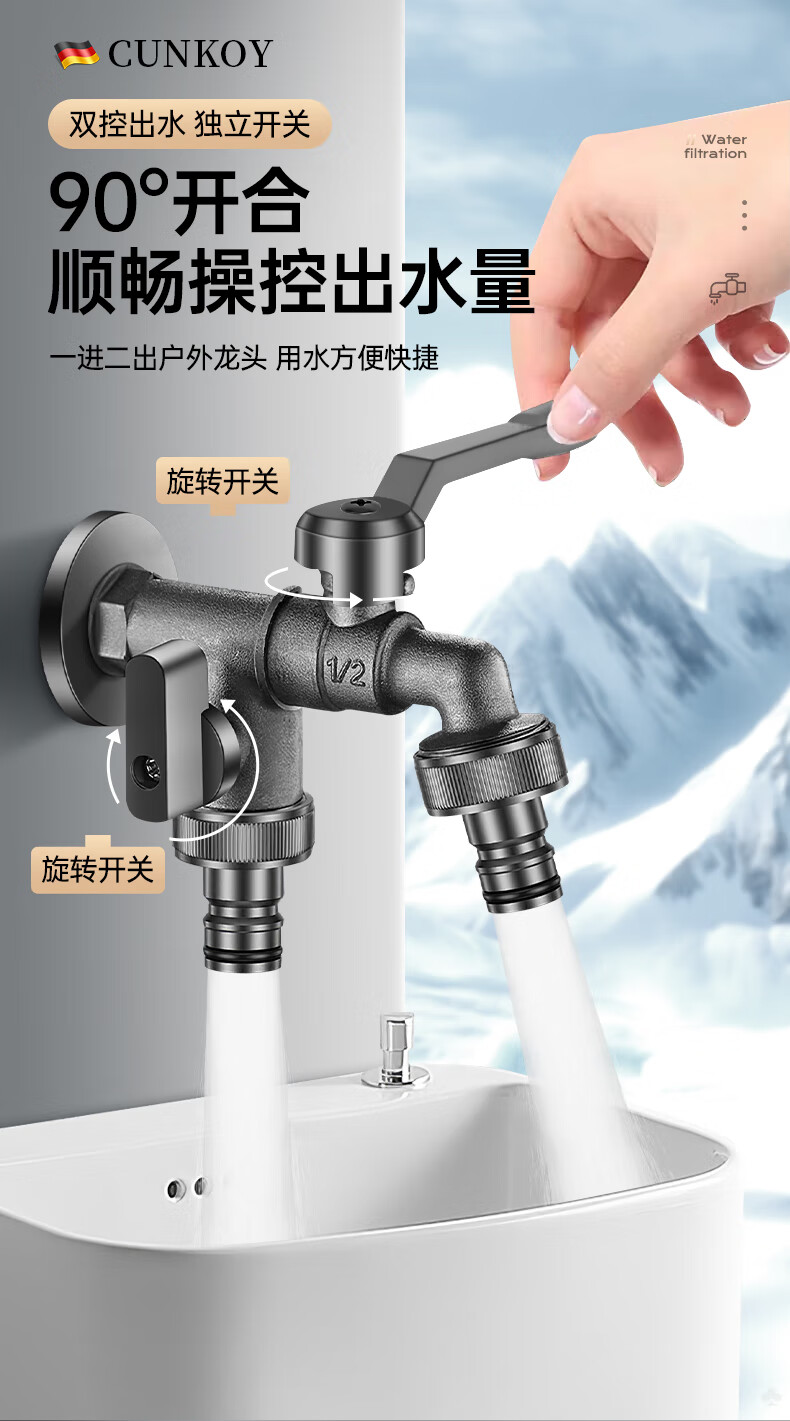 CUNKOY【德国】全铜户外水龙头一进二出洗衣机庭院花园室外防冻防晒龙头 户外水龙头【全铜主体】一进二出 防冻防晒防爆裂丨4/6分通用安装