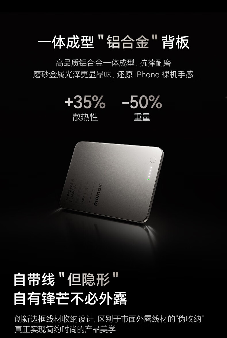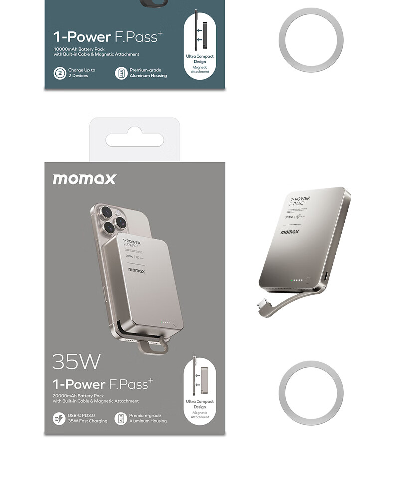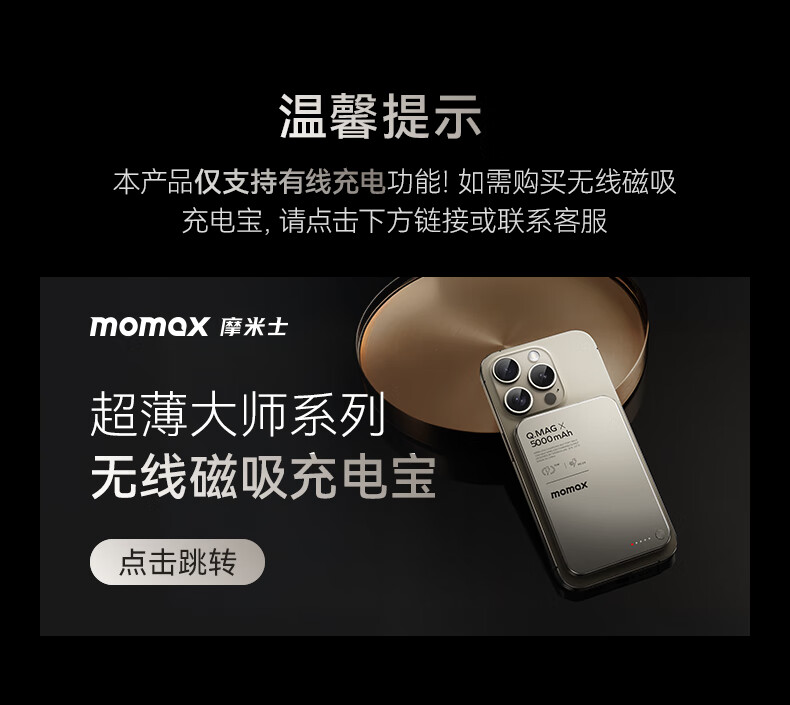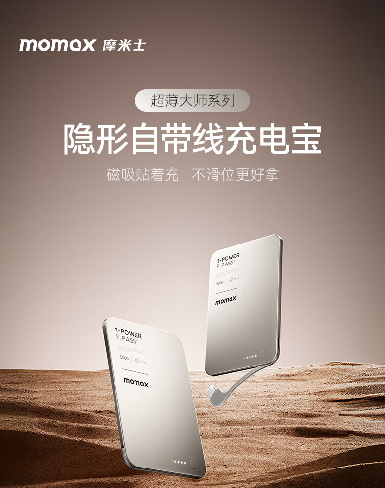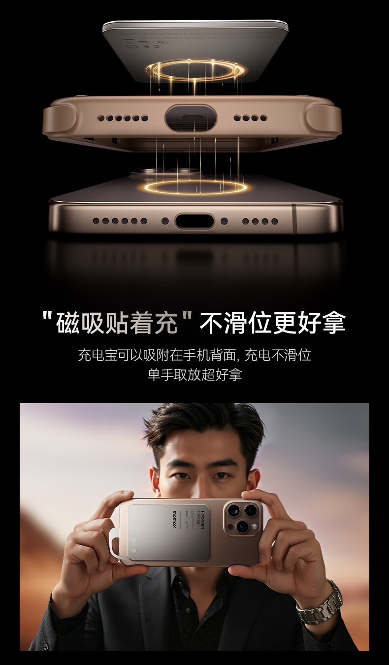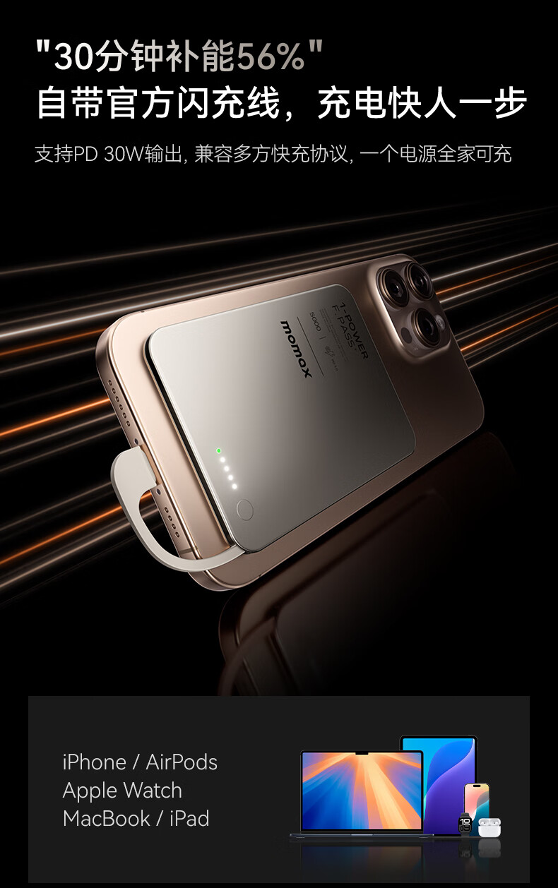 摩米士(MOMAX)【超轻薄3C认证】30W自带线充电宝10000毫安便携可上飞机可磁力吸附适用苹果17promax华为小米手机