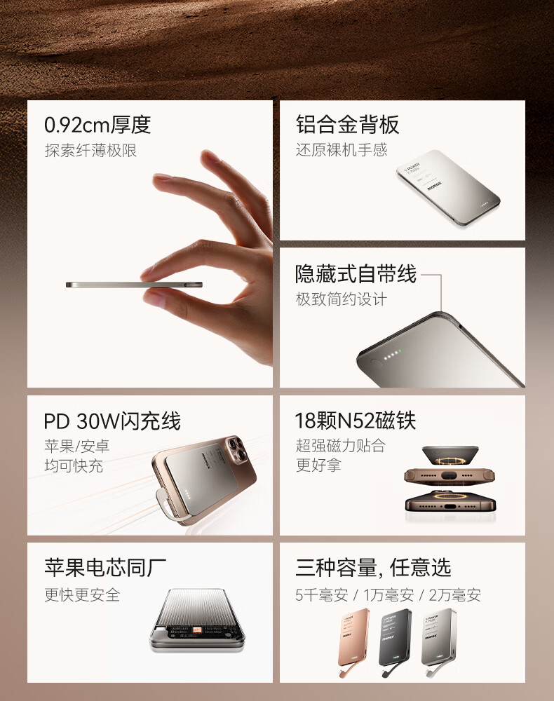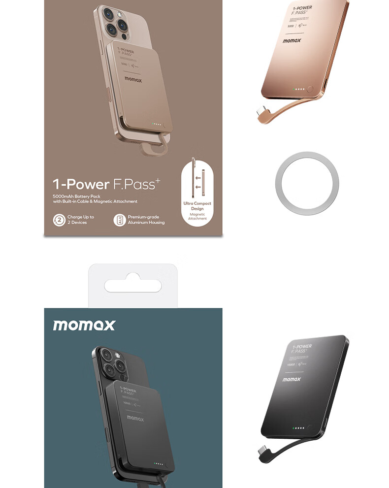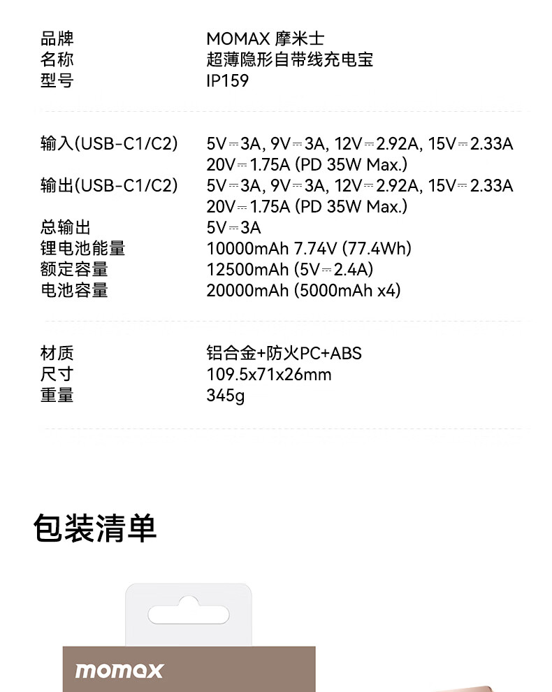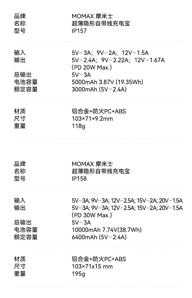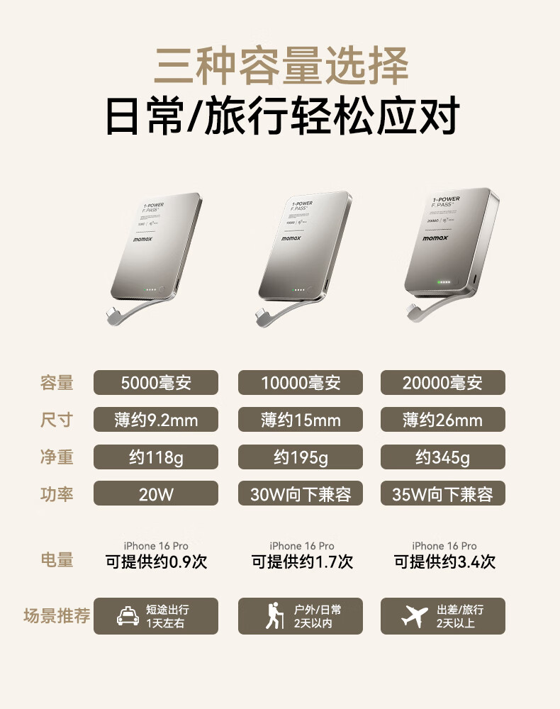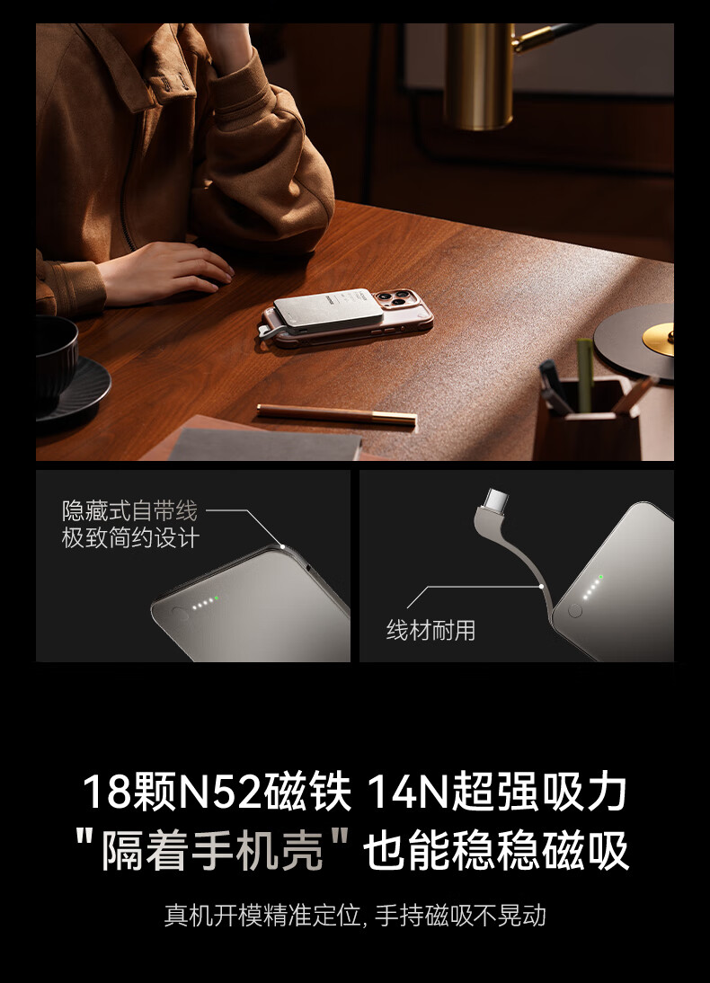 摩米士(MOMAX)【超轻薄3C认证】30W自带线充电宝10000毫安便携可上飞机可磁力吸附适用苹果17promax华为小米手机