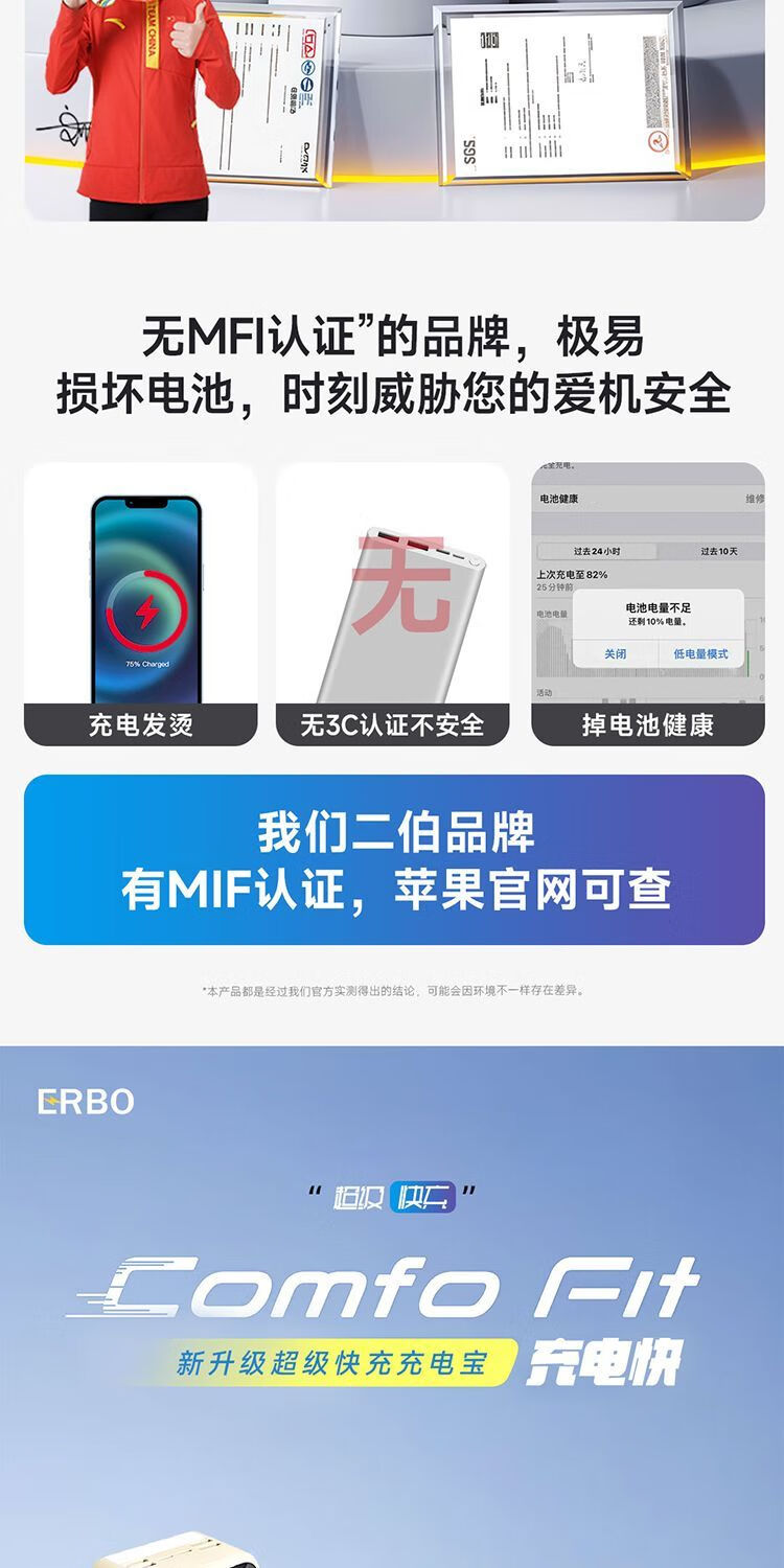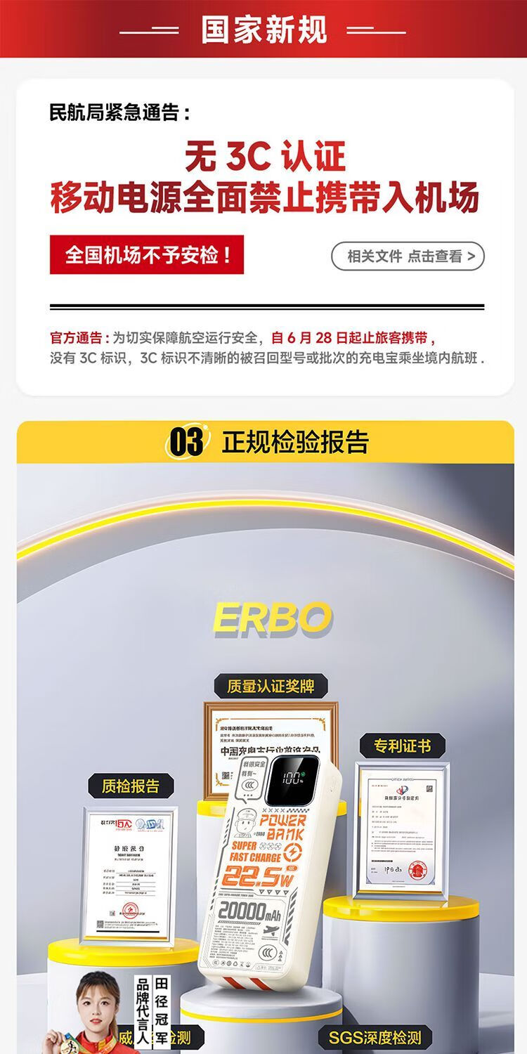 二伯【3C认证充电宝 可上飞机高铁】27000毫安22.5w超级快充自带线大容量移动电源适用苹果安卓露营用 20000毫安(新3C认证+苹果安桌双线+数显))