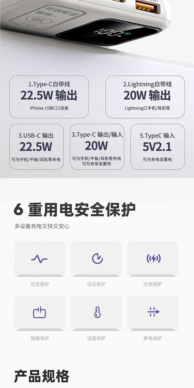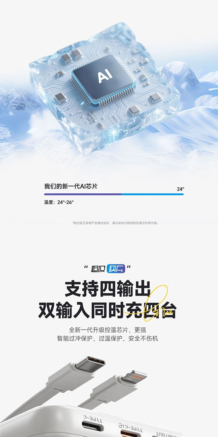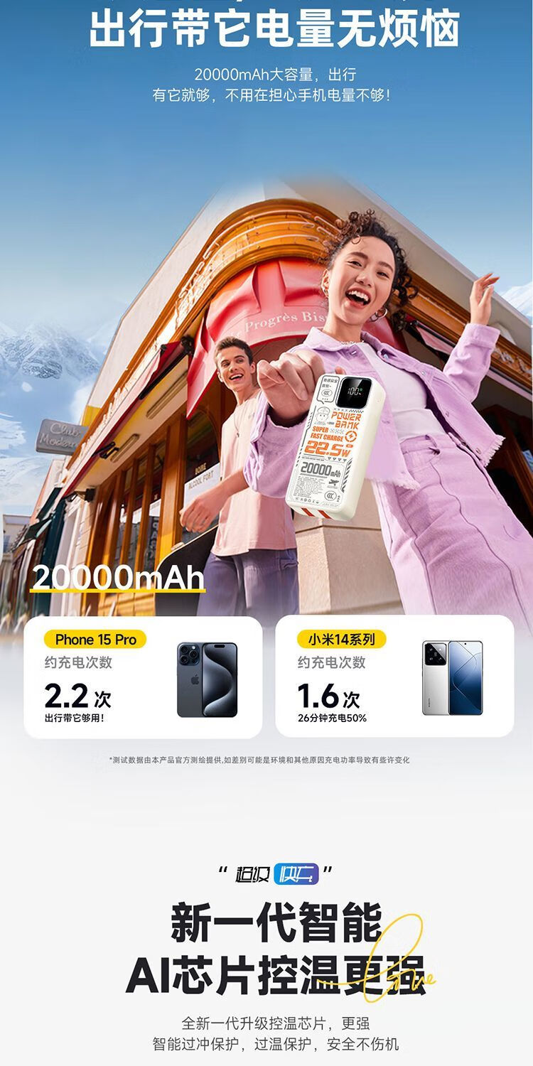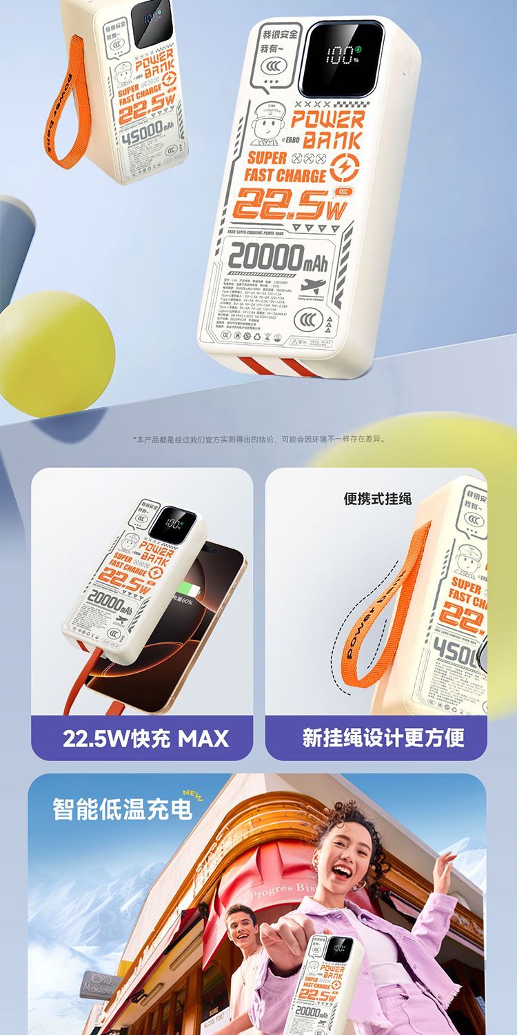 品胜【3C认证】充电宝自带四线20000毫安大容量可上飞机22.5W快充移动电源适用苹果17promax小米华为白