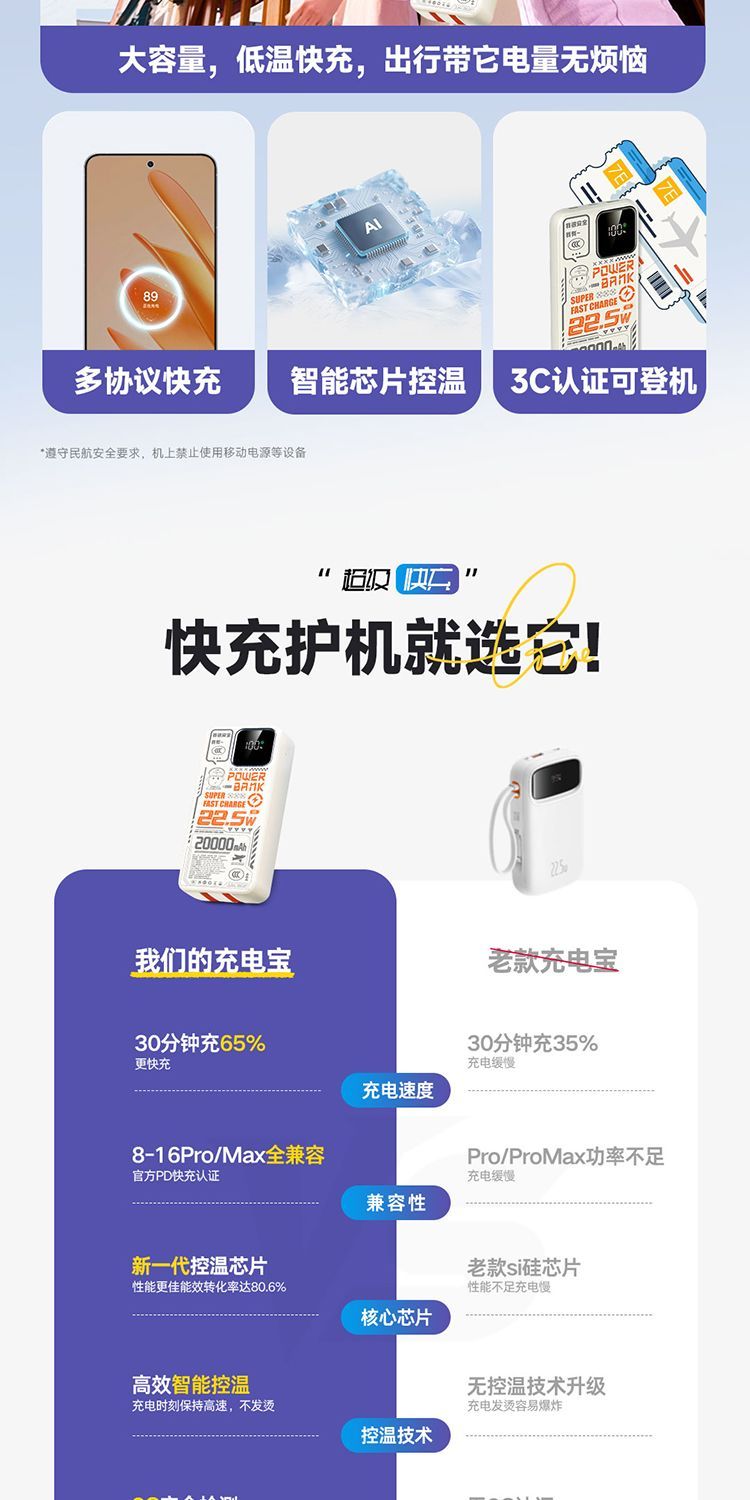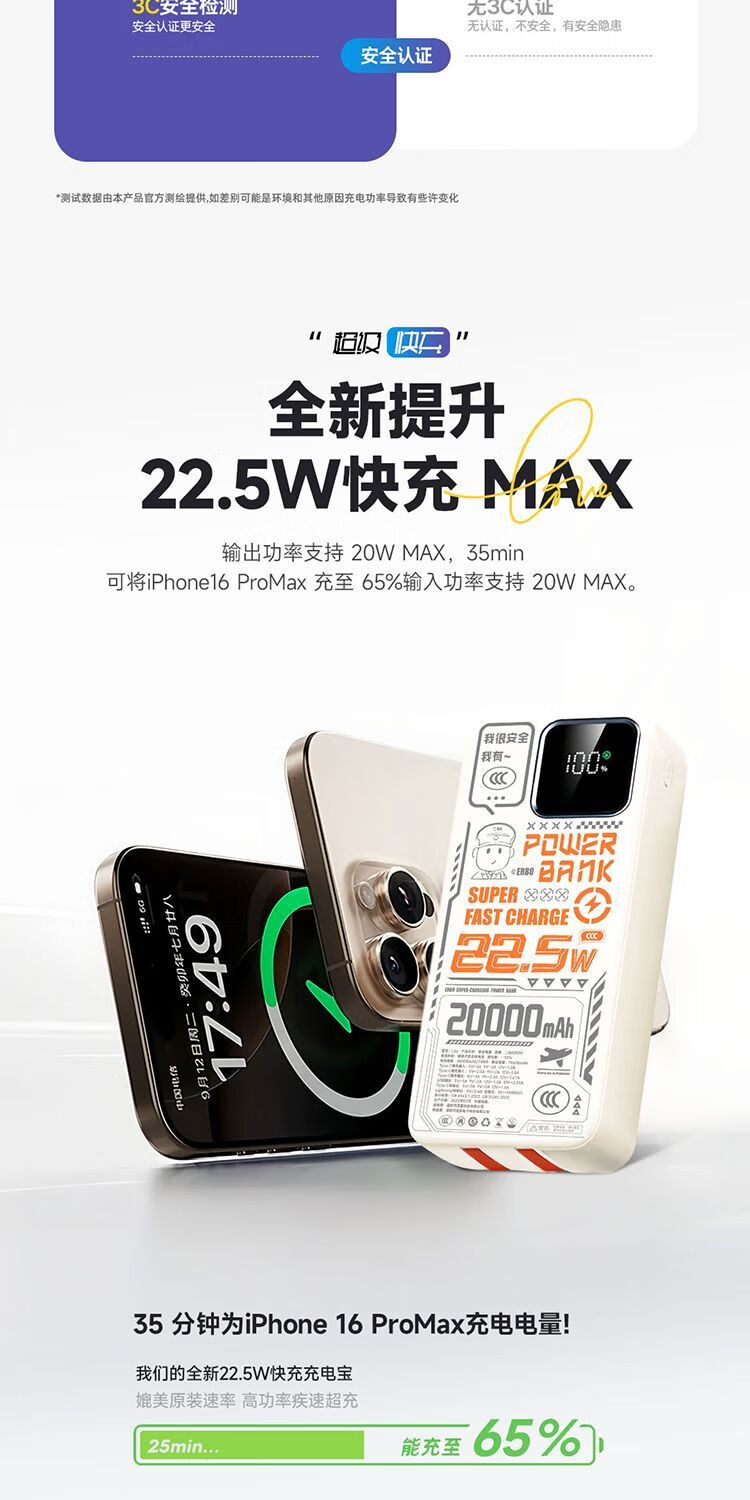 品胜【3C认证】充电宝65W快充27000mAh大容量可上飞机移动电源适用苹果17promax/Air60W40W笔记本电脑