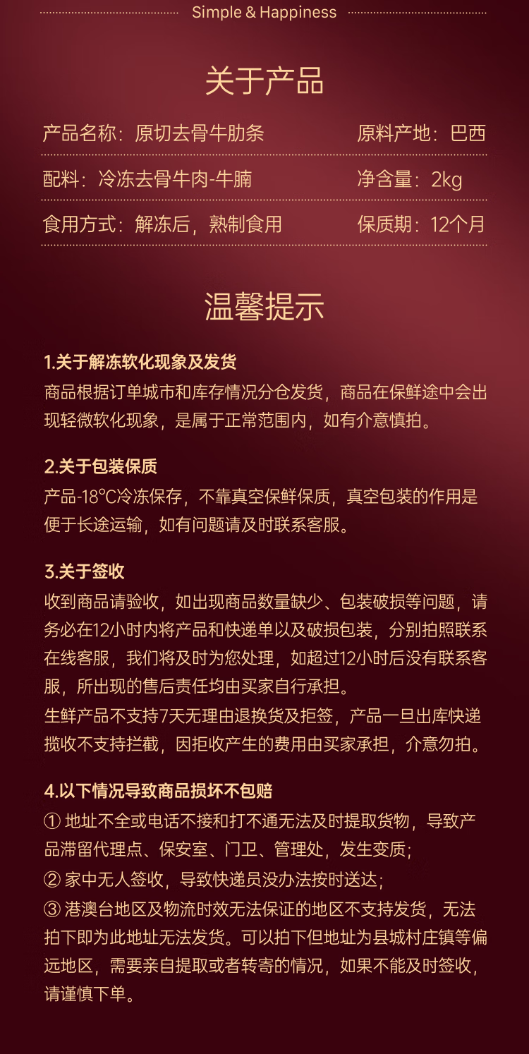 肉可可巴西原切牛肋条净重4斤 炖煮香煎烧烤 进口生鲜牛肉