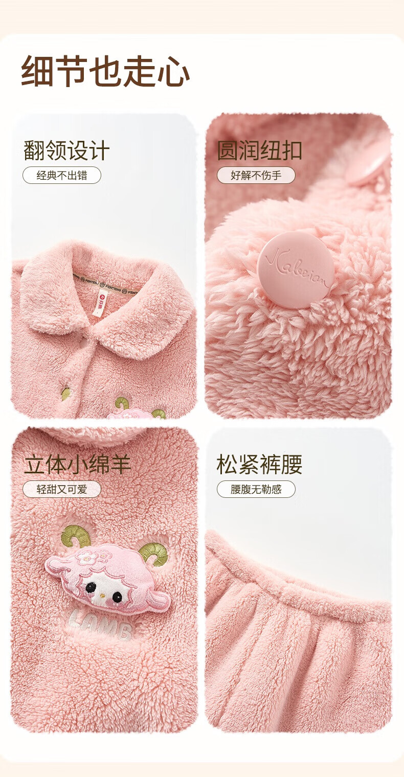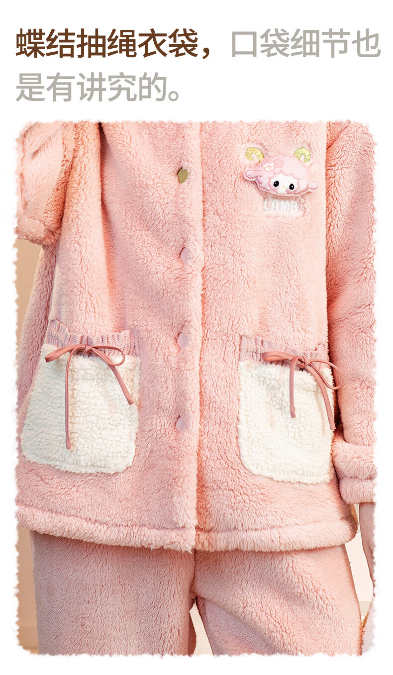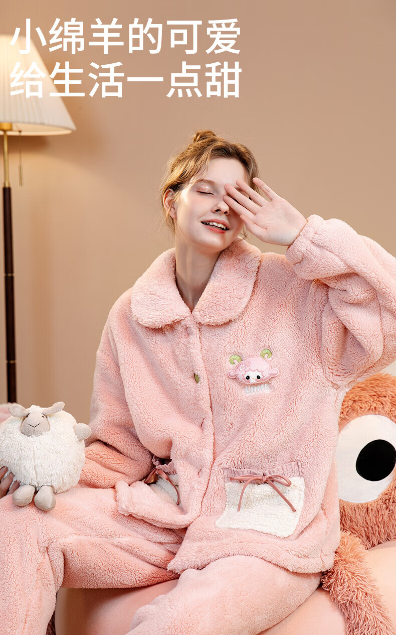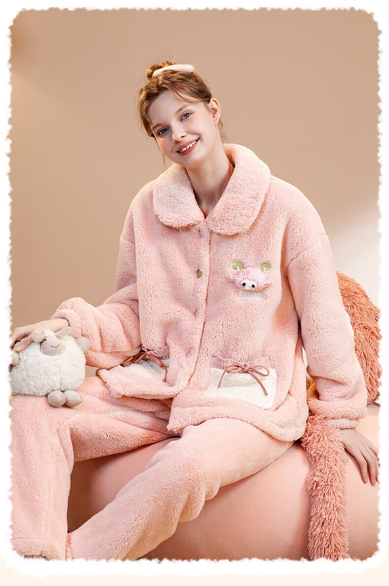 芬腾睡衣女士【双面暖绒】秋冬翻领立体卡通羊长袖保暖家居服套装 萌粉 2XL