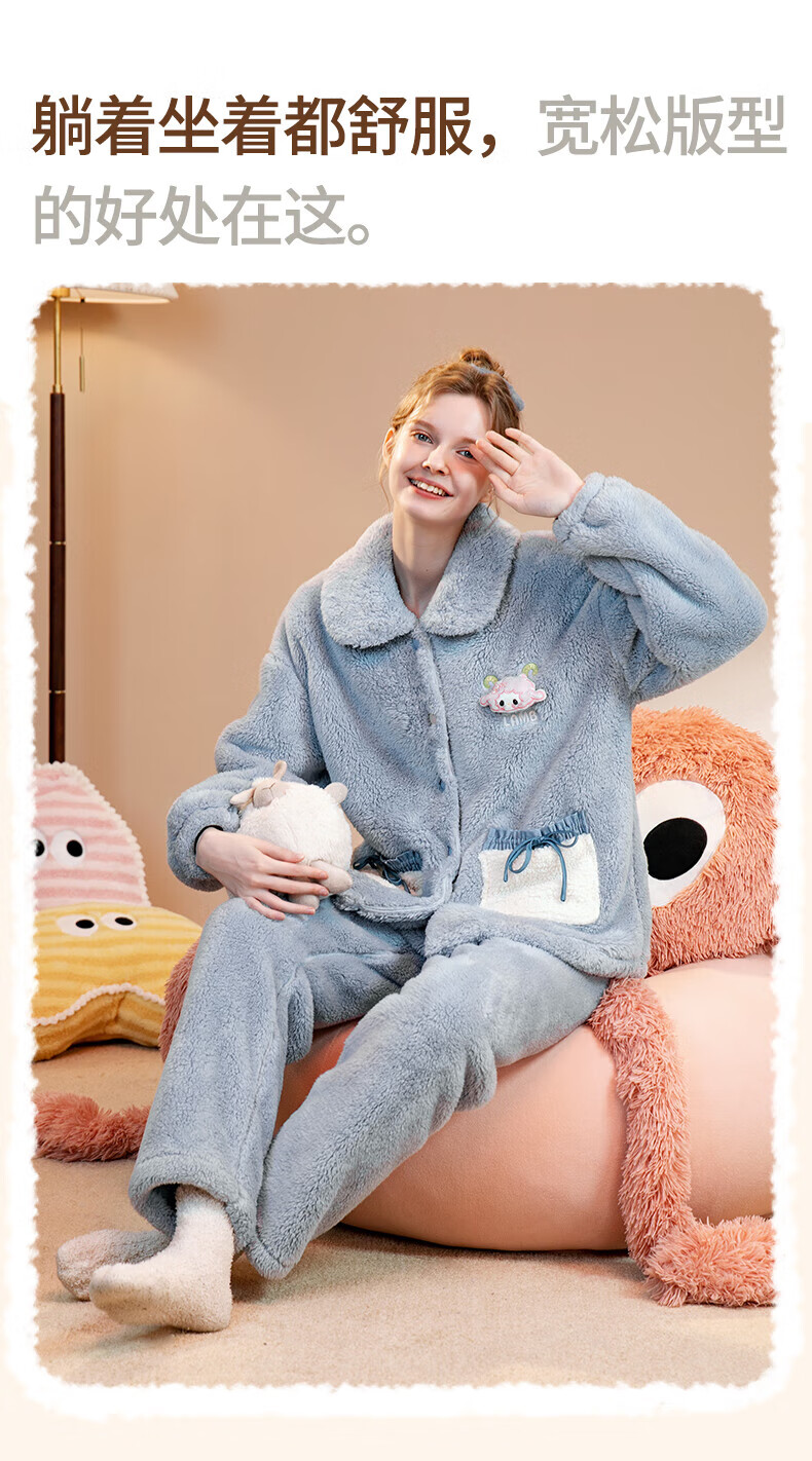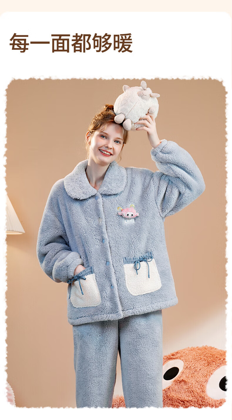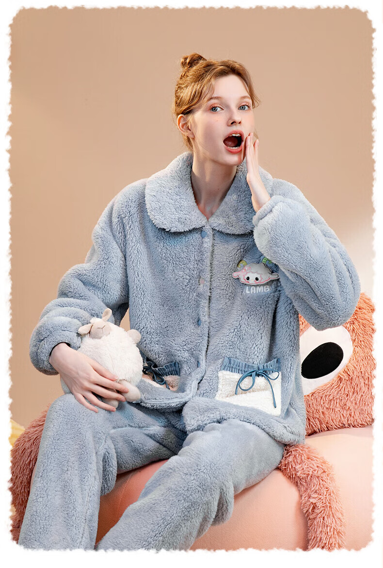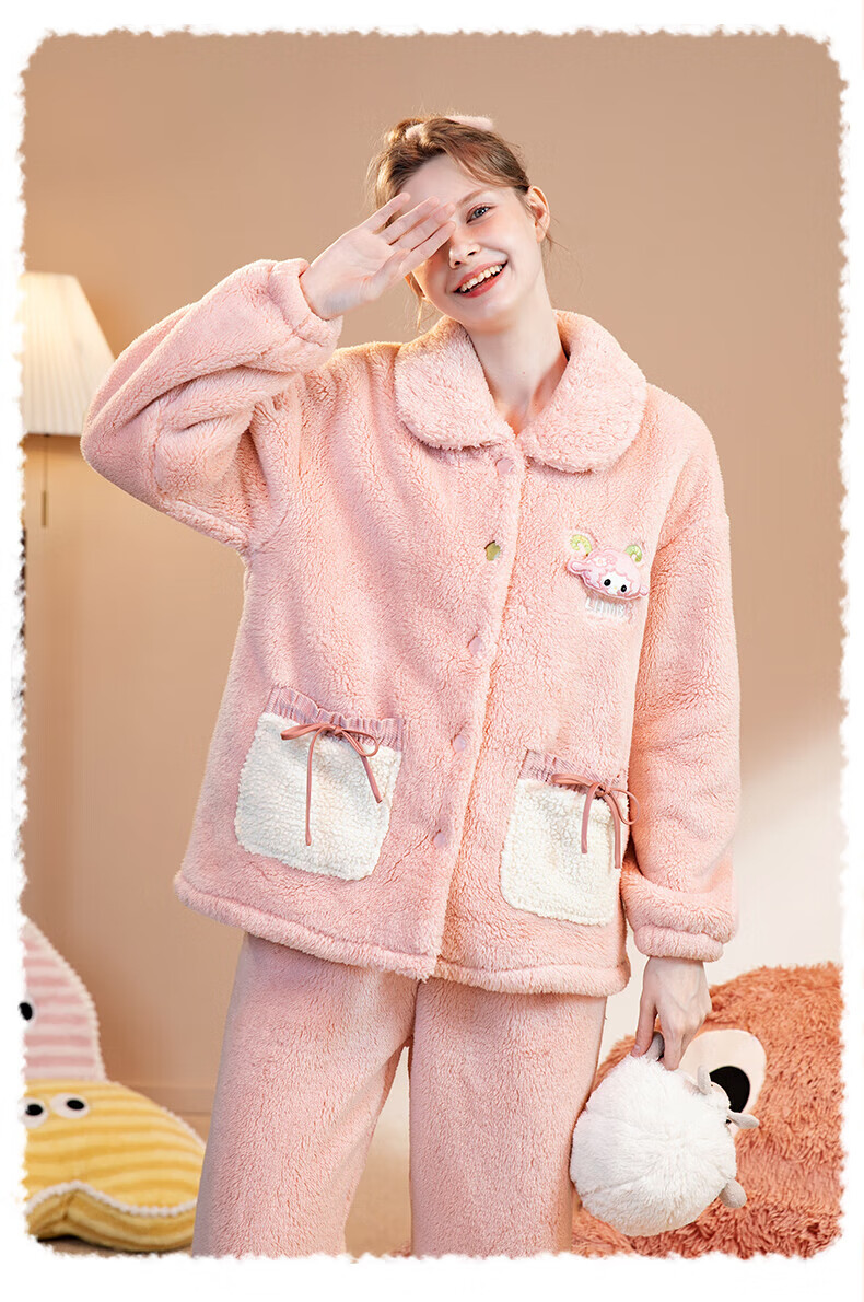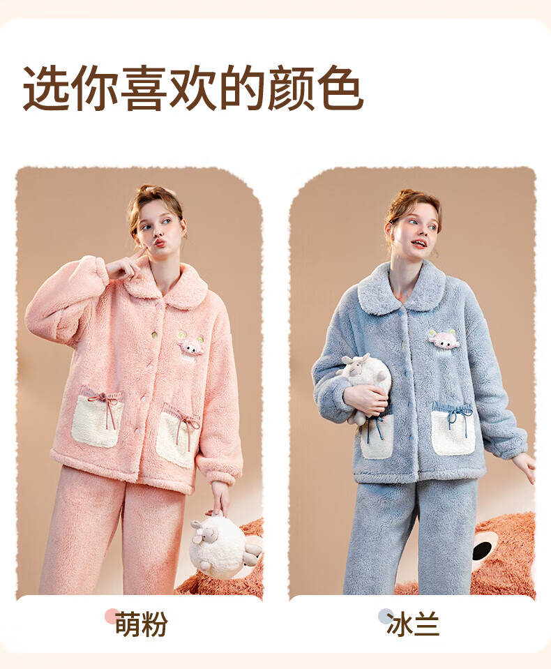 芬腾睡衣女士【双面暖绒】秋冬翻领立体卡通羊长袖保暖家居服套装 萌粉 2XL