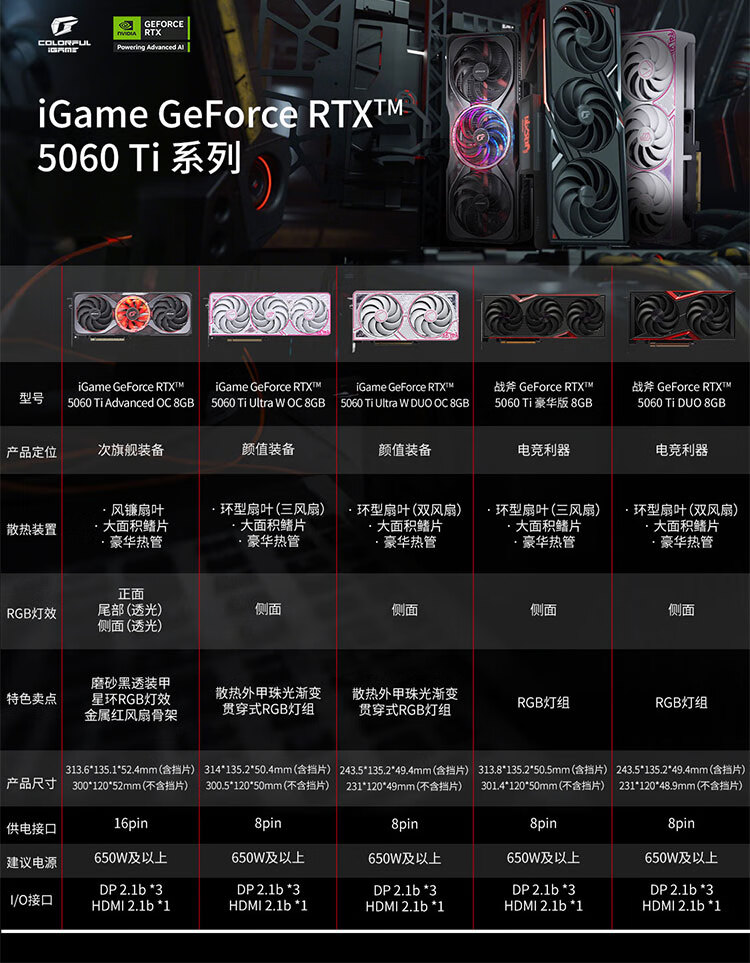 七彩虹(Colorful)iGame GeForce RTX 5060 Ti Ultra W DUO OC 8GB GDDR7 DLSS 4 电竞光追游戏设计电脑显卡