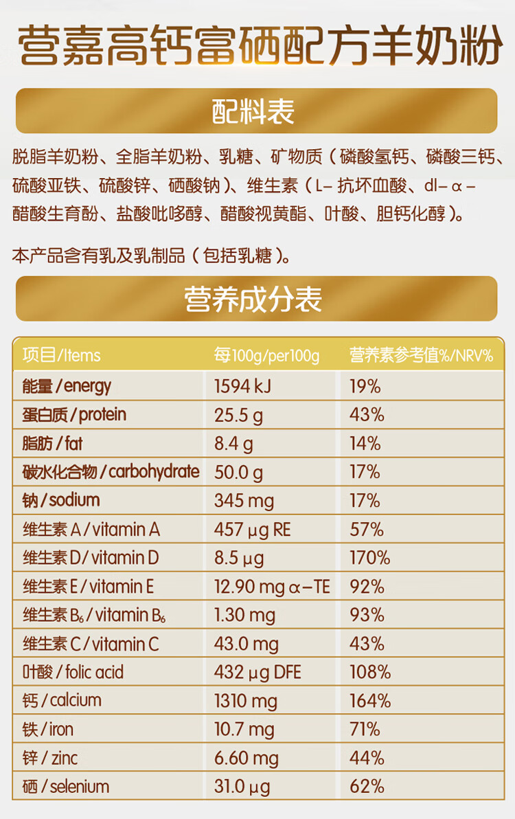佳贝艾特羊奶粉营嘉高钙富硒无蔗糖成人中老年奶粉800g荷兰进口中秋送礼 高钙富硒800g