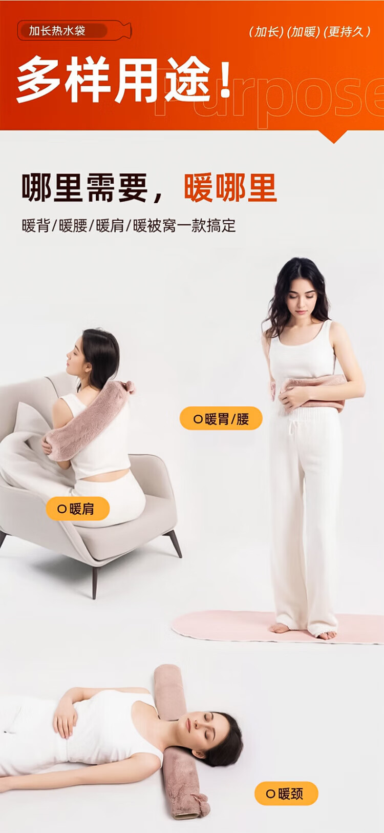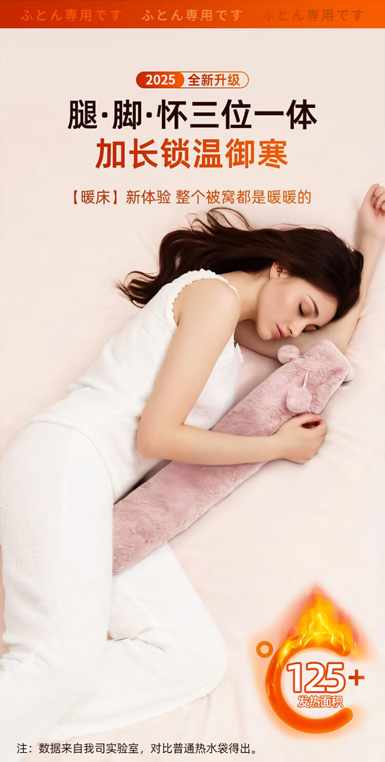 WCZ德国注水式热水袋加长大号被窝专用长条款暖水袋灌水睡觉暖脚神器 加长款80cm樱花粉仿兔绒布套加厚内胆