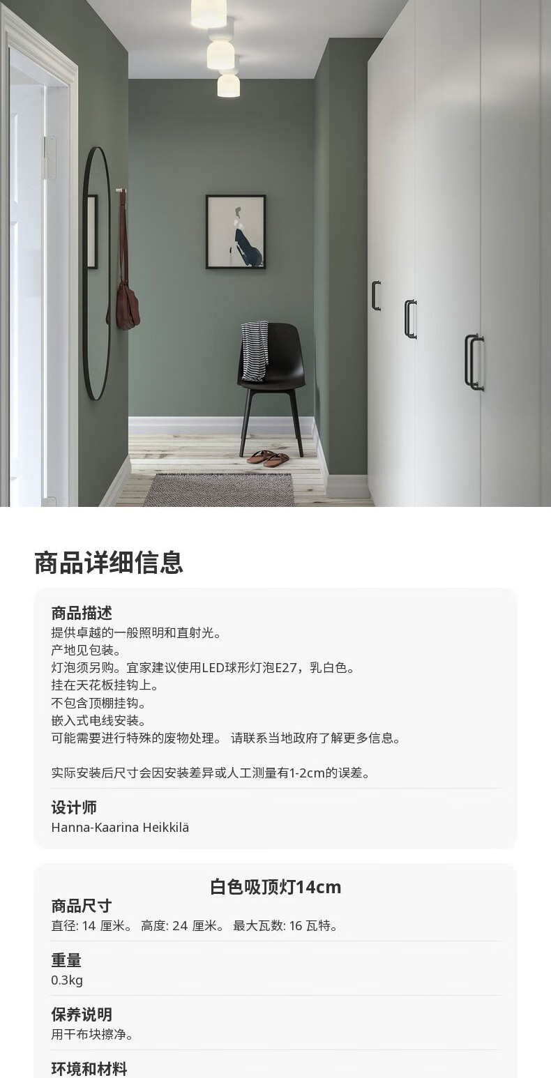 宜家(IKEA)【新品】HAMNFYR汉姆菲尔吸顶灯照明灯走廊家用装饰灯 【新品】白色吸顶灯14cm