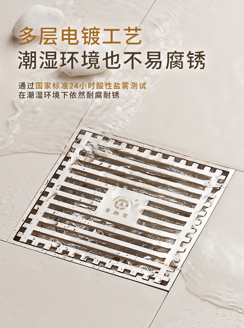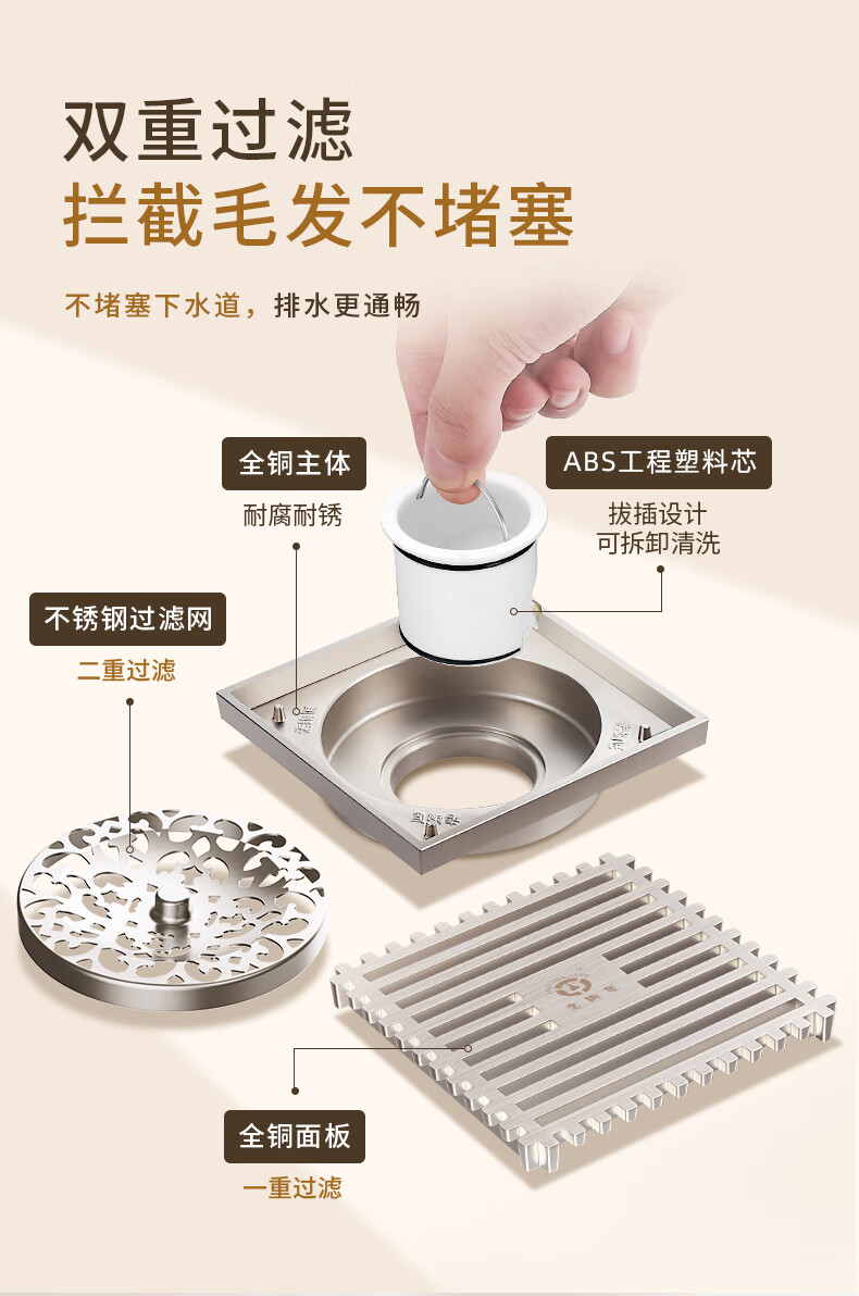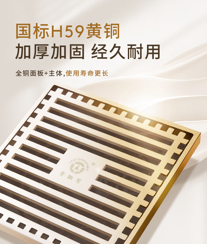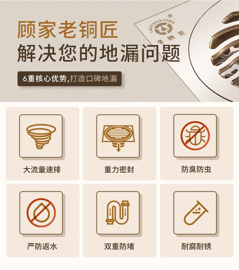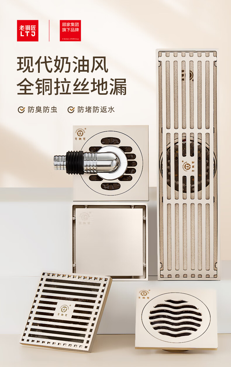 老铜匠顾家集团奶油风防臭地漏全铜方形超薄淋浴房卫生间干湿区浴室地漏