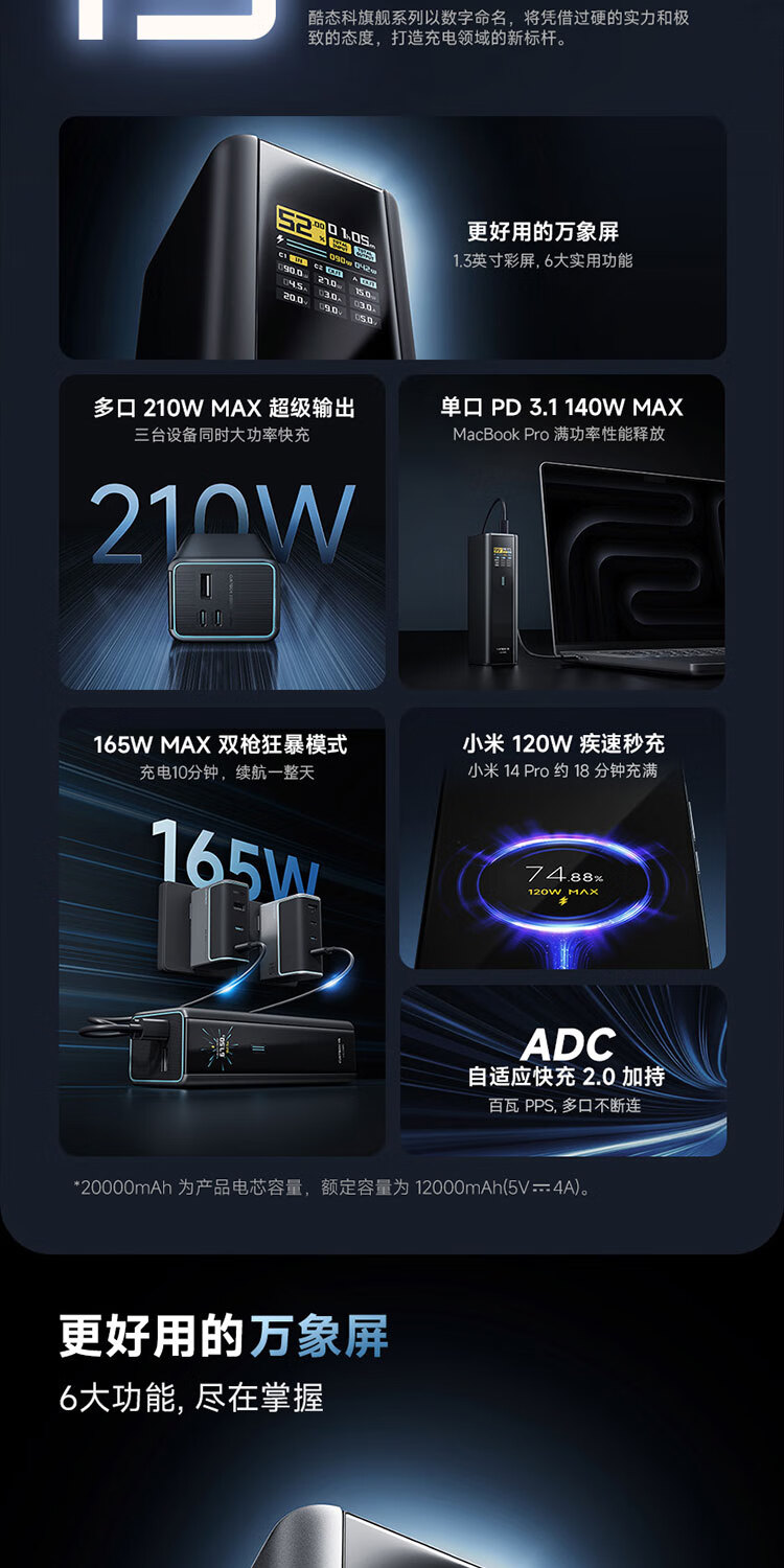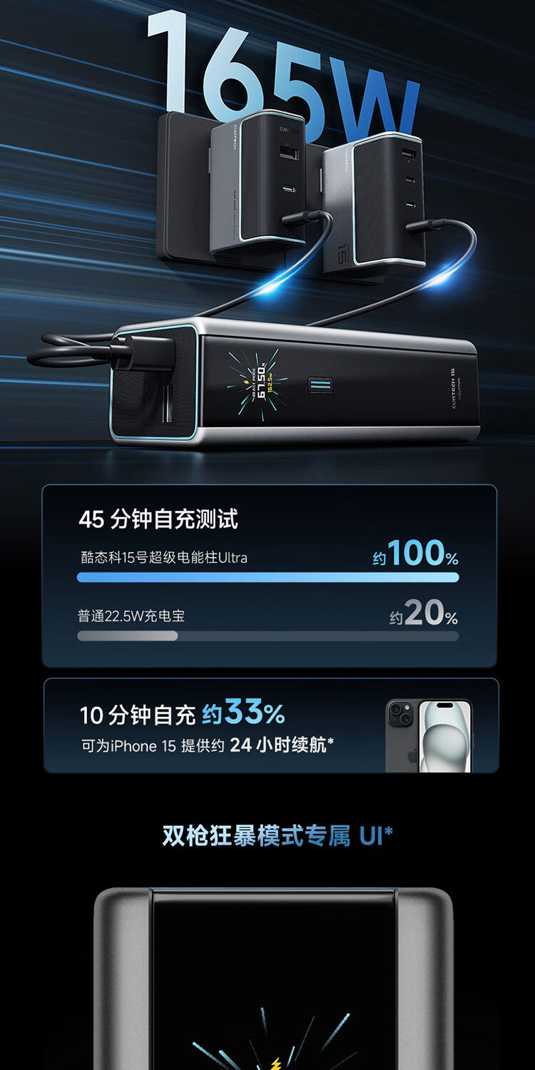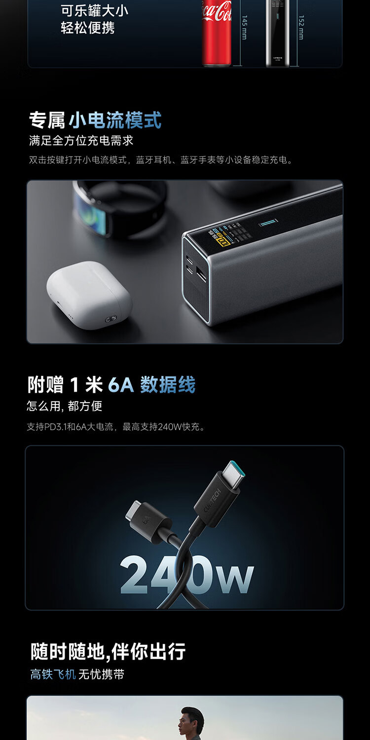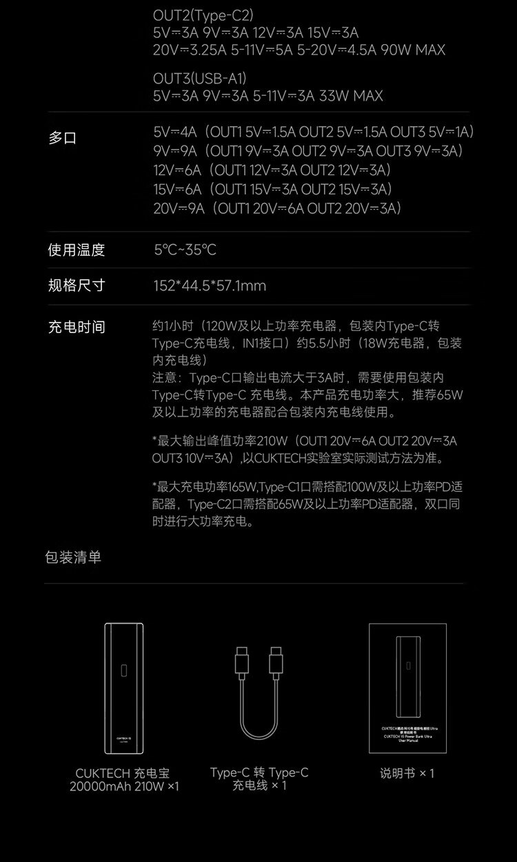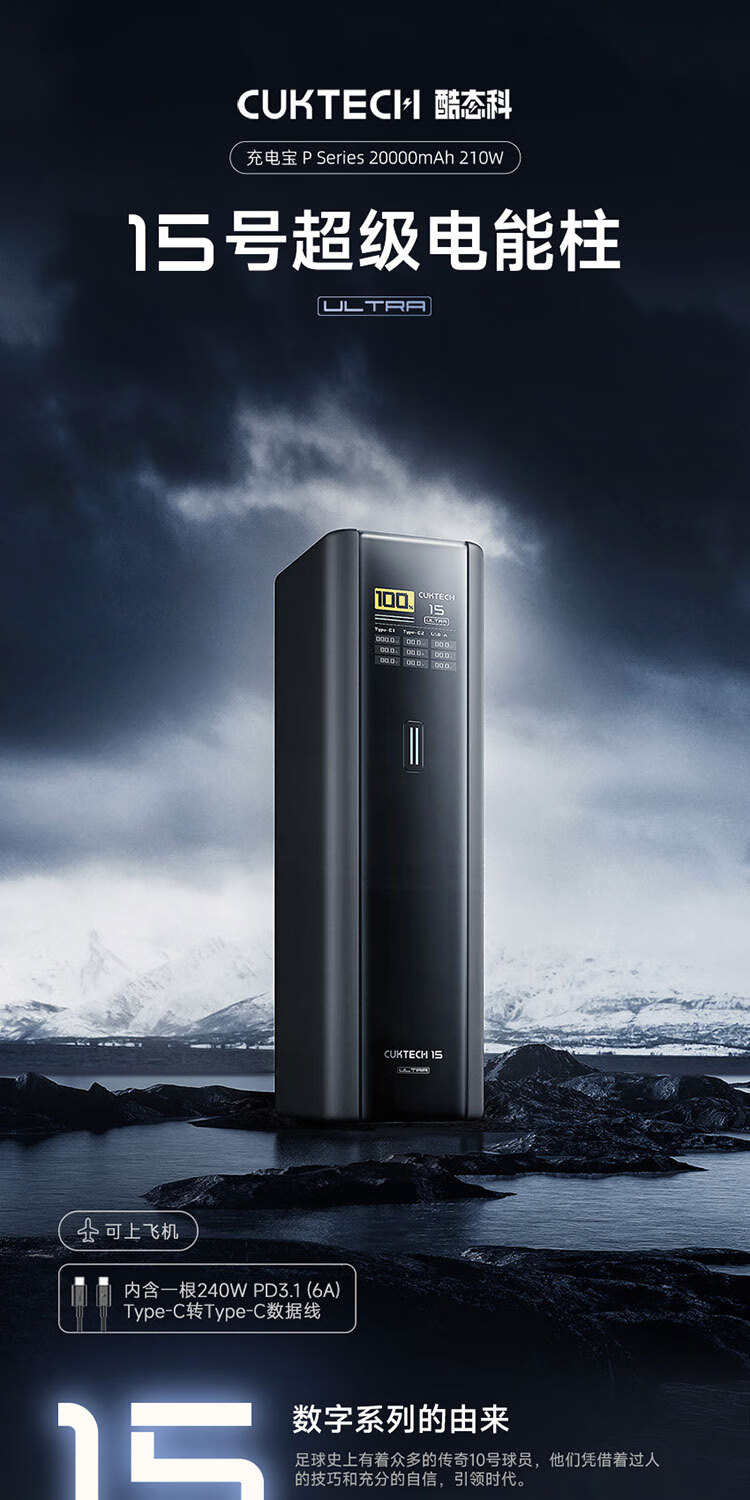 CUKTECH酷态科【3C认证可上飞机】15号超级电能柱Ultra20000毫安时充电宝140W多口210W快充支持小米笔记本