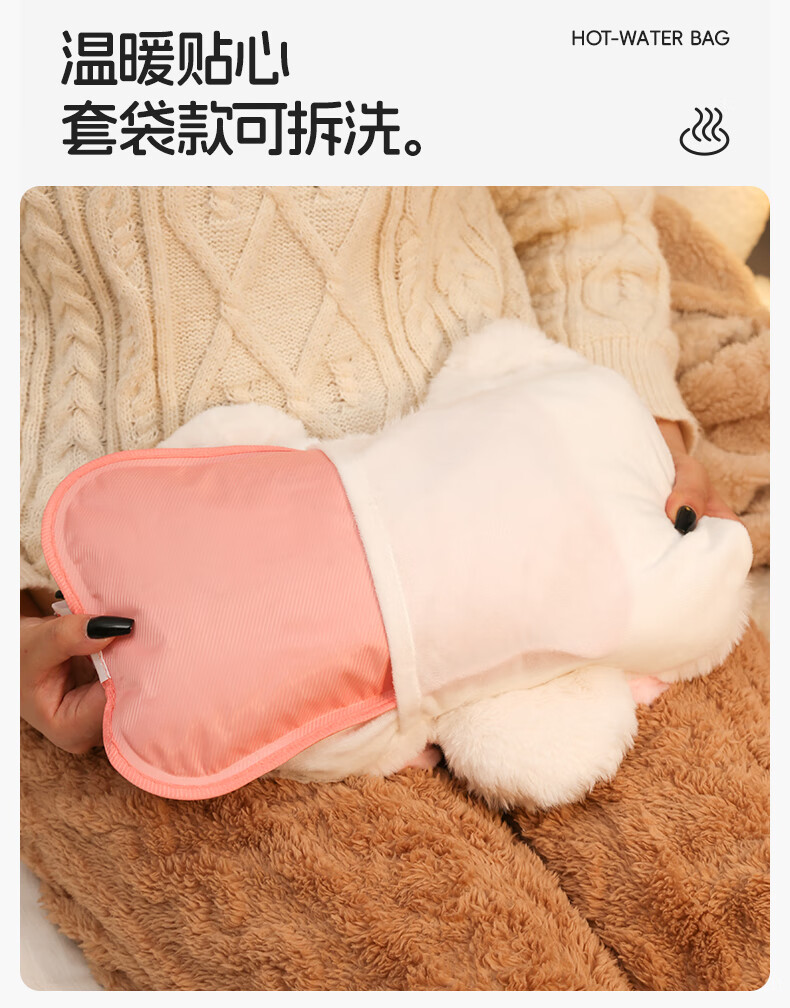 户璃德国儿童长条热水袋注水式加长加厚防爆大容量暖水袋冬天被窝暖脚 【白色小熊】75cm-安全防爆-毛绒套装-可拆洗