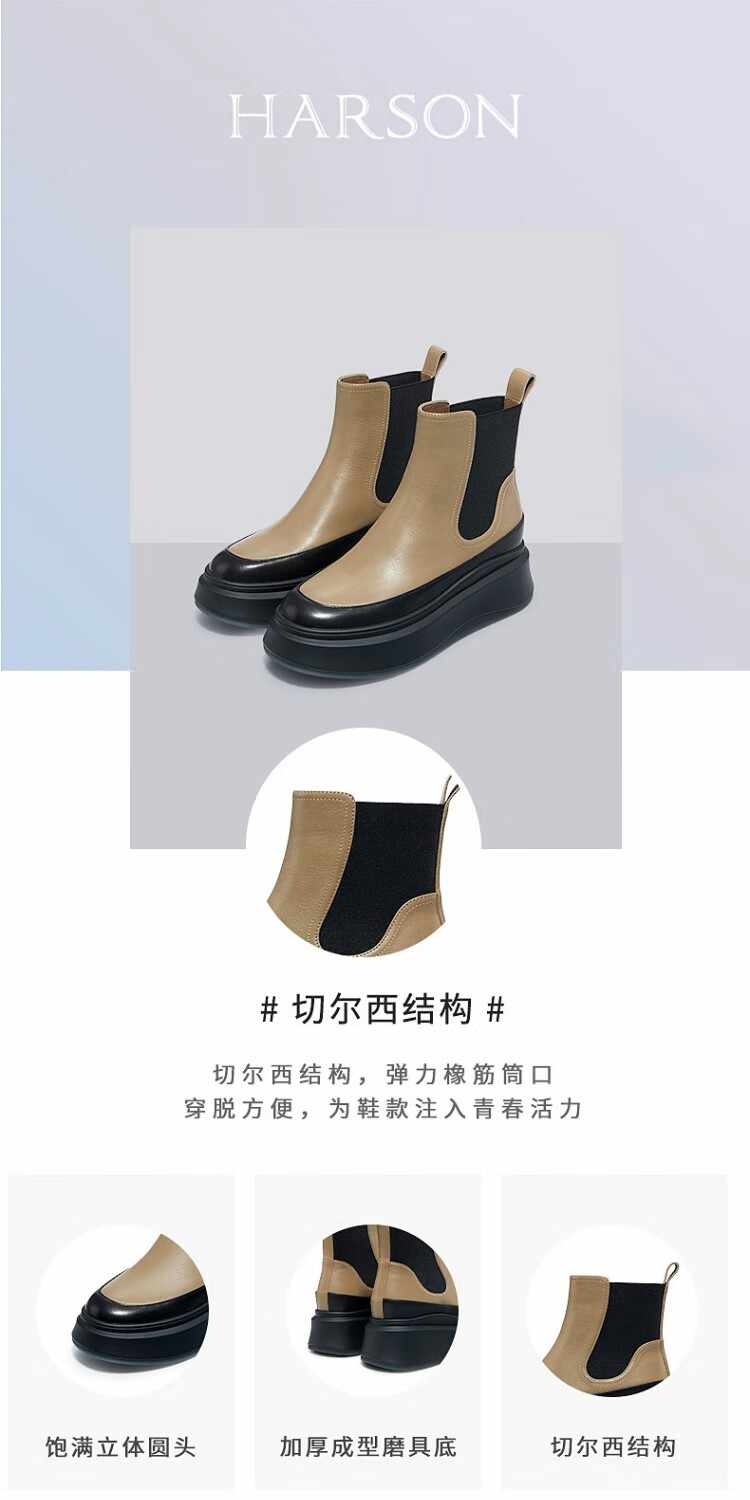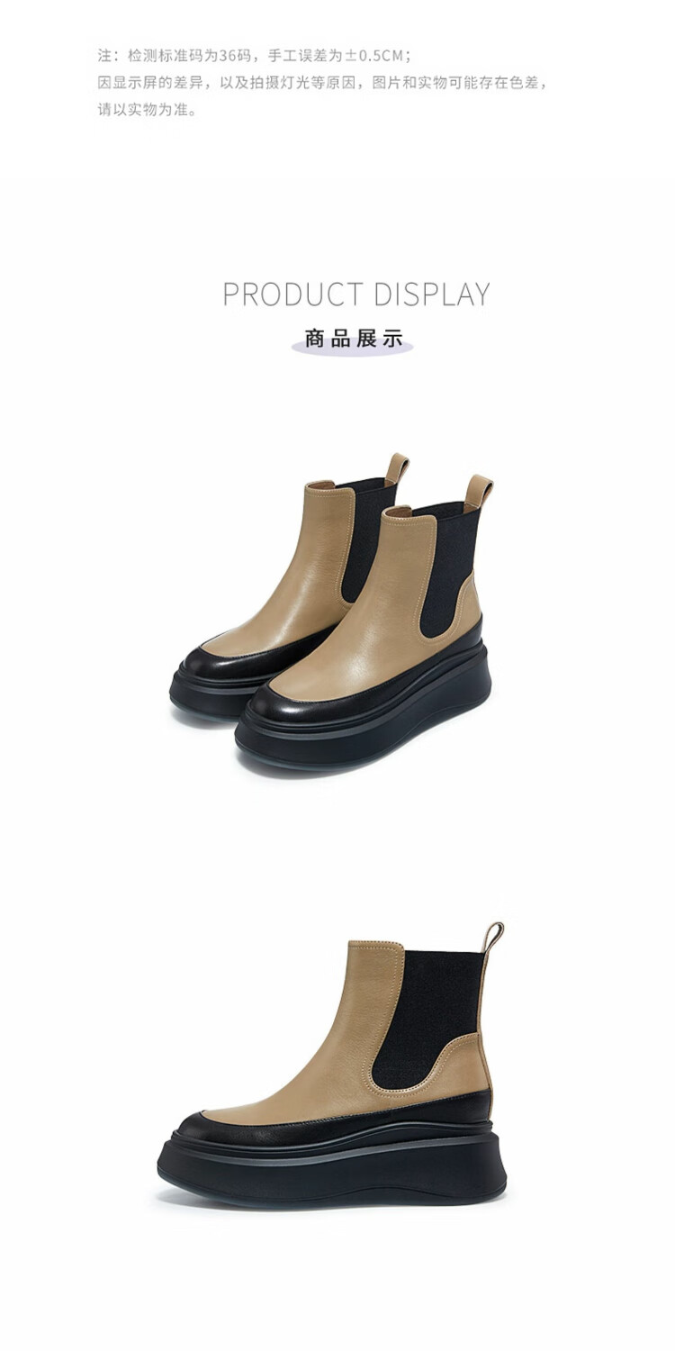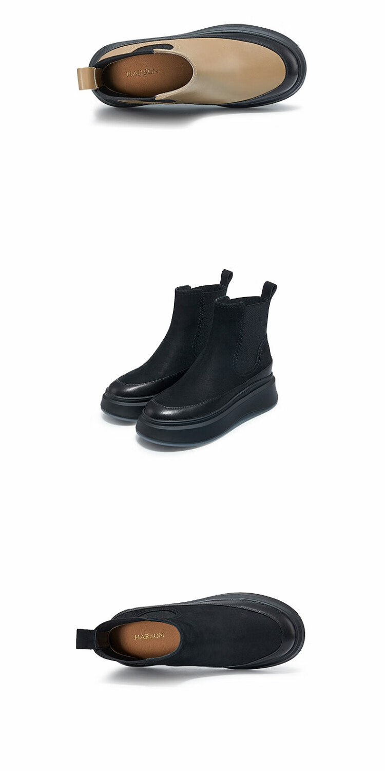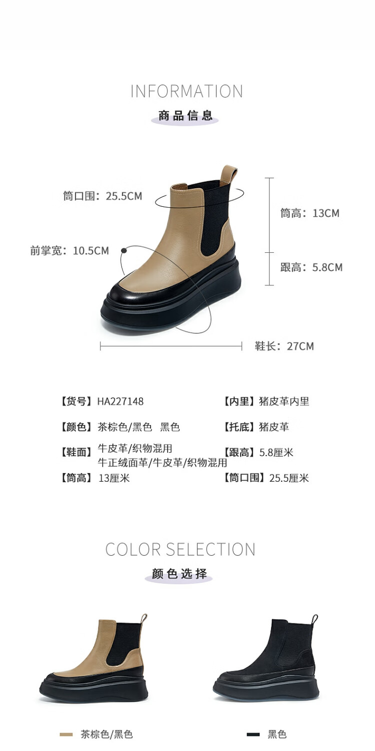 哈森秋冬休闲厚底烟筒靴女士切尔西短靴HA227148 茶色 茶棕色/黑色牛皮革/黑色织物 34