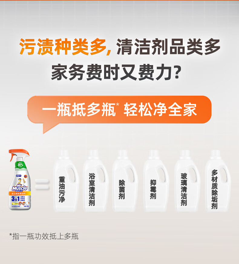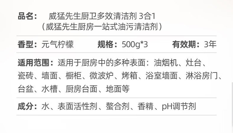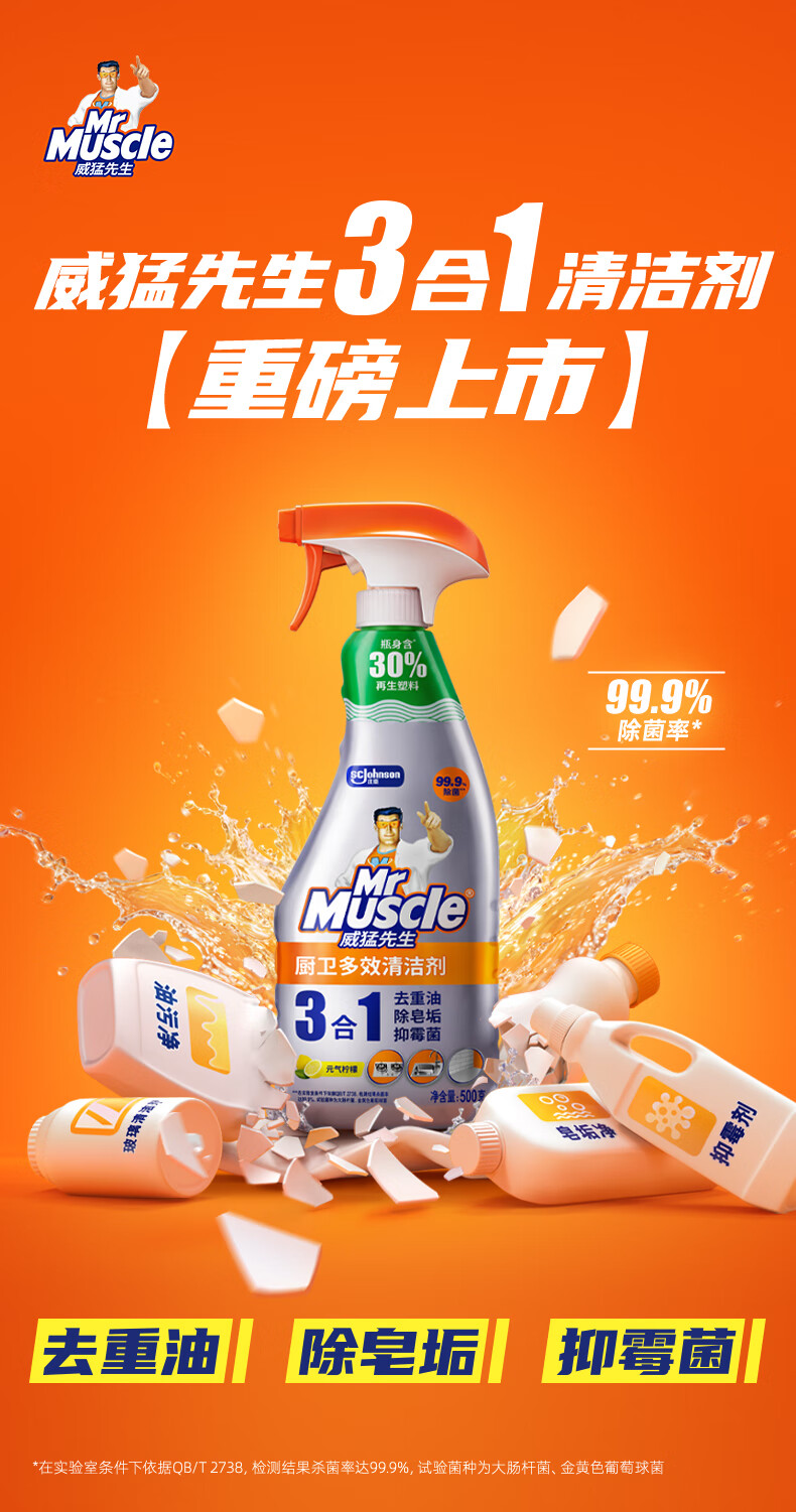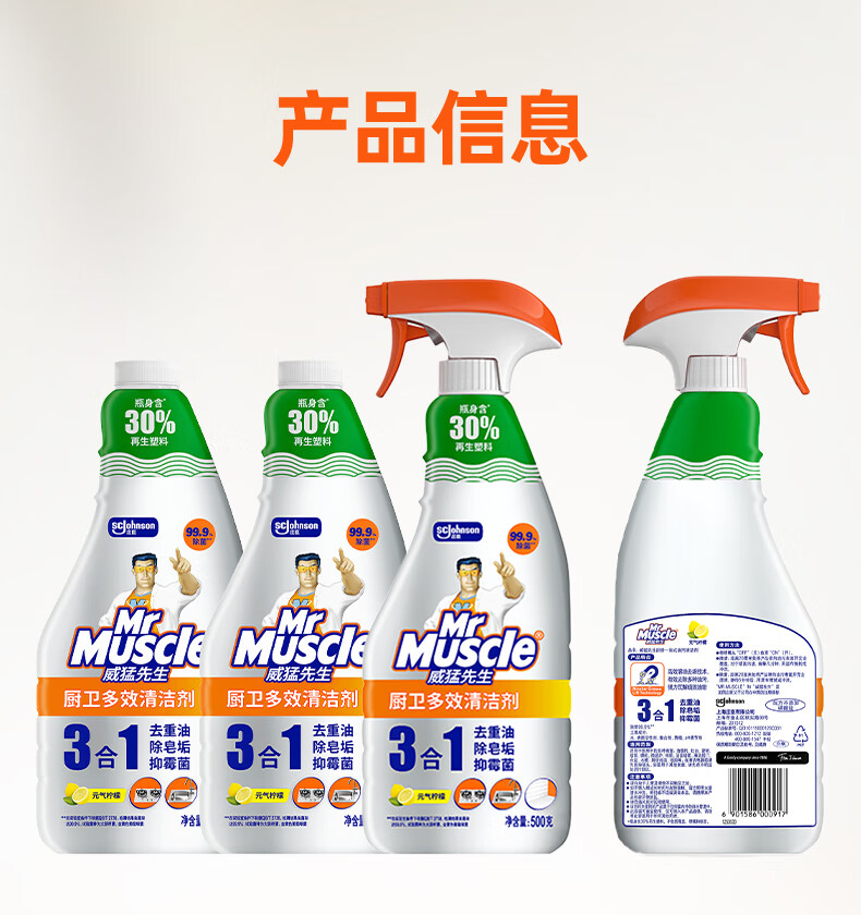 威猛先生(Mr Muscle)厨卫三合一去油污抑霉菌除皂垢多功能清洁剂 500g*3瓶 元气柠檬