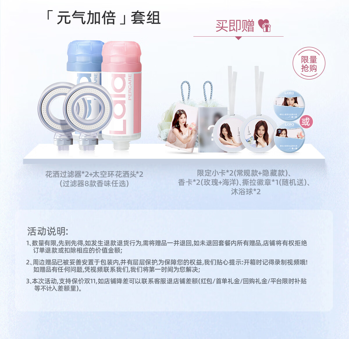 娜拉之夏(LALAPERCARE)袁一琦同款专属「元气加倍」净水养肤香氛过滤除氯花洒套组 「元气加倍」玫瑰滤芯*2+太空环花洒头*2