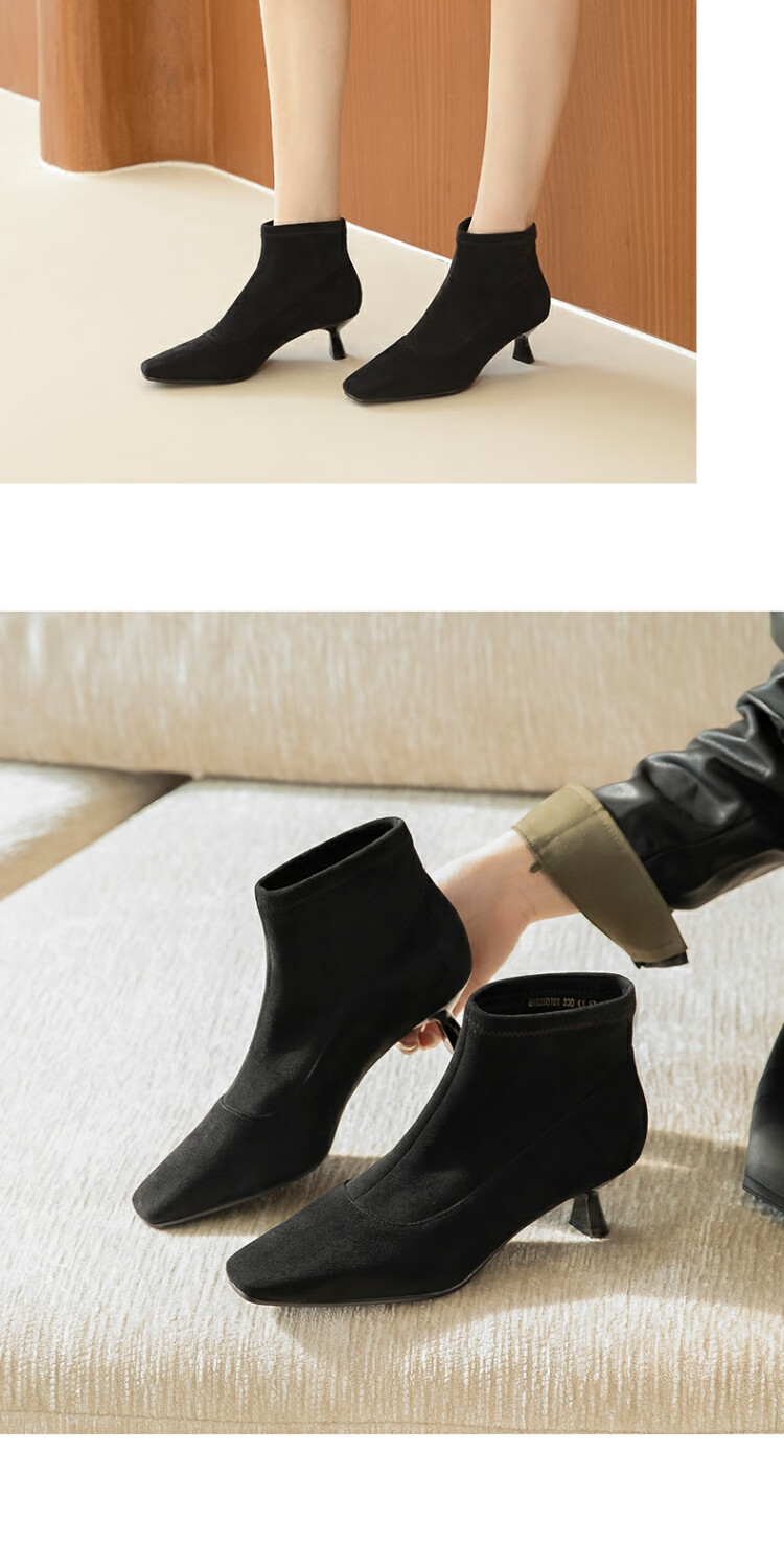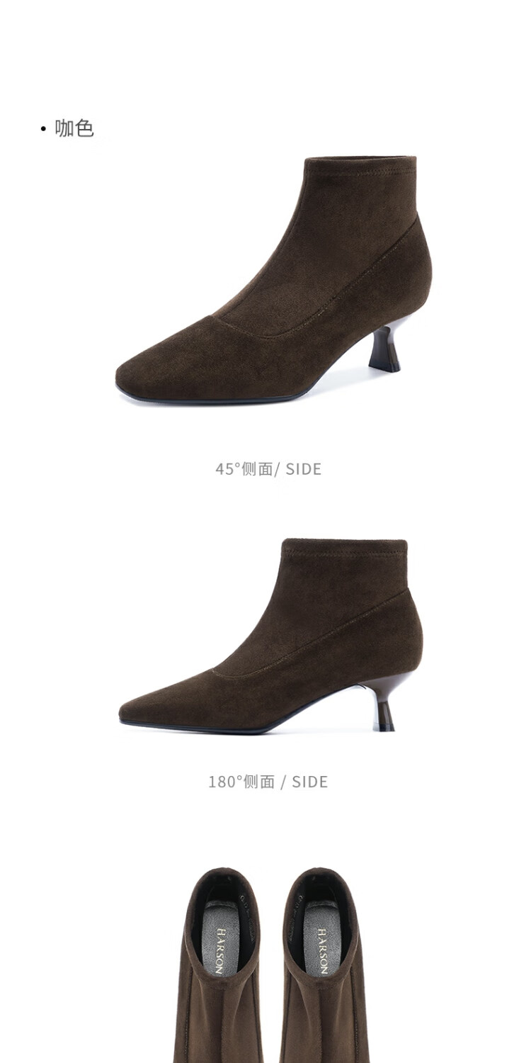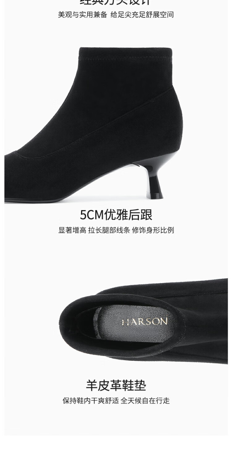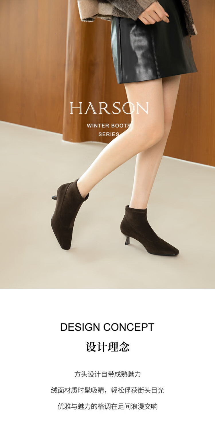 哈森时尚瘦瘦靴女2025冬季新款复古百搭细高跟方头短靴HWA250101 黑色 织物 34