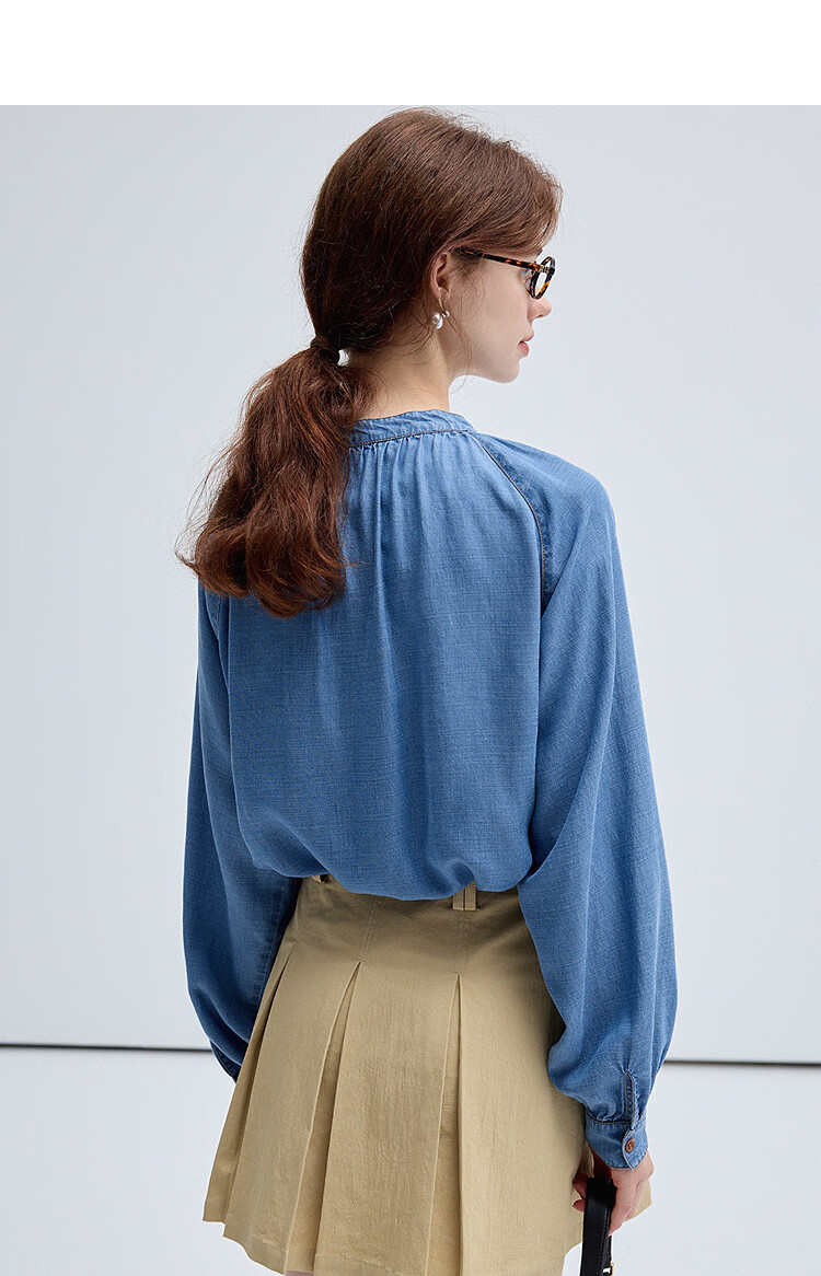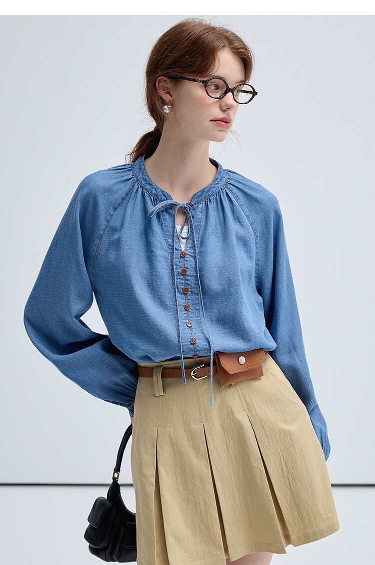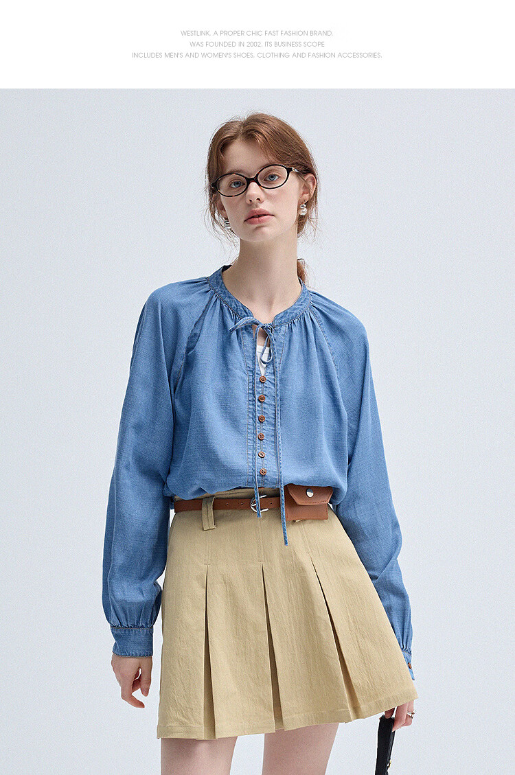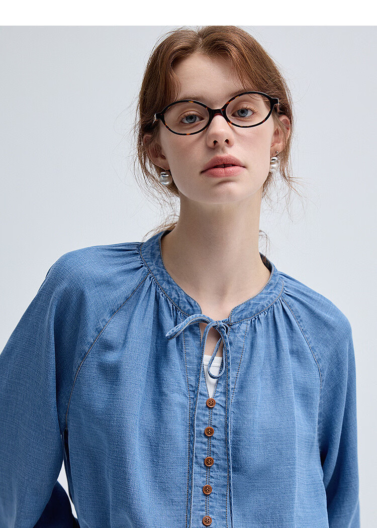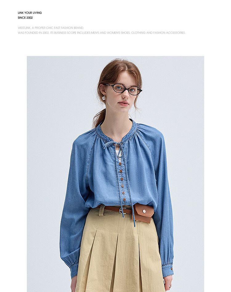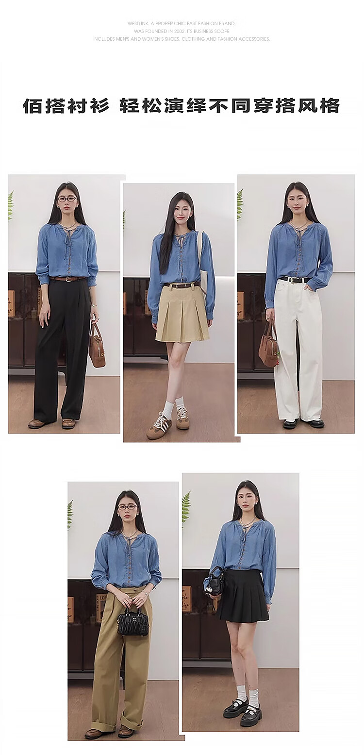 西遇(Westlink)蓝色牛仔衬衫女2025年秋季新款法式复古圆领亚麻宽松长袖衬衣 蓝色 (预售15天) S (155)
