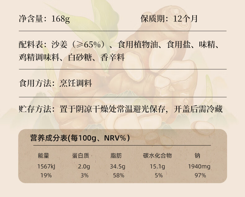 珍星鲜沙姜酱家用调料猪肚广东白切鸡沙姜猪手蘸料姜泥调味料 沙姜酱168克*1瓶