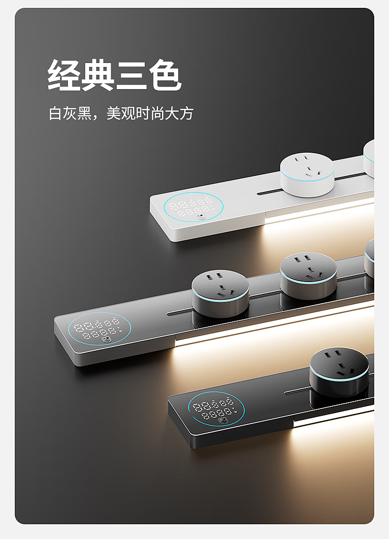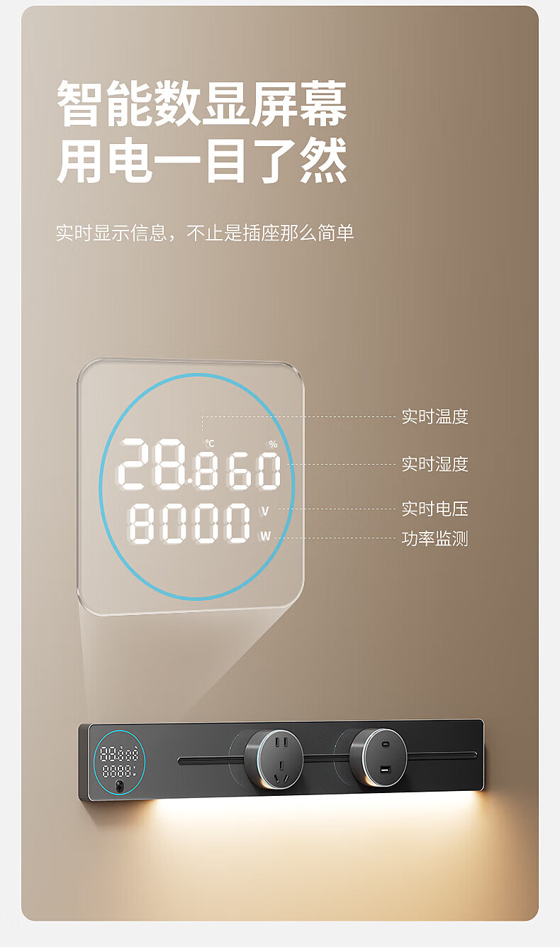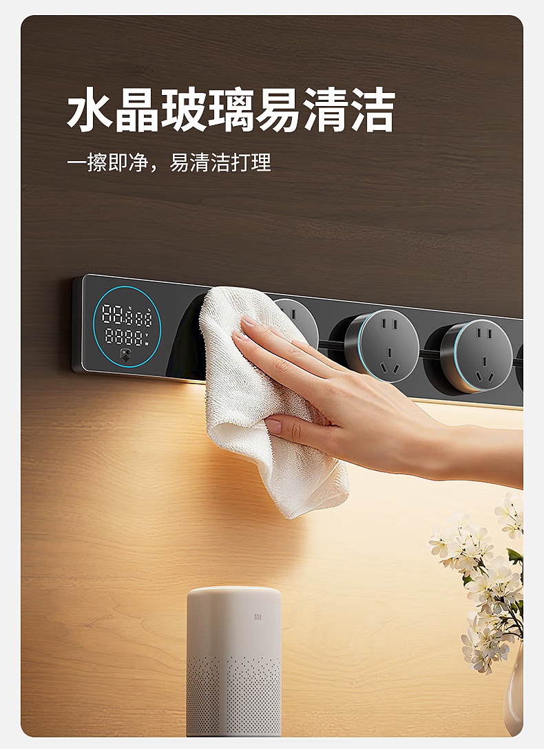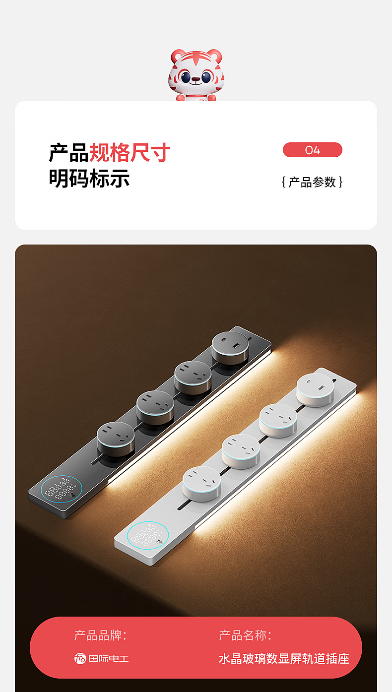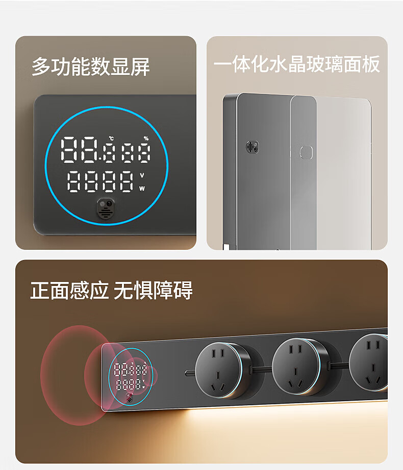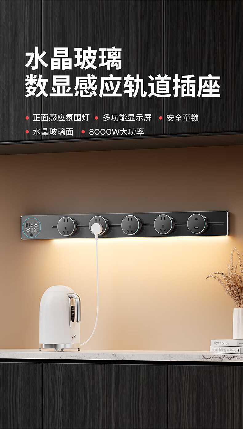 国际电工智能显示屏玻璃镜面轨道插座家用厨房餐边柜移动带灯数显滑动插排 【水晶玻璃数显屏】灰色50cm+3个大五孔