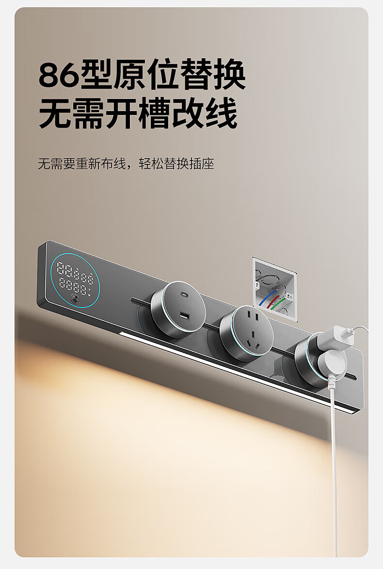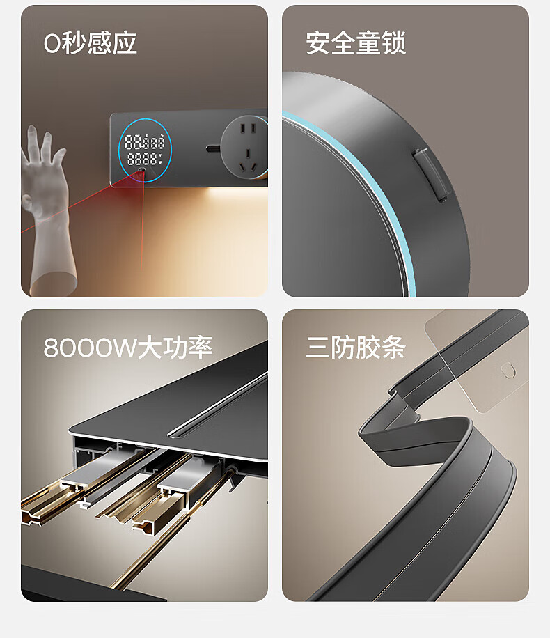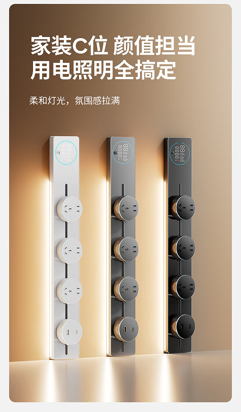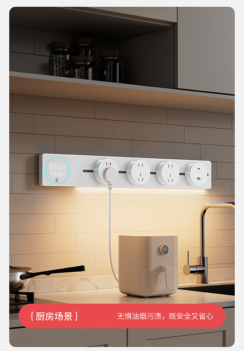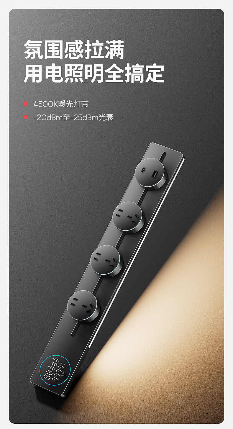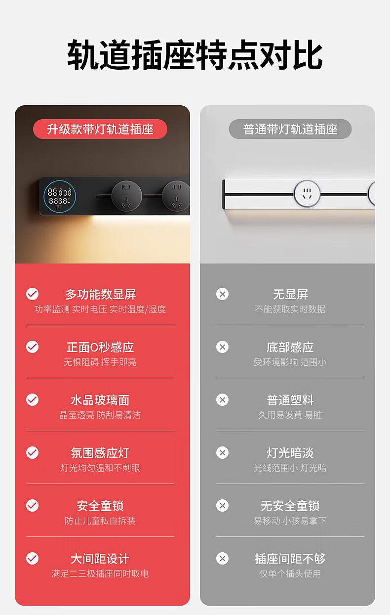 国际电工智能显示屏玻璃镜面轨道插座家用厨房餐边柜移动带灯数显滑动插排 【水晶玻璃数显屏】灰色50cm+3个大五孔