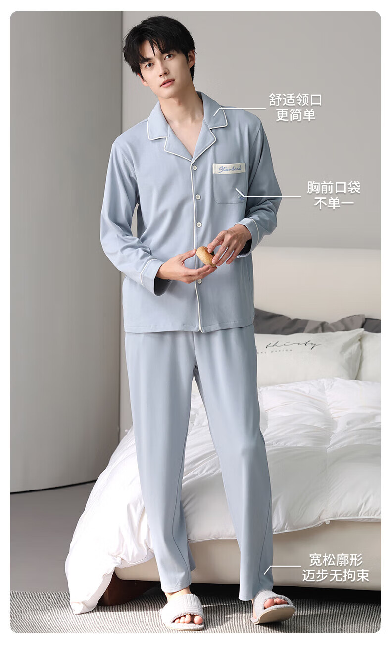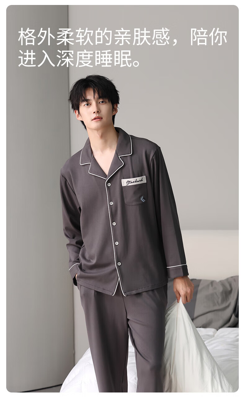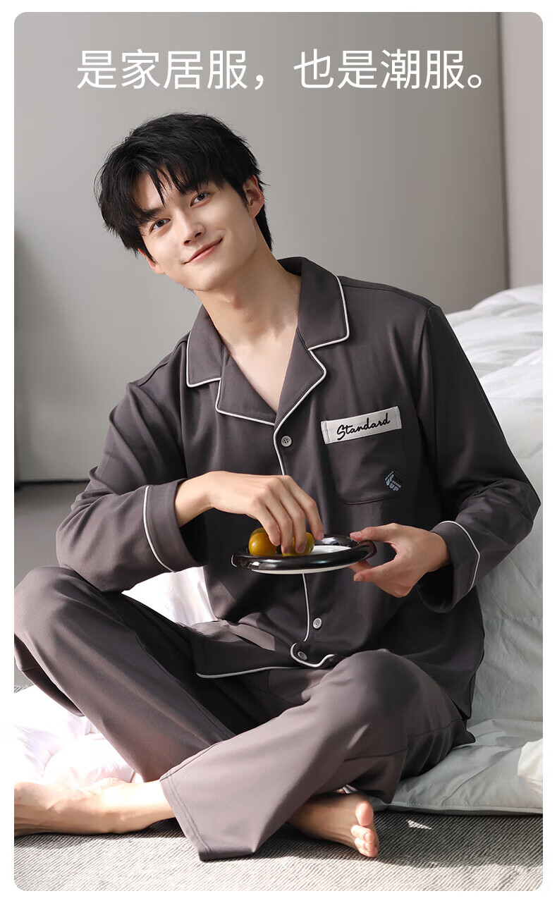 芬腾睡衣男纯棉2025秋新款简约纯色翻领休闲外穿长袖家居服套装 深灰 2XL