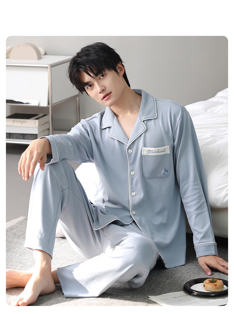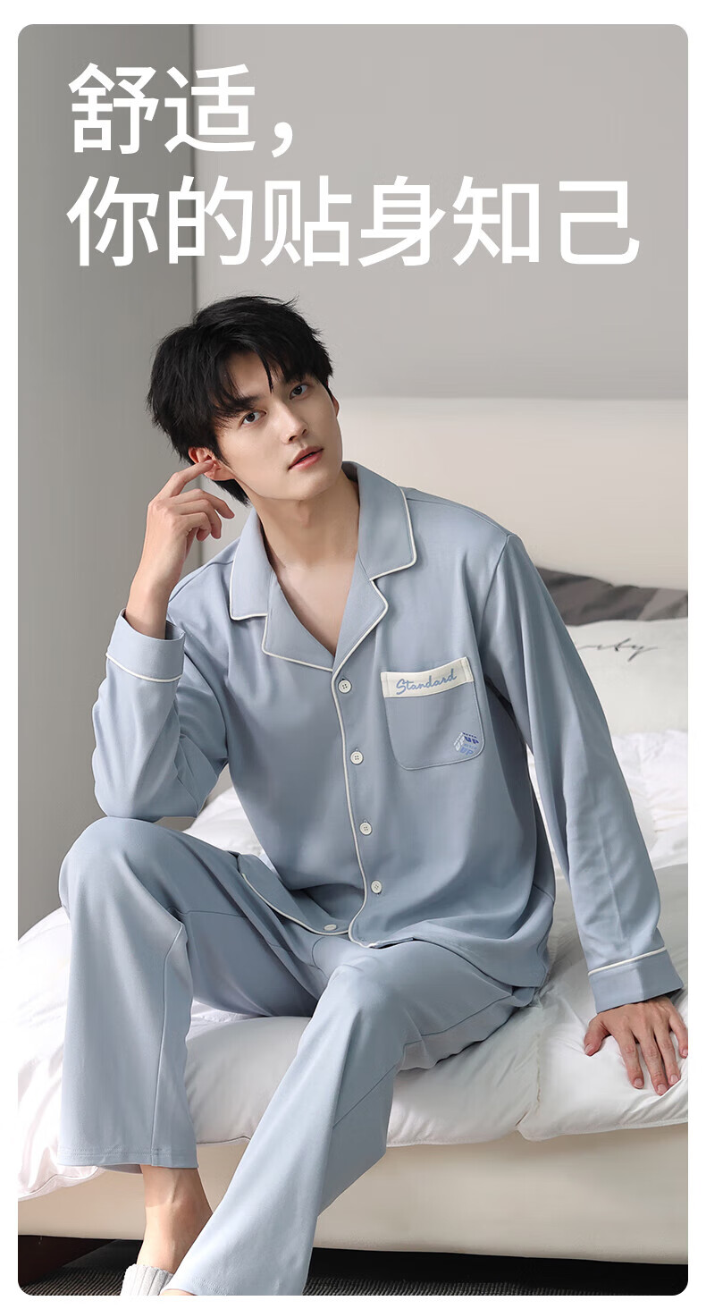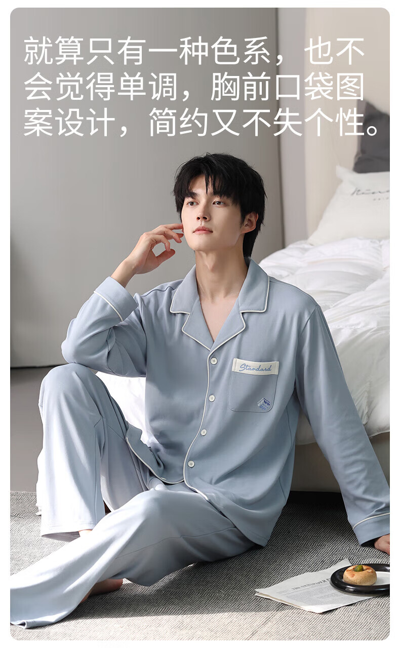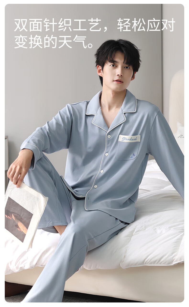 芬腾睡衣男纯棉2025秋新款简约纯色翻领休闲外穿长袖家居服套装 深灰 2XL