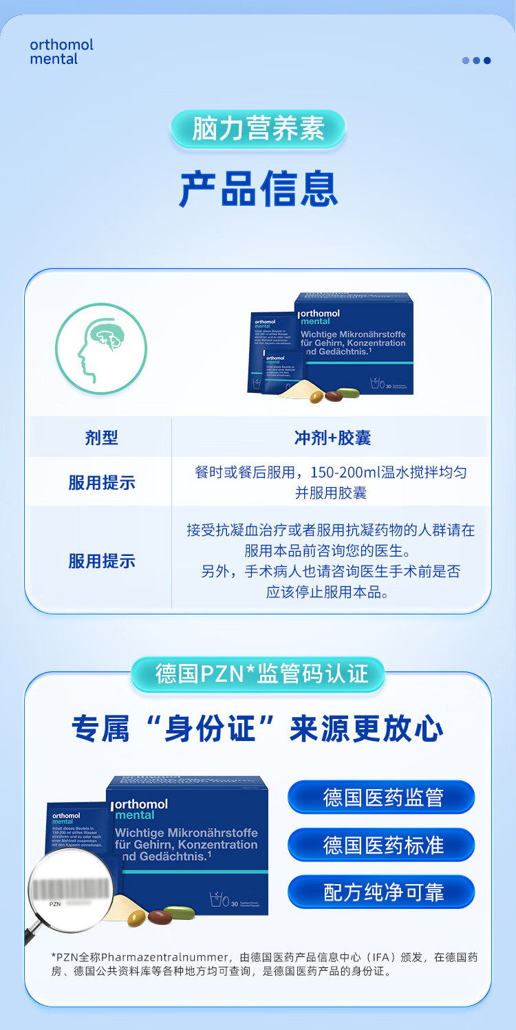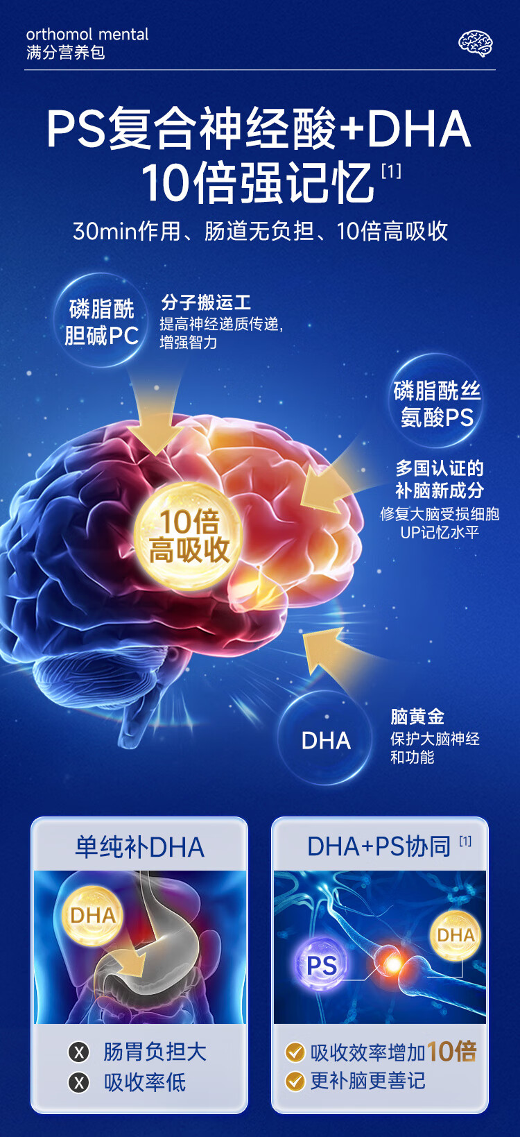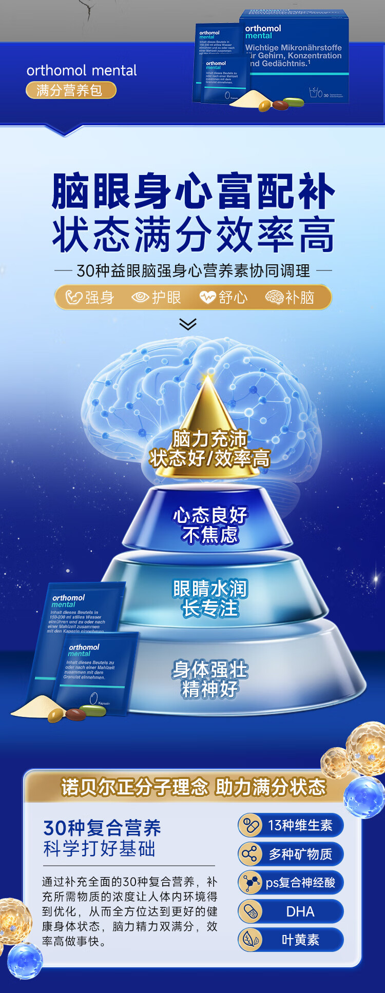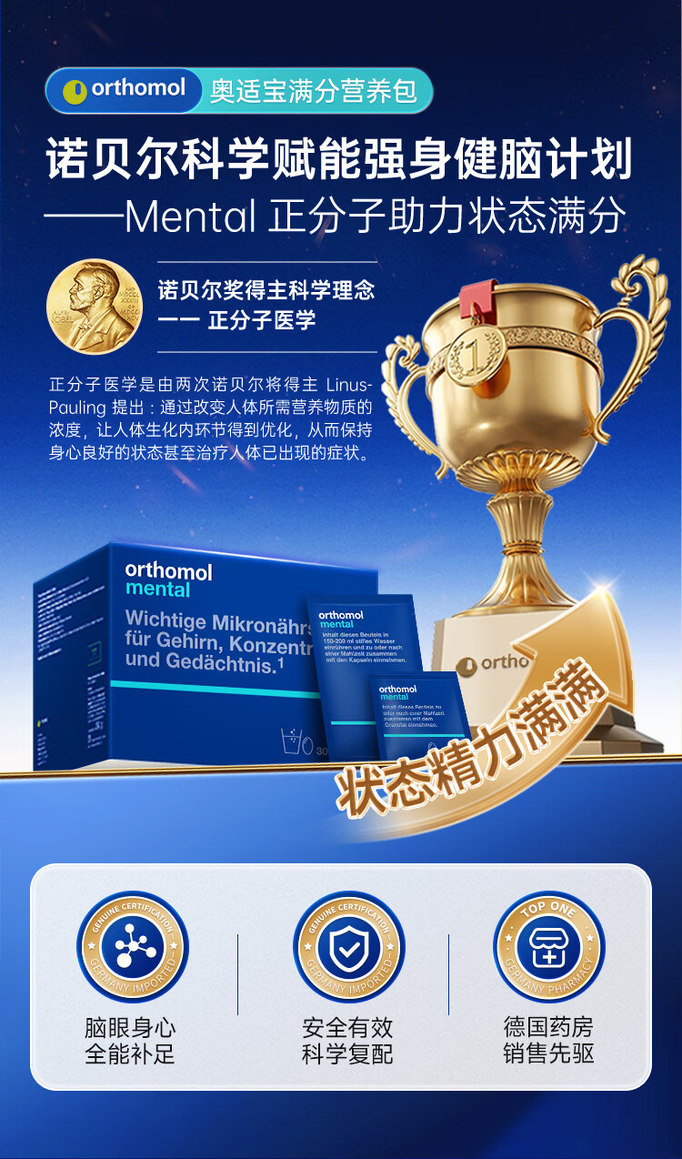 奥适宝(ORTHOMOL)神经酸补脑DHA增强大脑营养mental满分营养包30天 记忆力备考考研