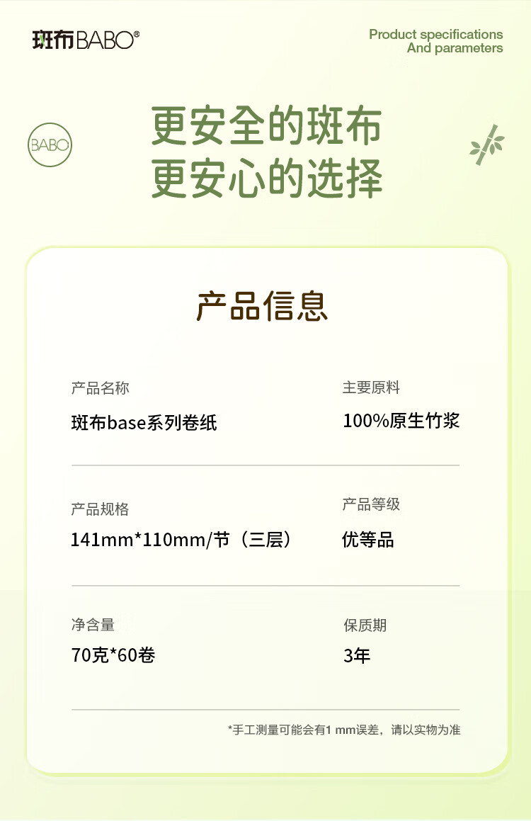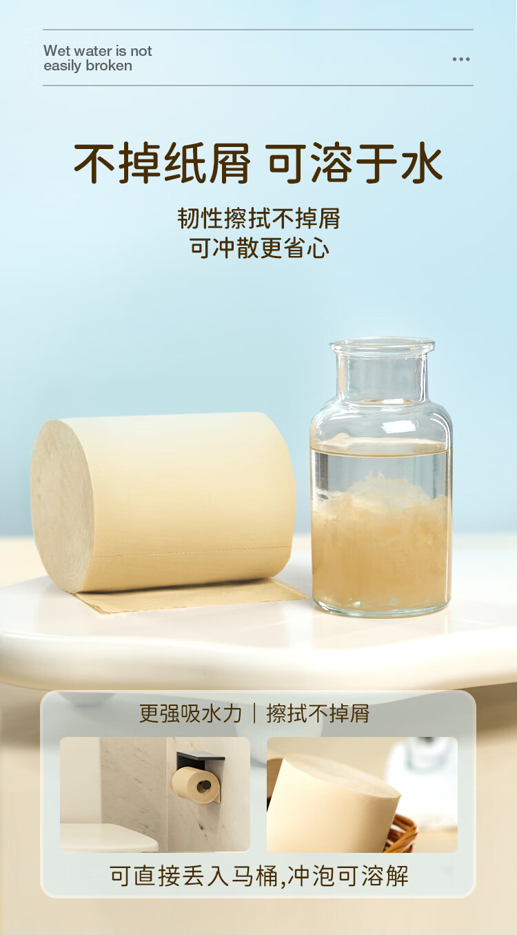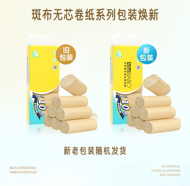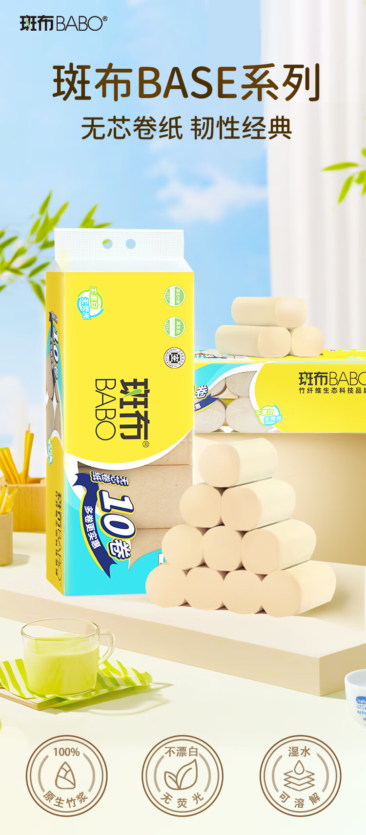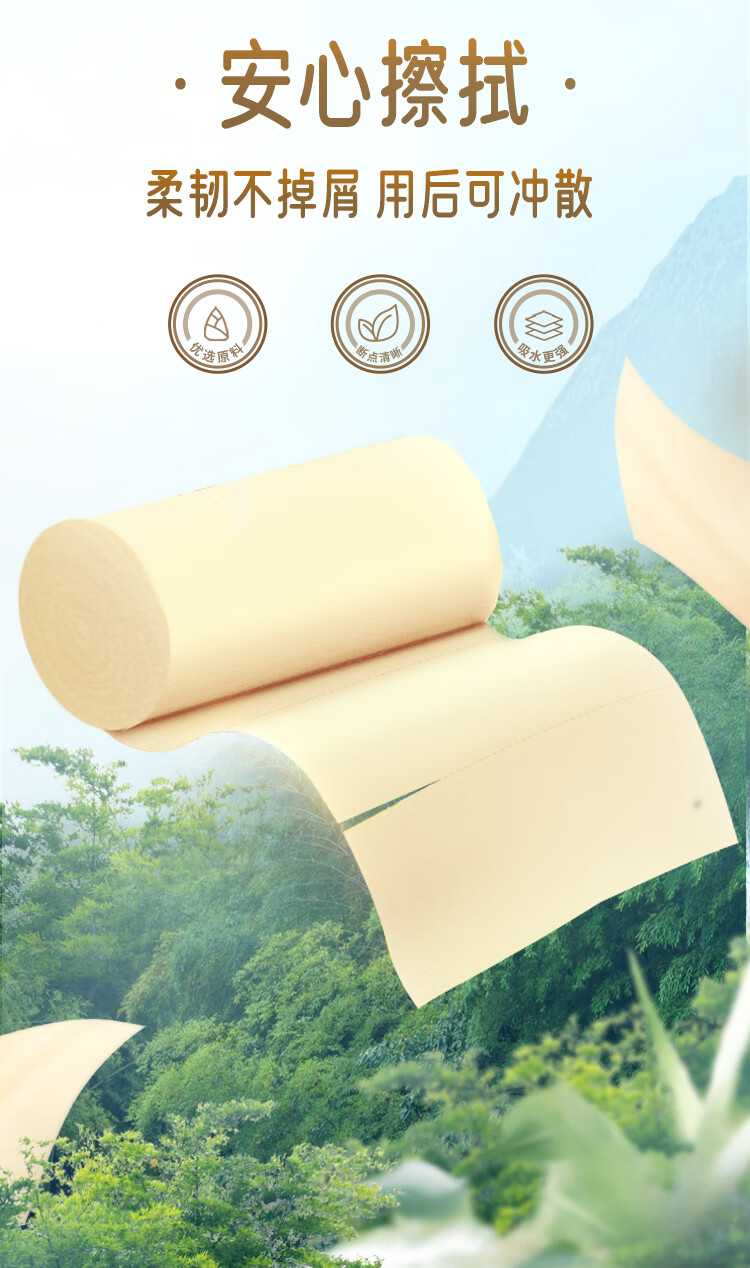 斑布无芯卷纸 厕所卷纸 141*110mm 竹浆本色纸 纸巾无芯卷纸 3层 70g/卷*60卷