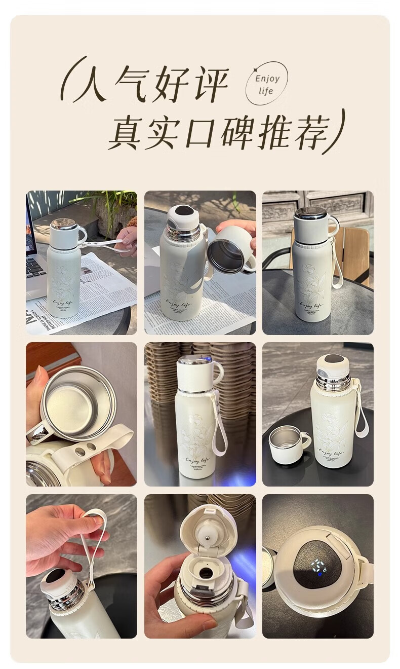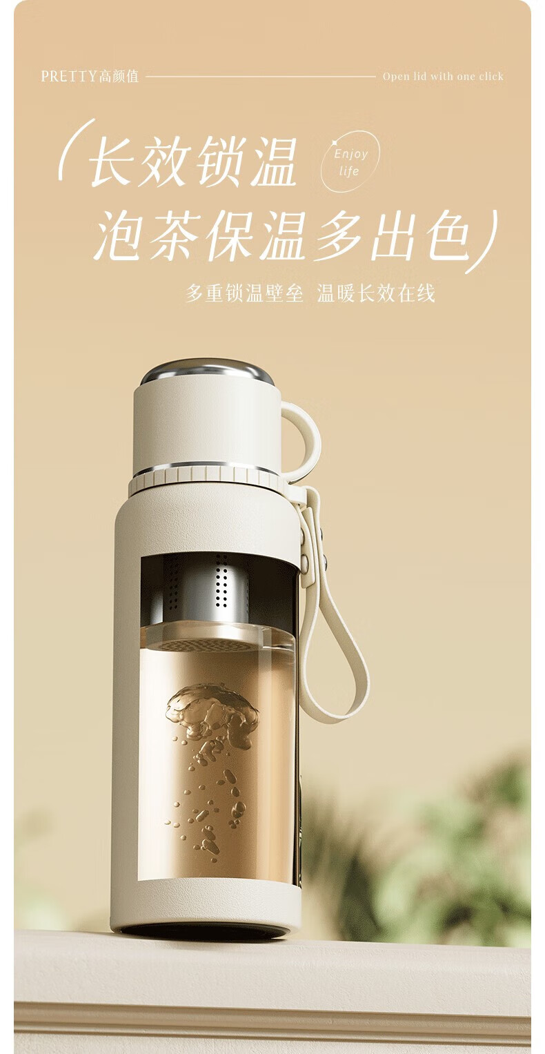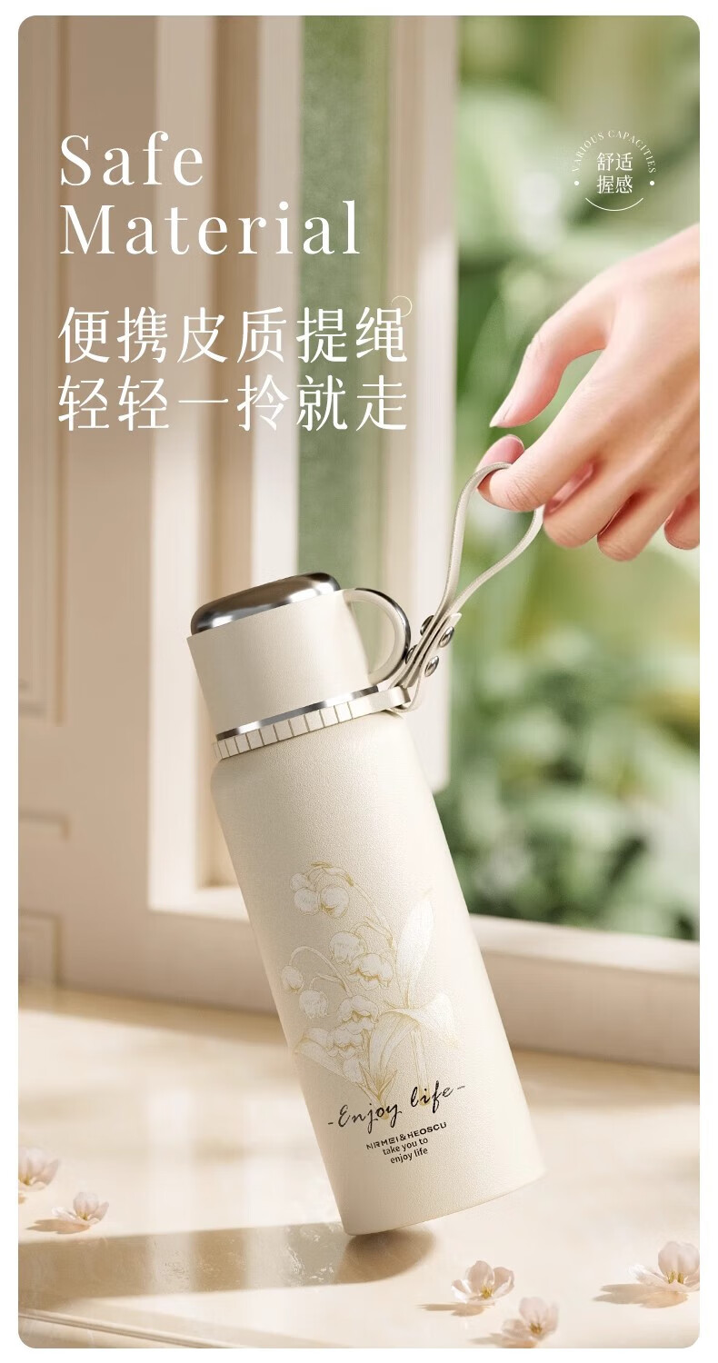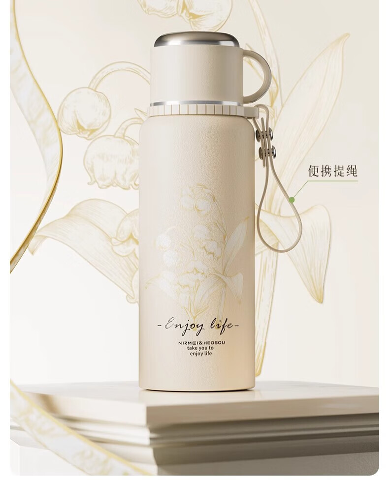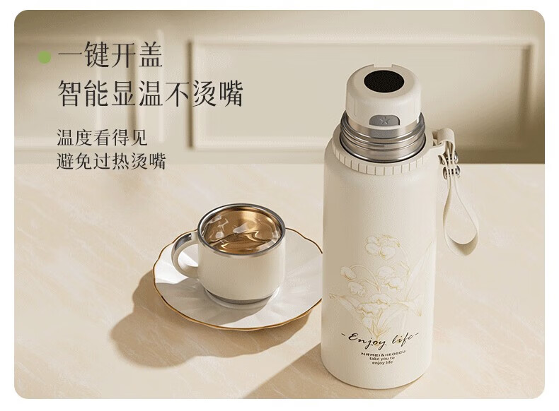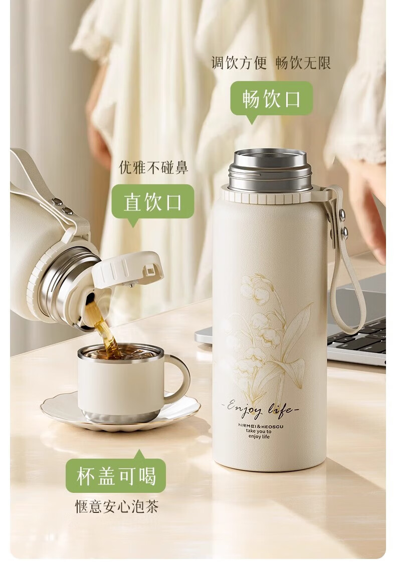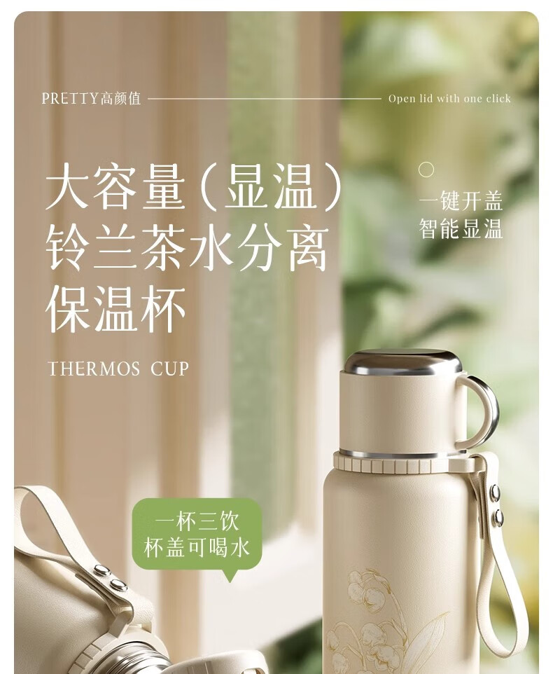 DEATKN德国高端316保温杯女生款高颜值茶水分离大号保温壶大容量男生 铃兰花[智能显温/316不锈 600ml