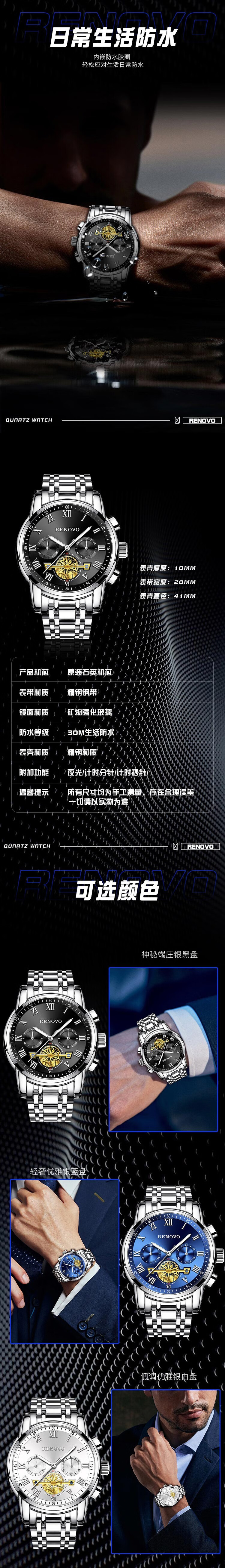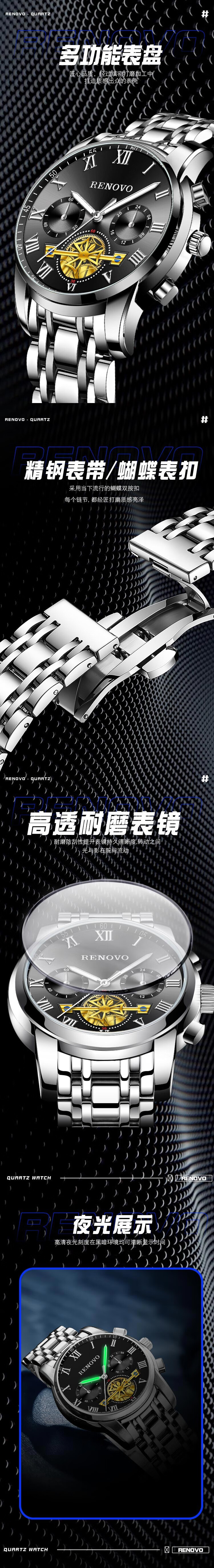 RENOVO手表男双机芯表男士手表全自动多功能夜光防水德国认证品牌男表
