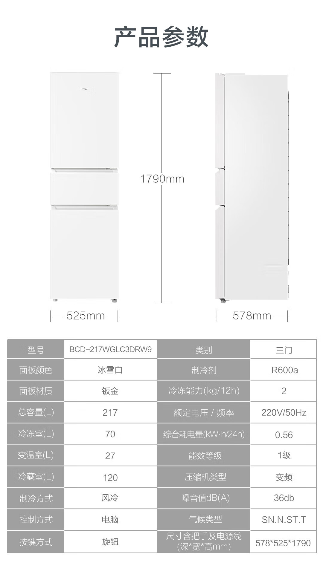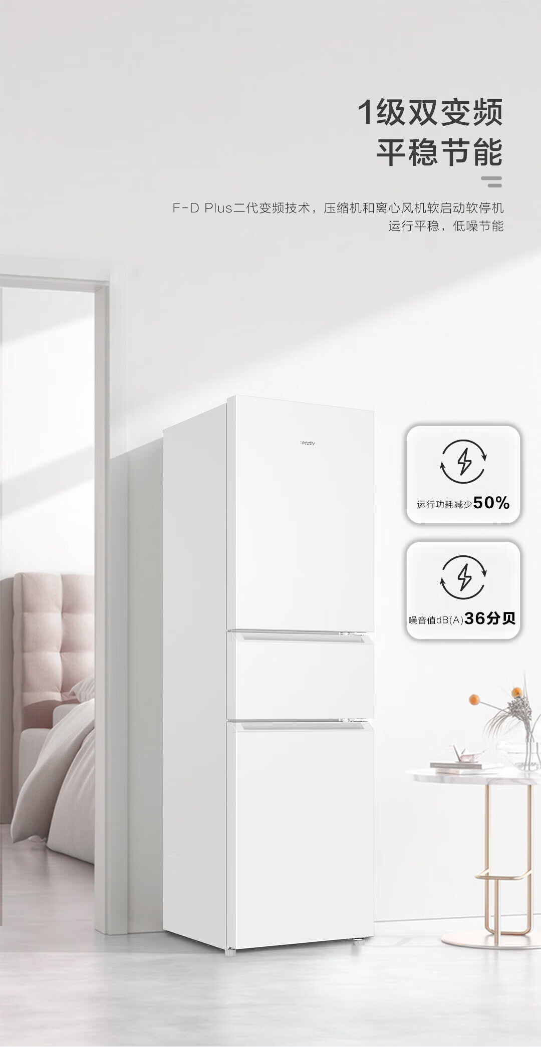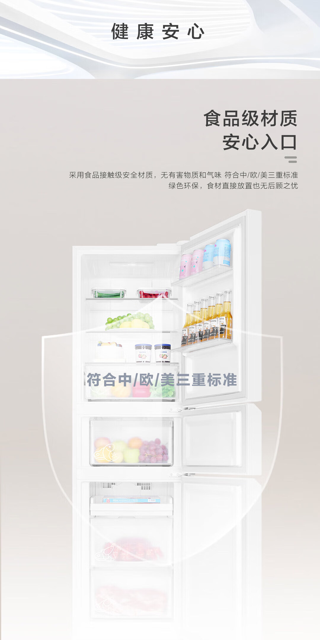 统帅(Leader)海尔冰箱出品217升三开门冰箱风冷无霜一级双变频黑金净化家用租房电冰箱BCD-217WGLC3DRW9 白色