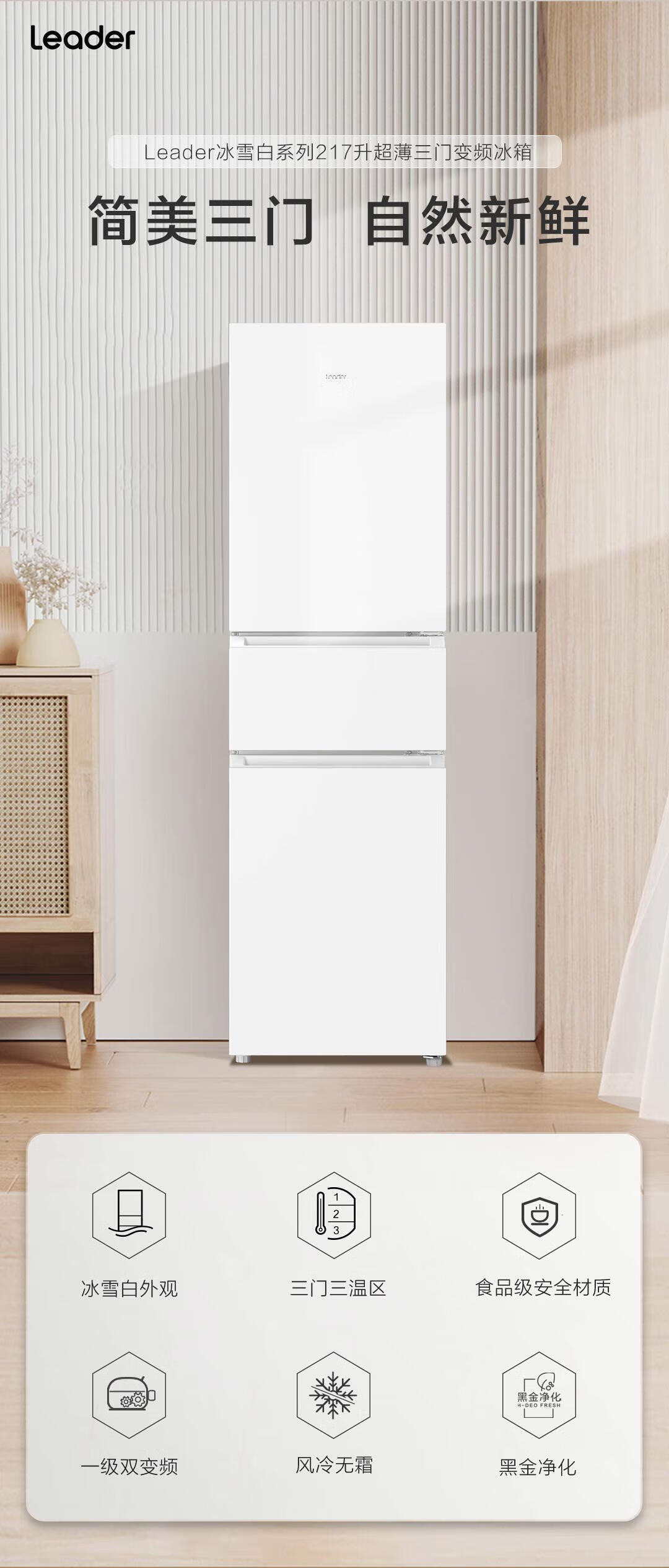 统帅(Leader)海尔出品三门三温三开门家用电冰箱218升 一级双变频风冷无霜黑金净化宿舍租房办公室国家补贴20% 【省电王】2天仅约1度电 冰箱