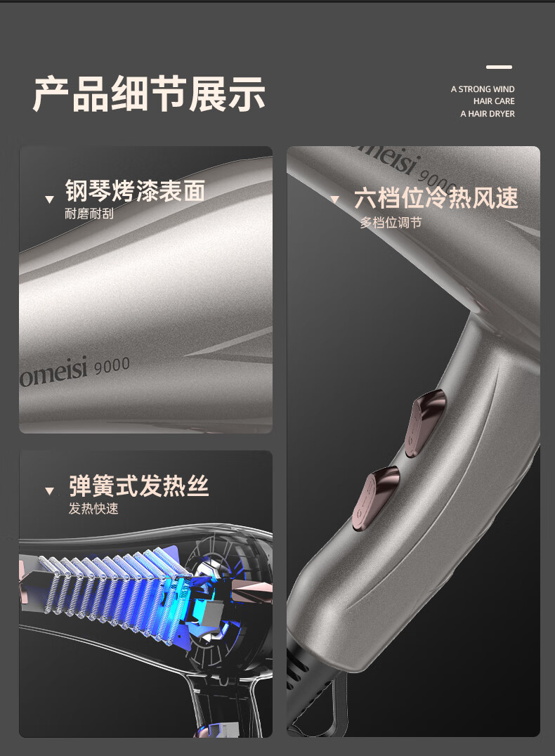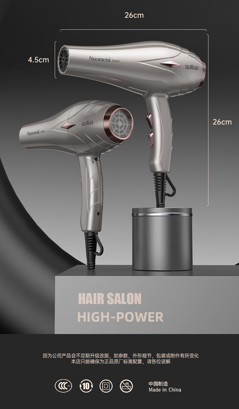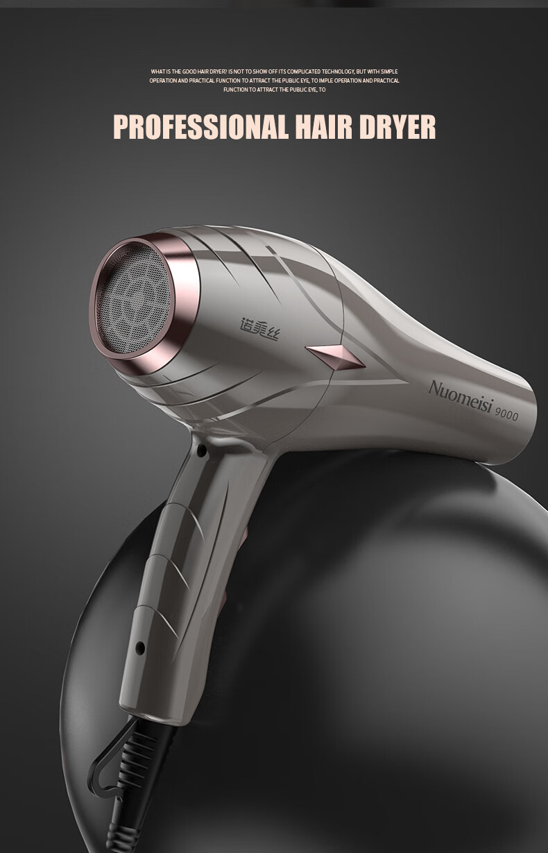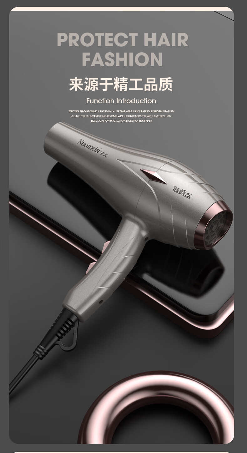 诺美丝电吹风机大功率负离子速干发廊理发店专用不伤发家用吹风筒护发 【灰金款9000大风力】3米线+6